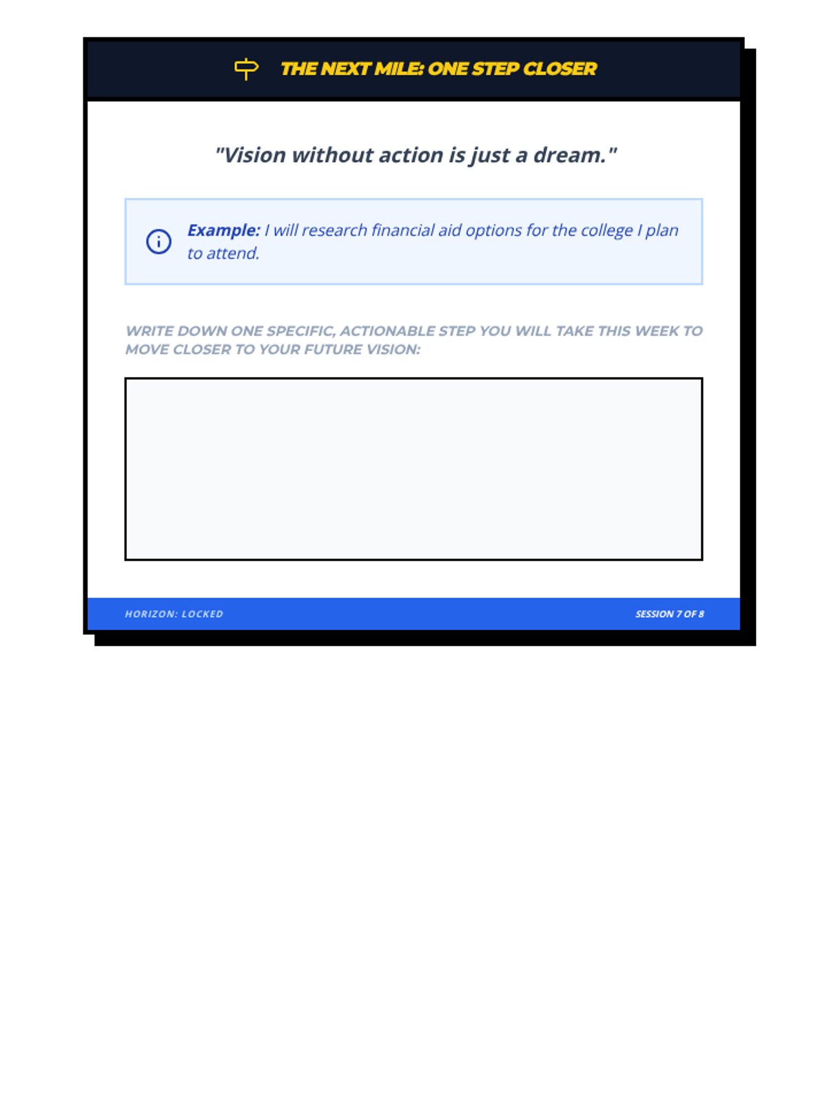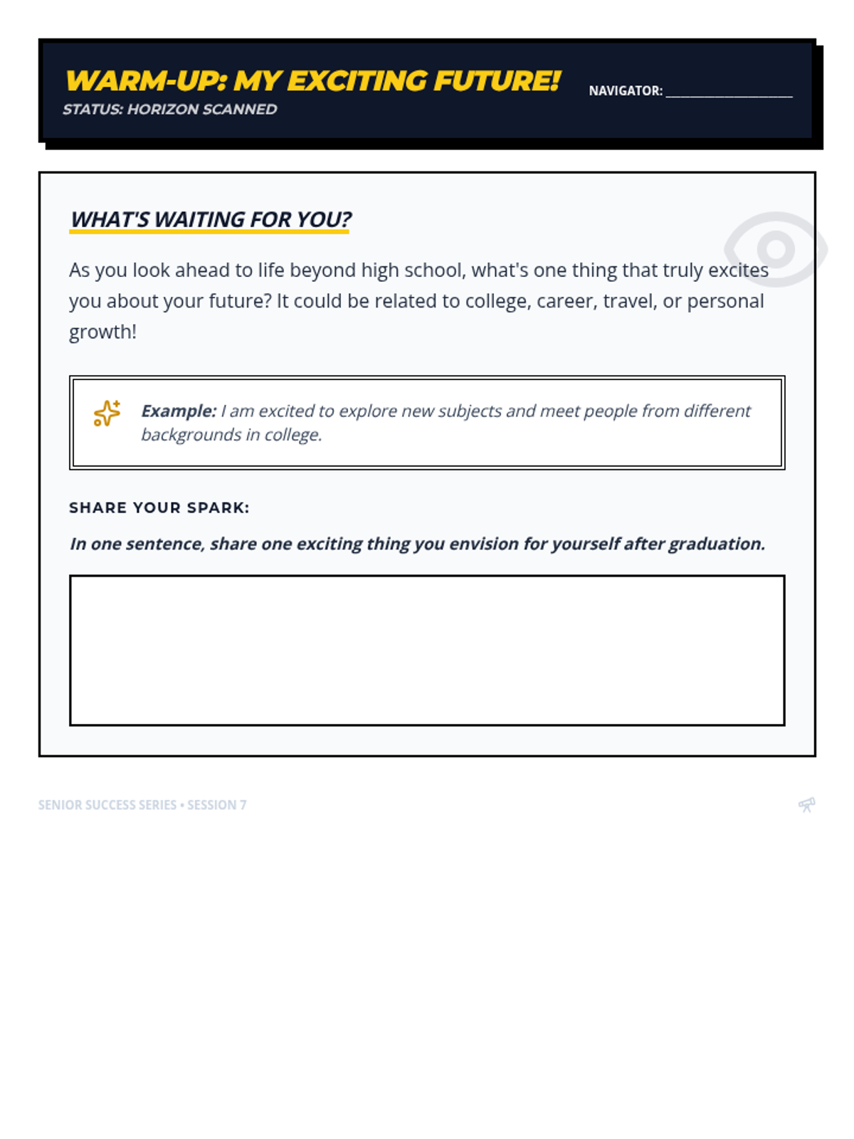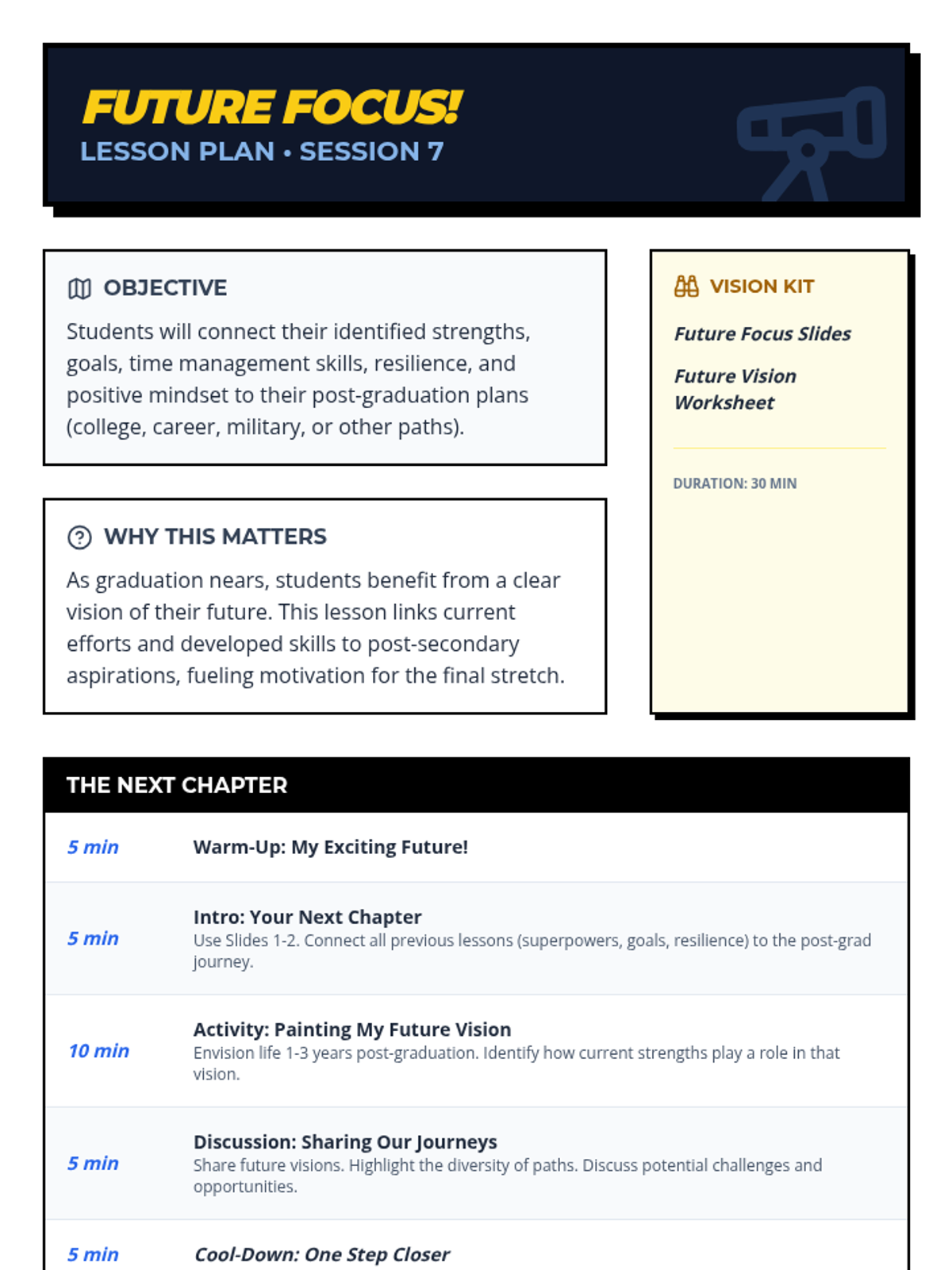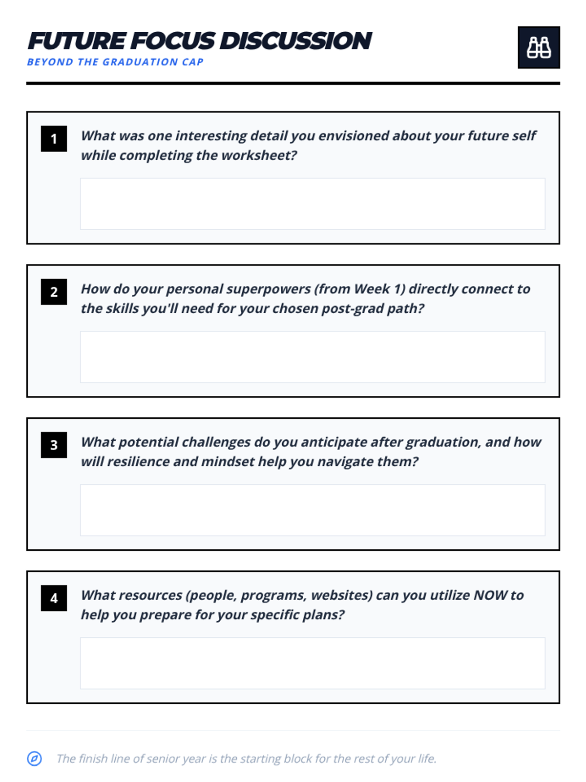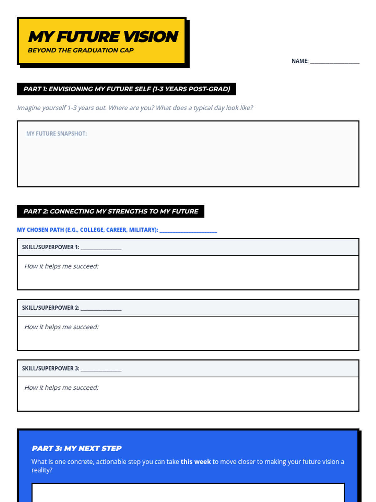 Students will connect their identified strengths, goals, time management skills, resilience, and positive mindset to their post-graduation plans (college, career, military, gap year).