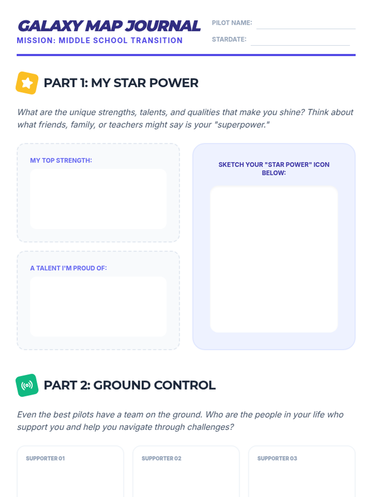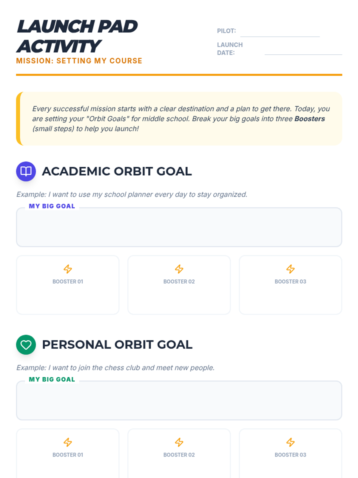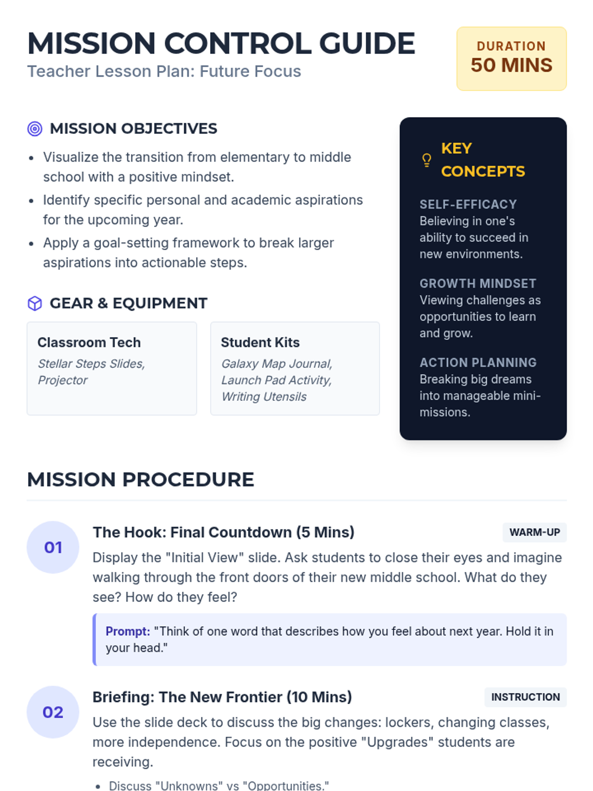 A transition and goal-setting lesson for 5th graders to prepare for middle school. Students will visualize their future, identify personal aspirations, and create a concrete action plan using a simple goal-setting framework.