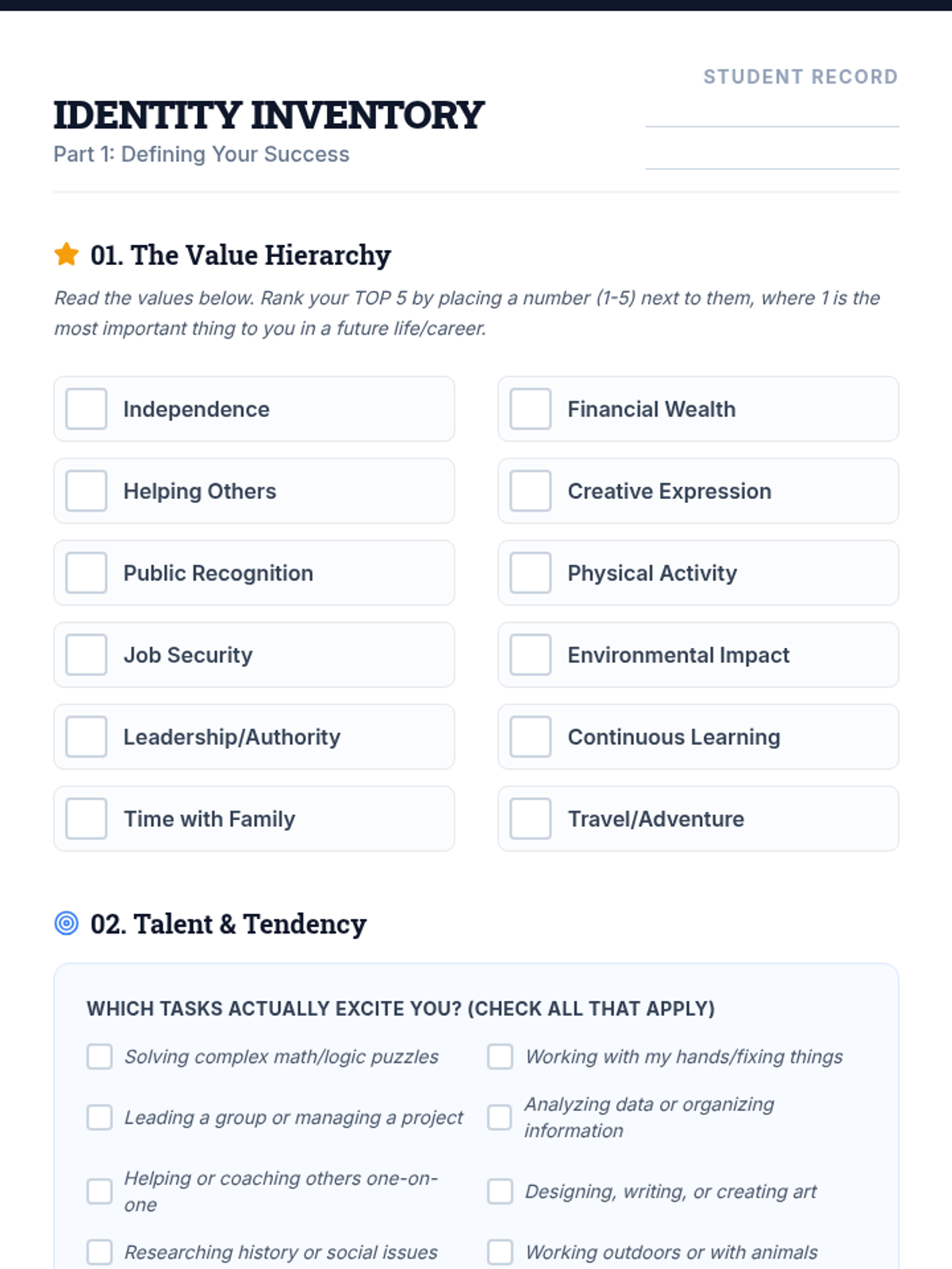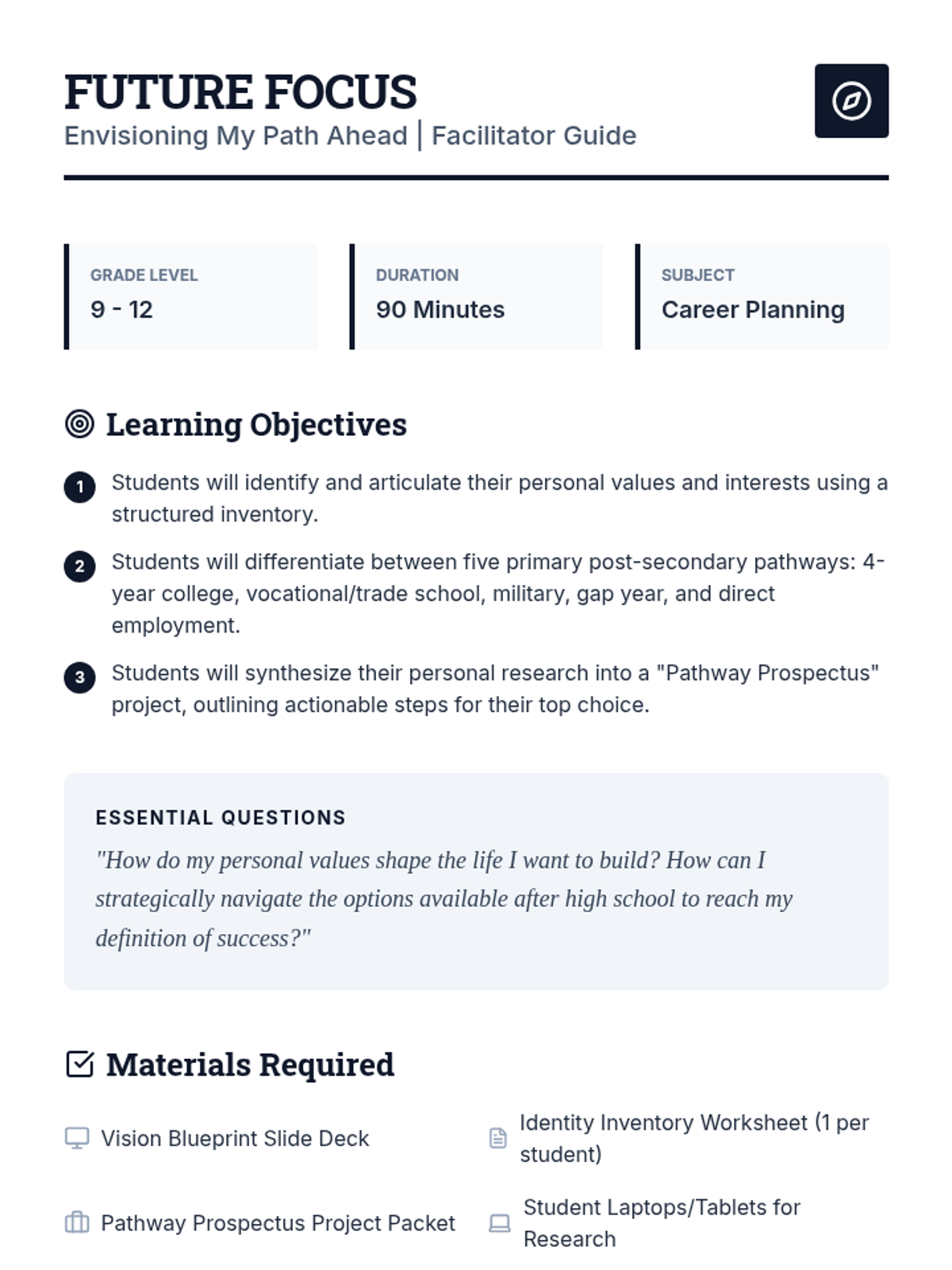A comprehensive lesson for high schoolers to explore post-secondary pathways, align their personal values with career goals, and create an actionable future blueprint.