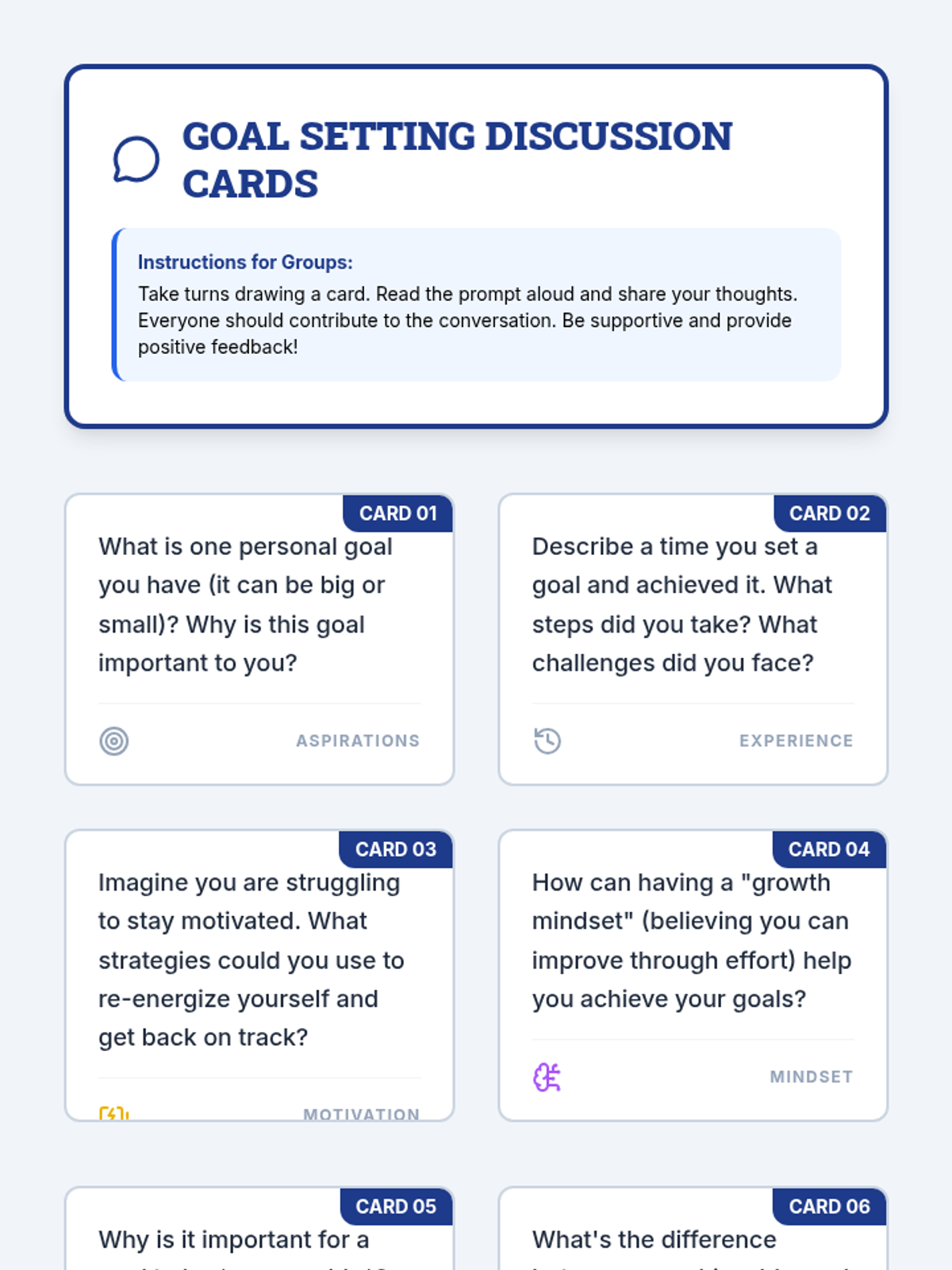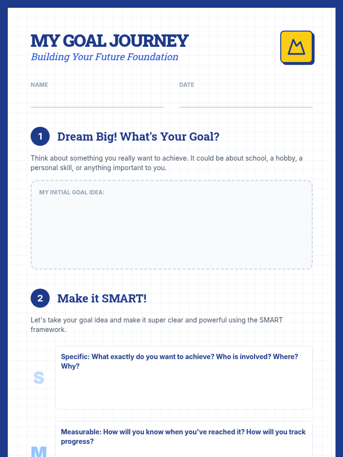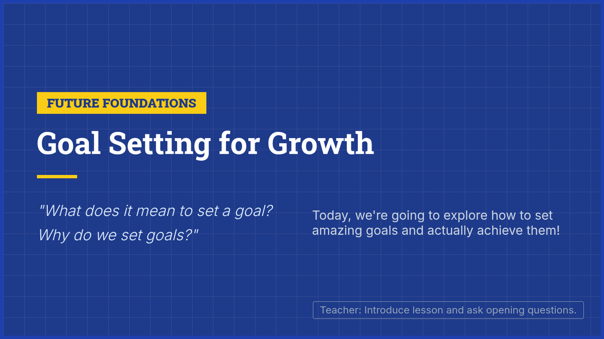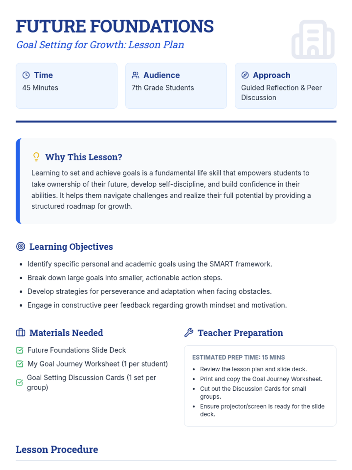 A 45-minute lesson for 7th-grade students focused on setting SMART goals, breaking them down into actionable steps, and building resilience to achieve personal and academic aspirations.
