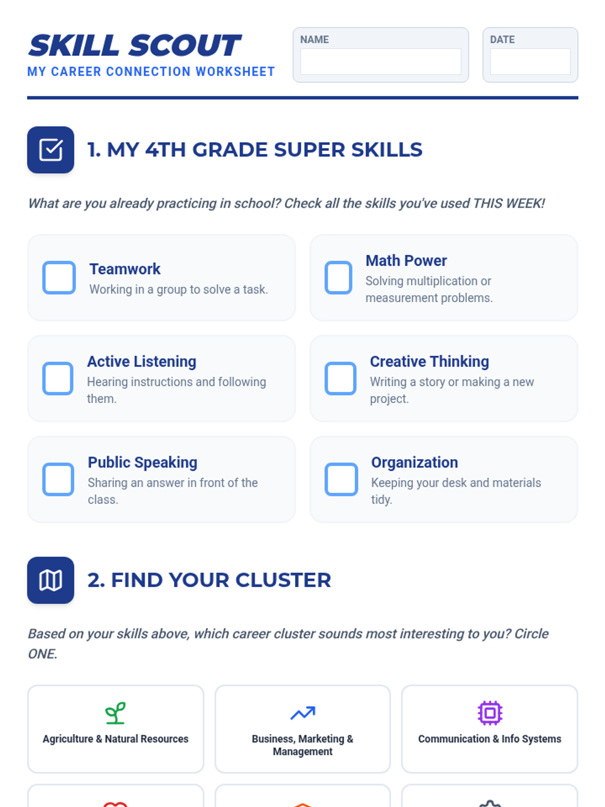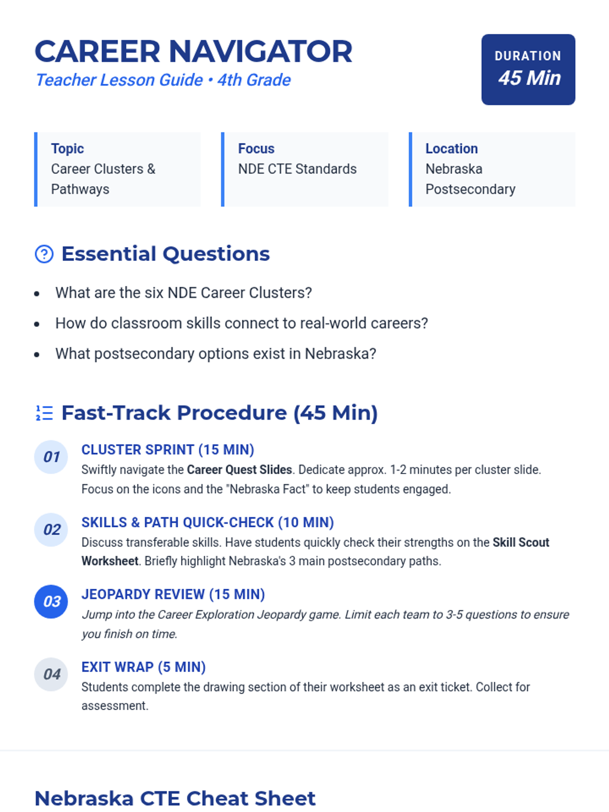 A comprehensive 4th-grade career exploration lesson focusing on Nebraska's CTE career clusters, transferable skills, and postsecondary pathways within the state. Students connect their current classroom learning to future professional opportunities through interactive discussion and a concluding Jeopardy game.