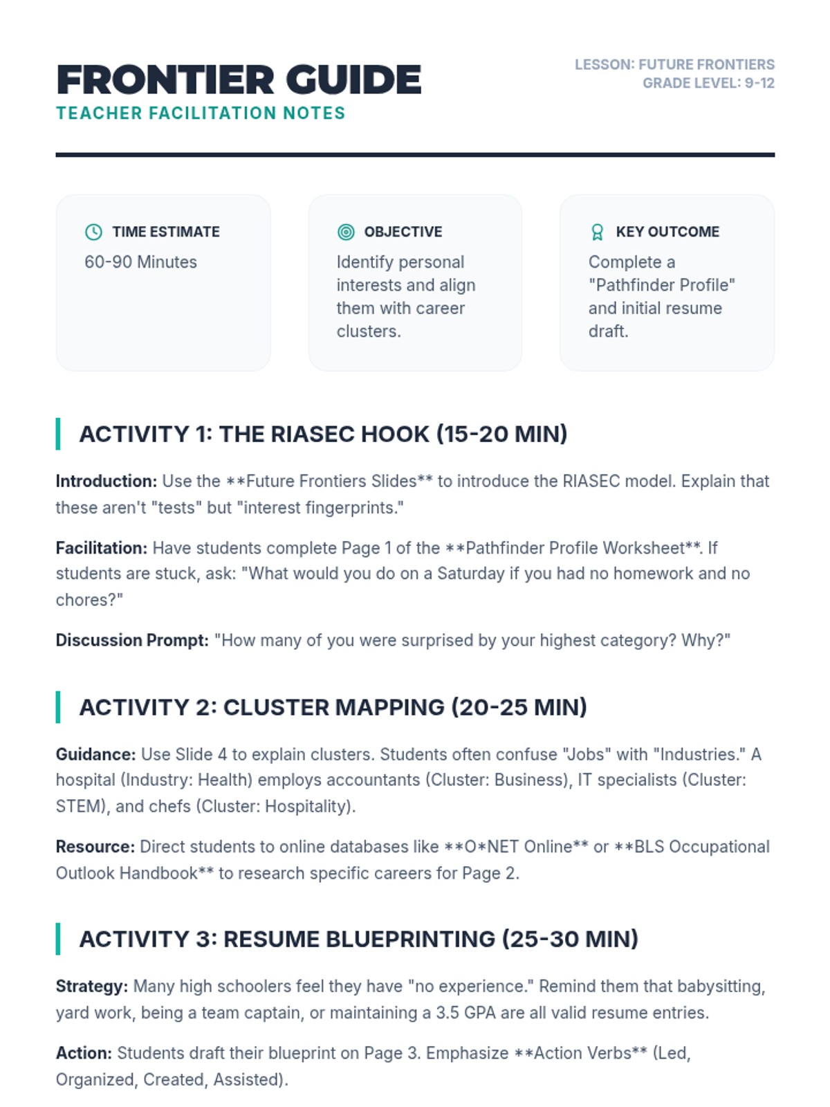 A comprehensive career exploration lesson helping high schoolers identify interests, map potential career pathways, and begin building professional resumes.