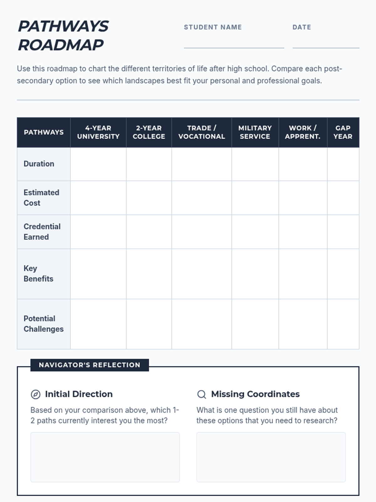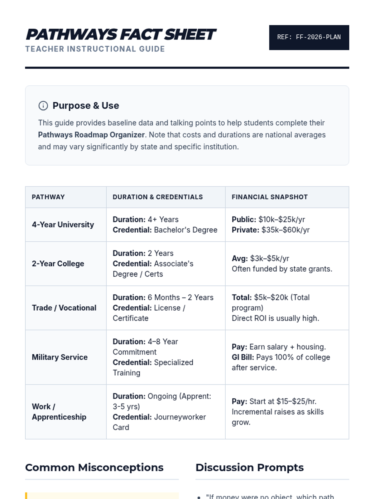 A lesson designed to help students explore and compare various post-secondary pathways, from traditional colleges to trade schools and the military.