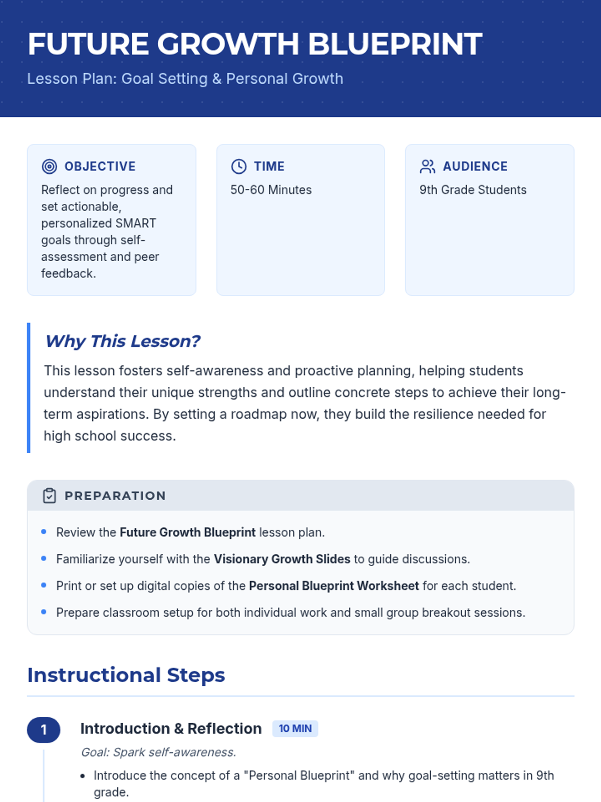 A comprehensive lesson for 9th graders to reflect on personal achievements and set SMART goals for their future through guided assessment and peer support.