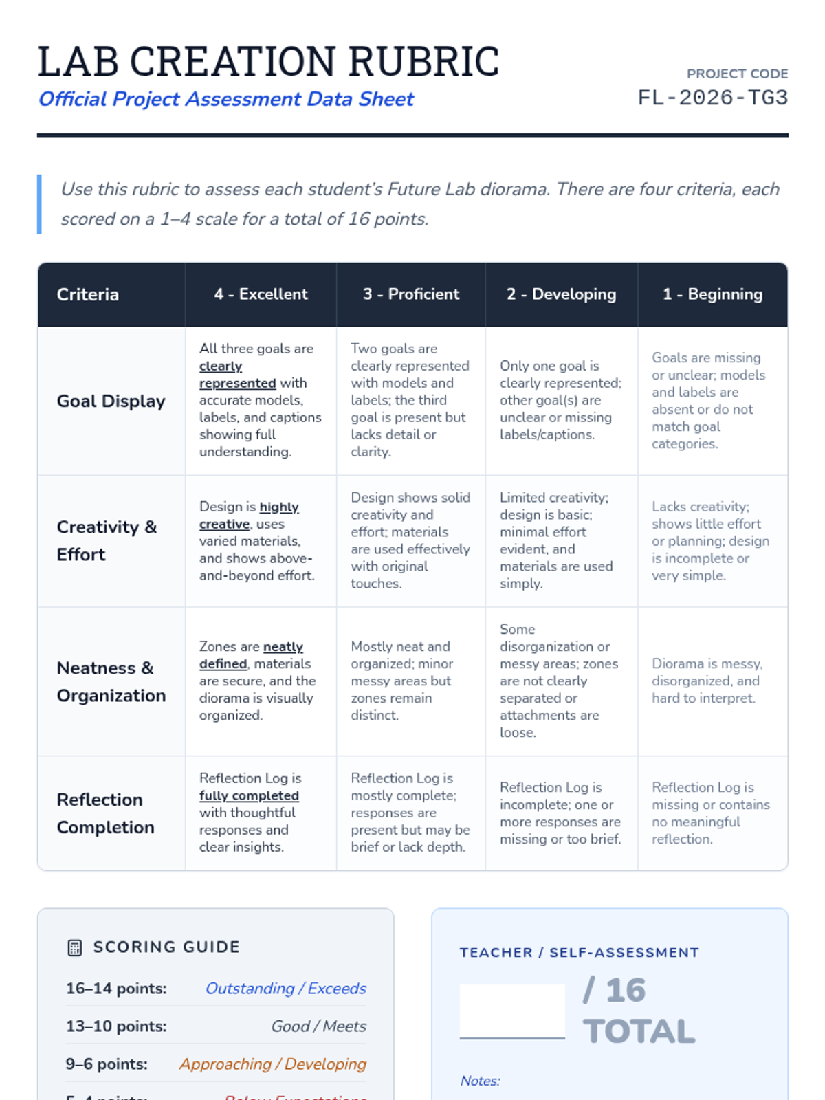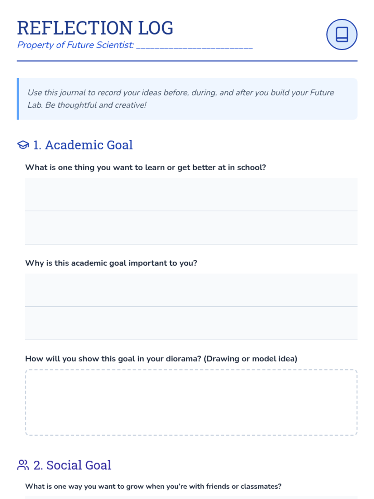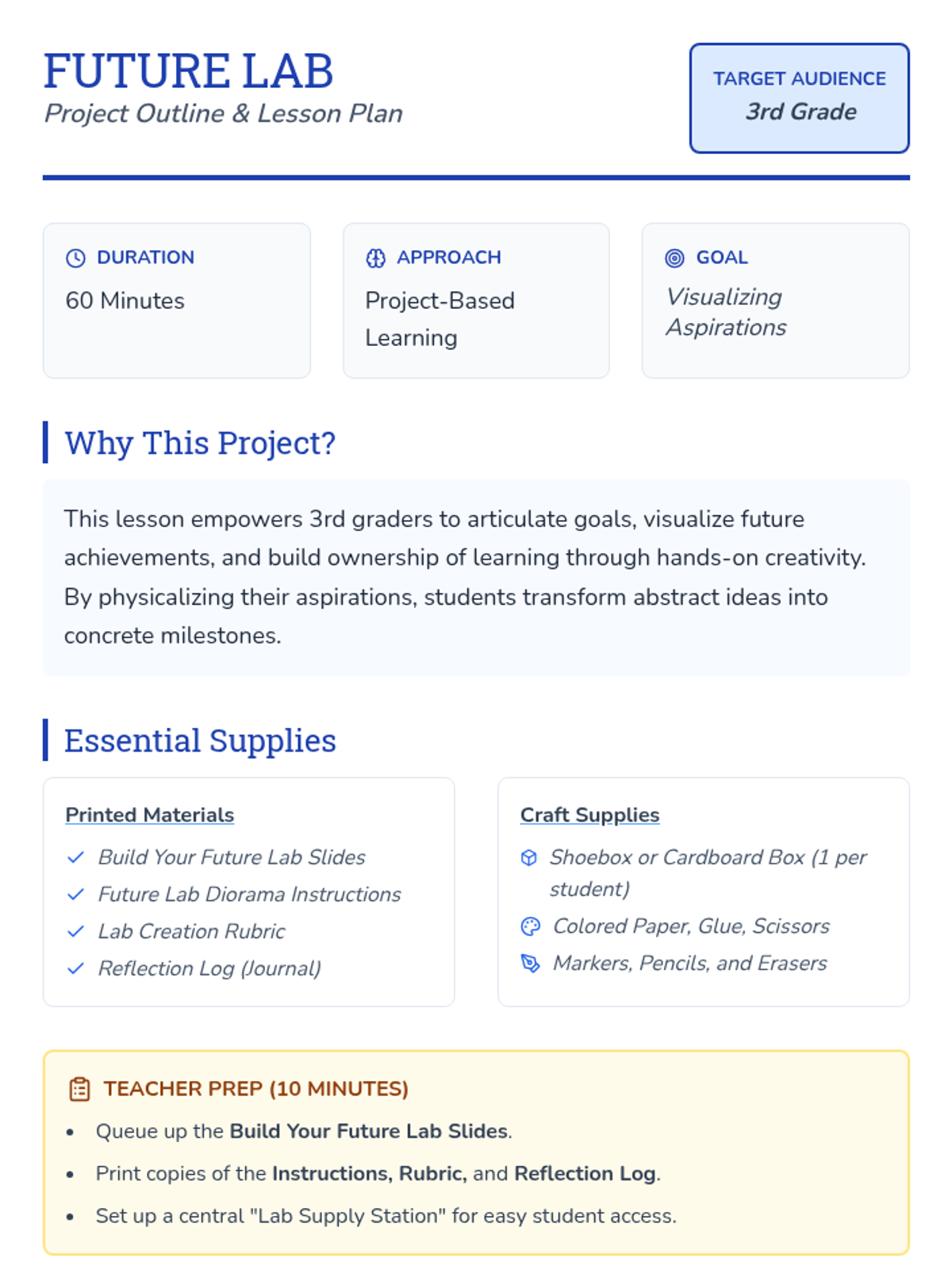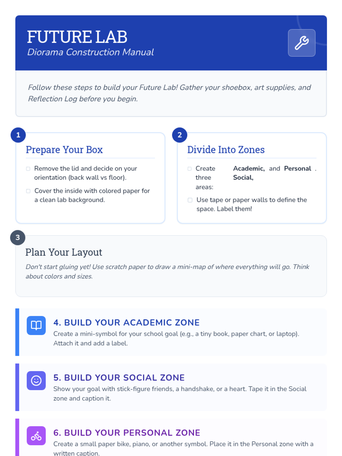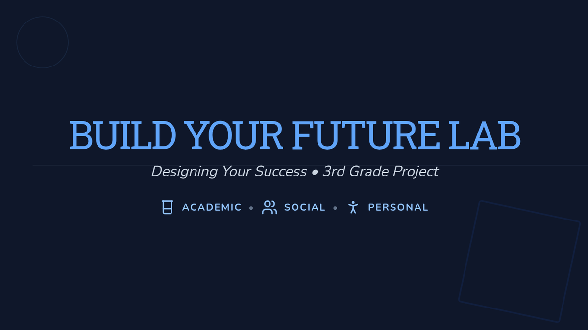 Students design a 'future lab' diorama to showcase their academic, social, and personal goals, fostering ownership and self-reflection.