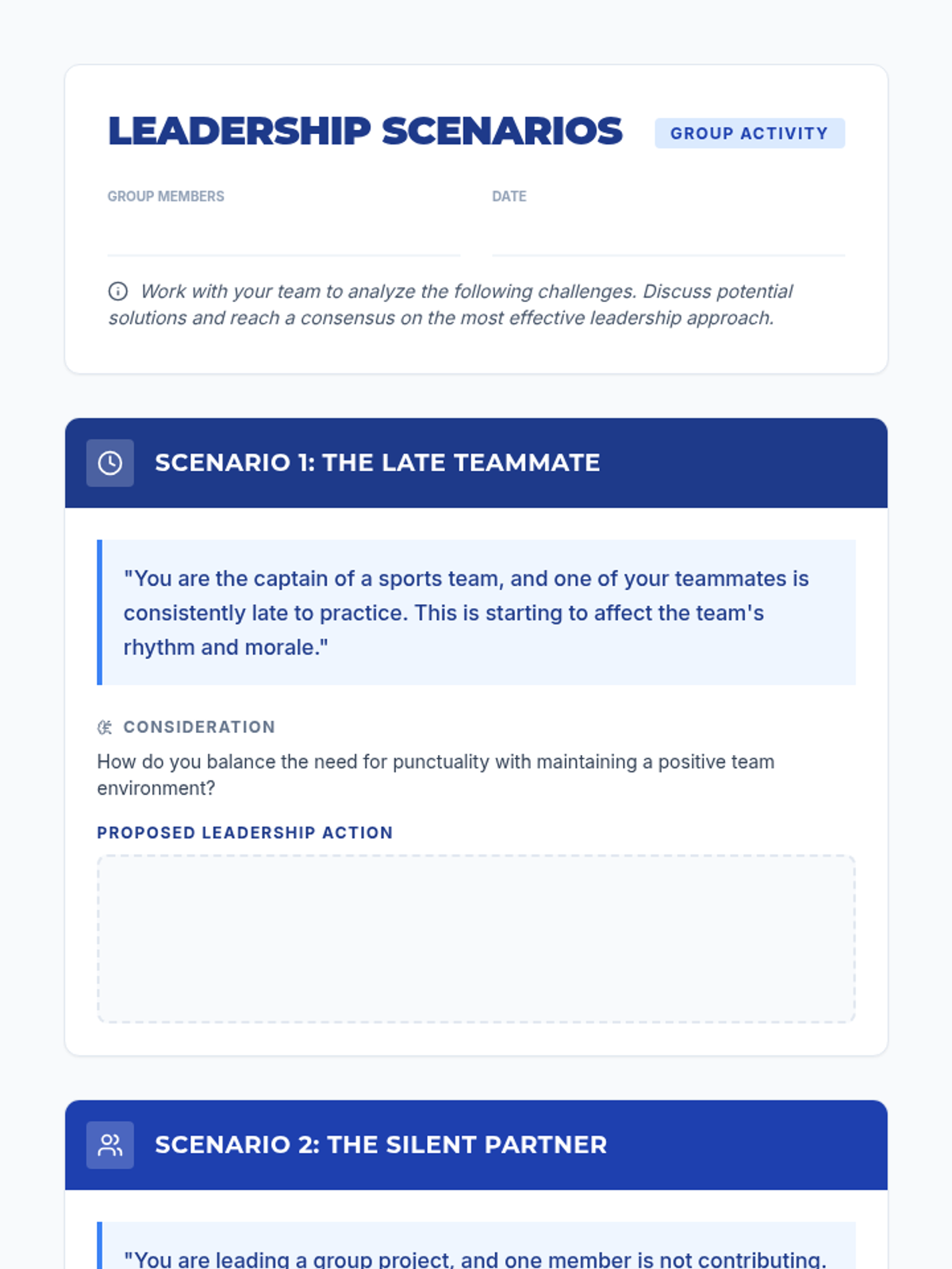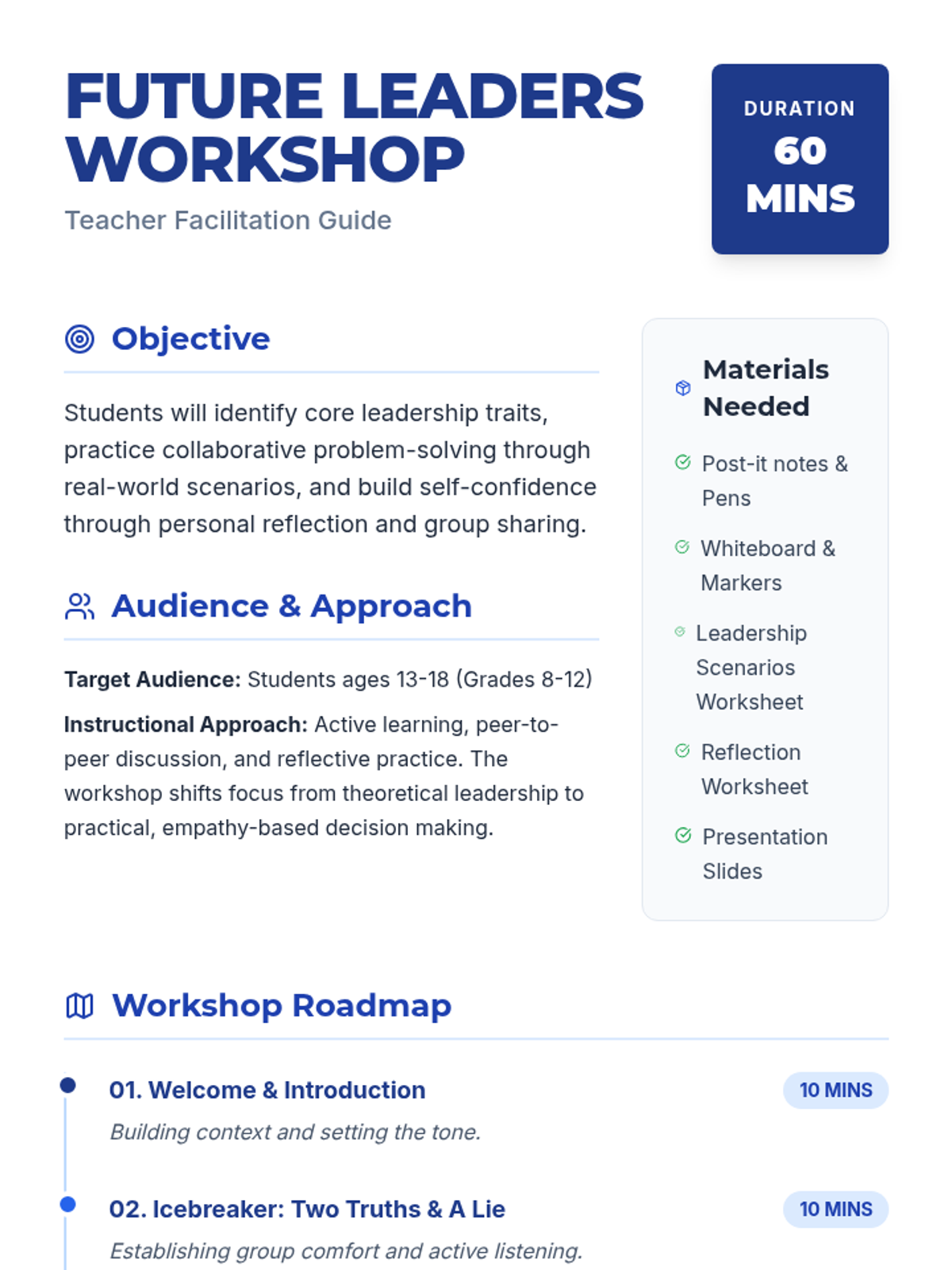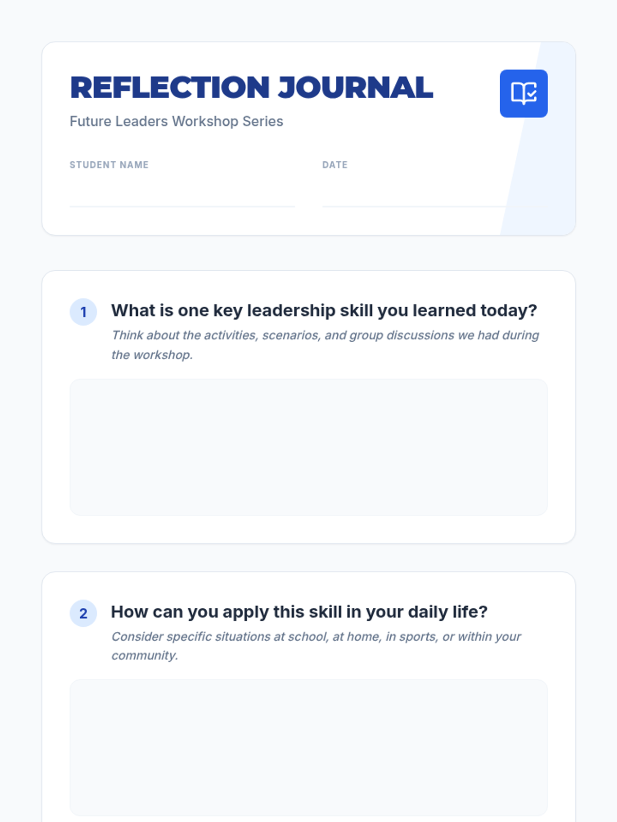 A dynamic workshop designed for teens (ages 13-18) to cultivate leadership skills, solve real-world scenarios, and build self-confidence through collaborative activities and self-reflection.