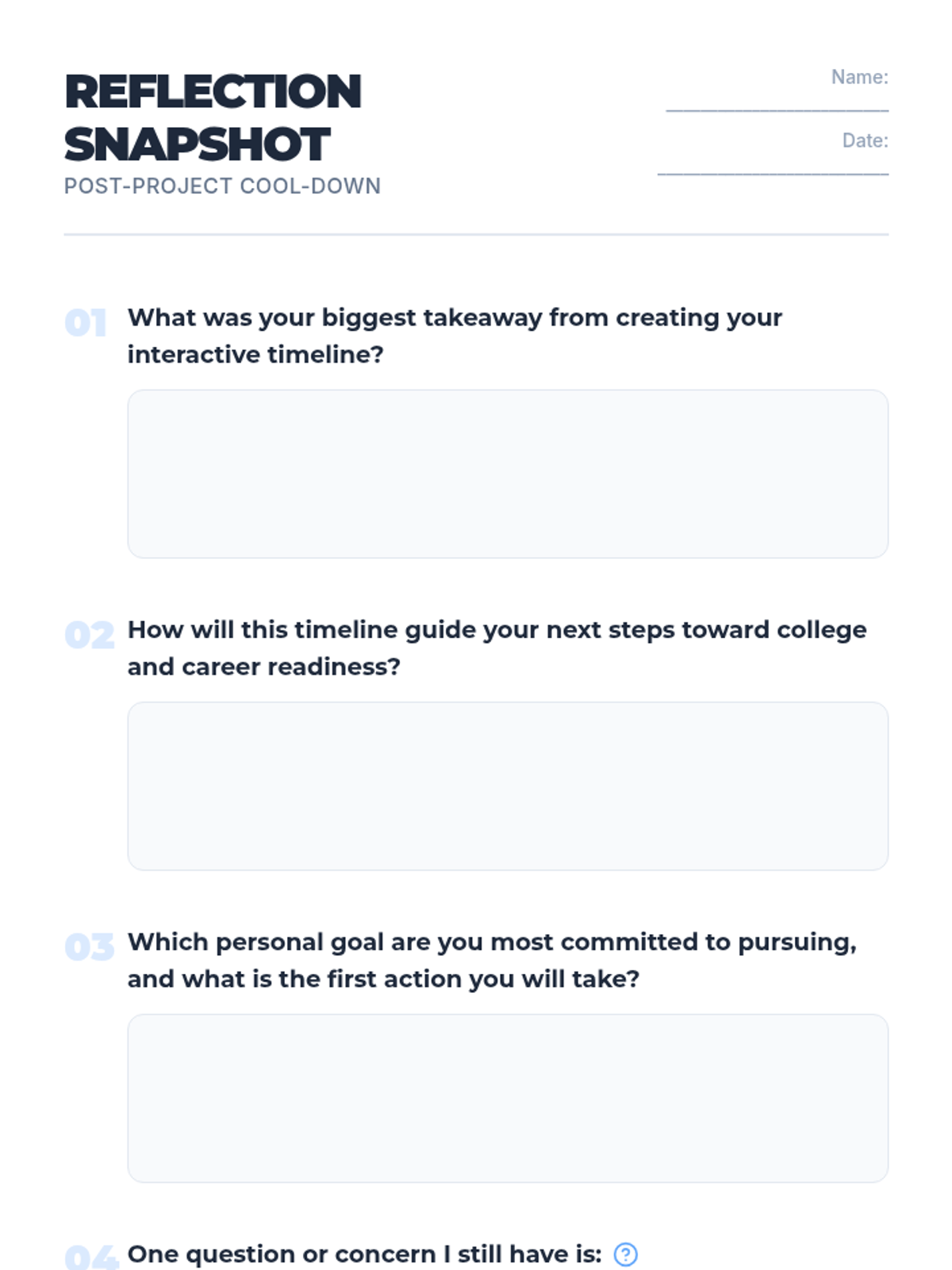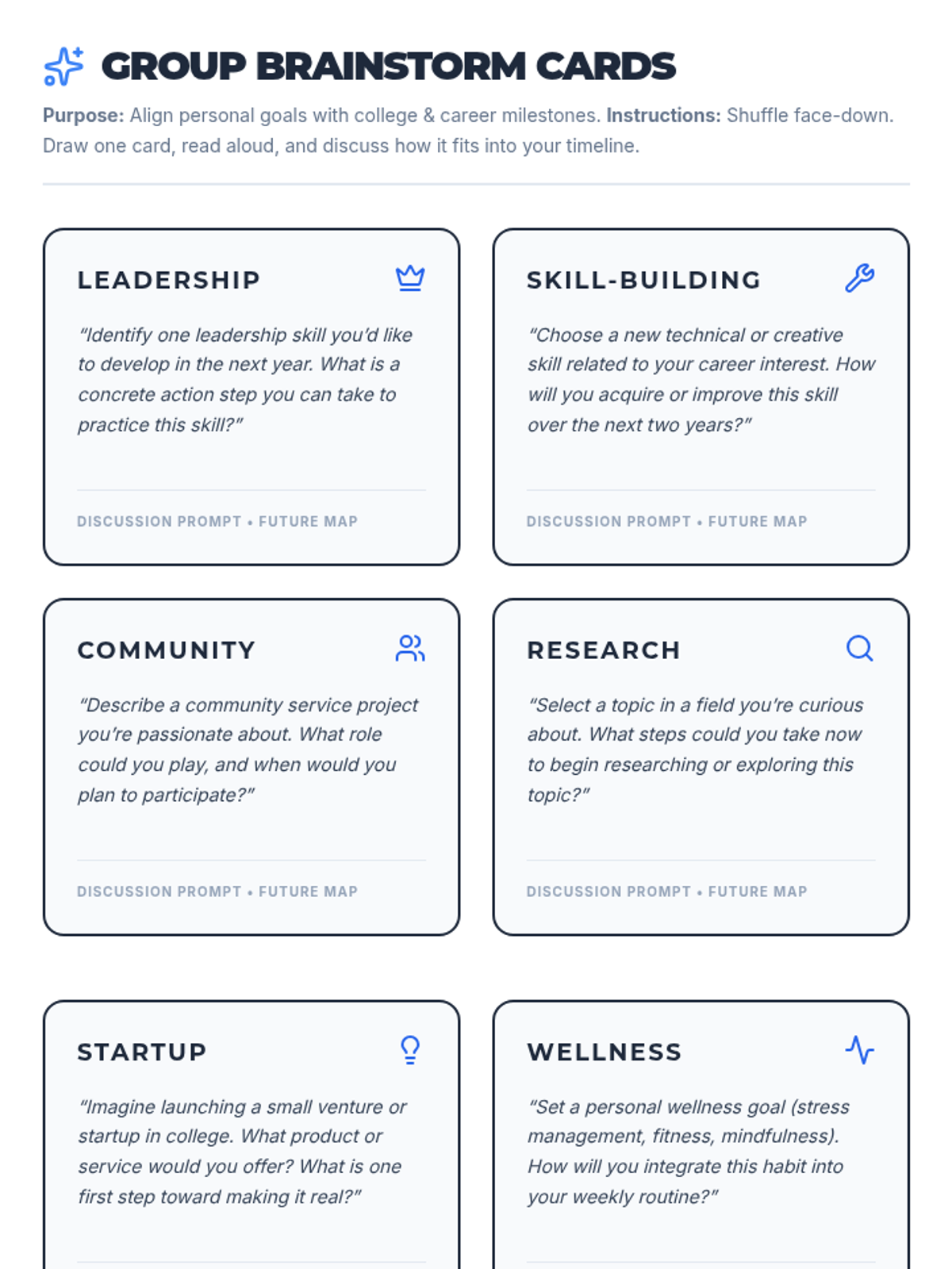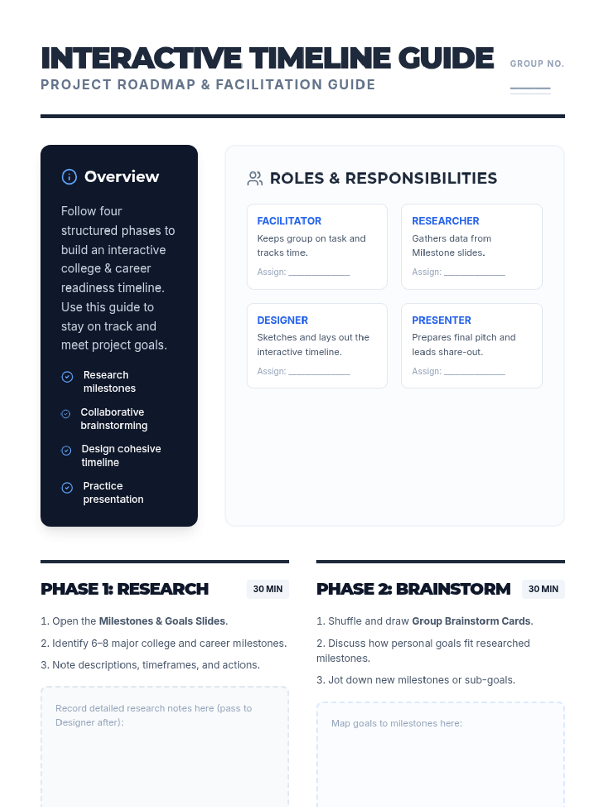 In this Tier 2 small-group project, 11th graders collaborate to build an interactive college and career readiness timeline, strengthening planning, teamwork, and goal-setting skills. Students research milestones, brainstorm ambitions, and craft a shared roadmap to their future.