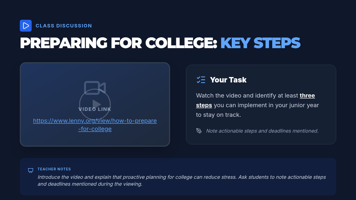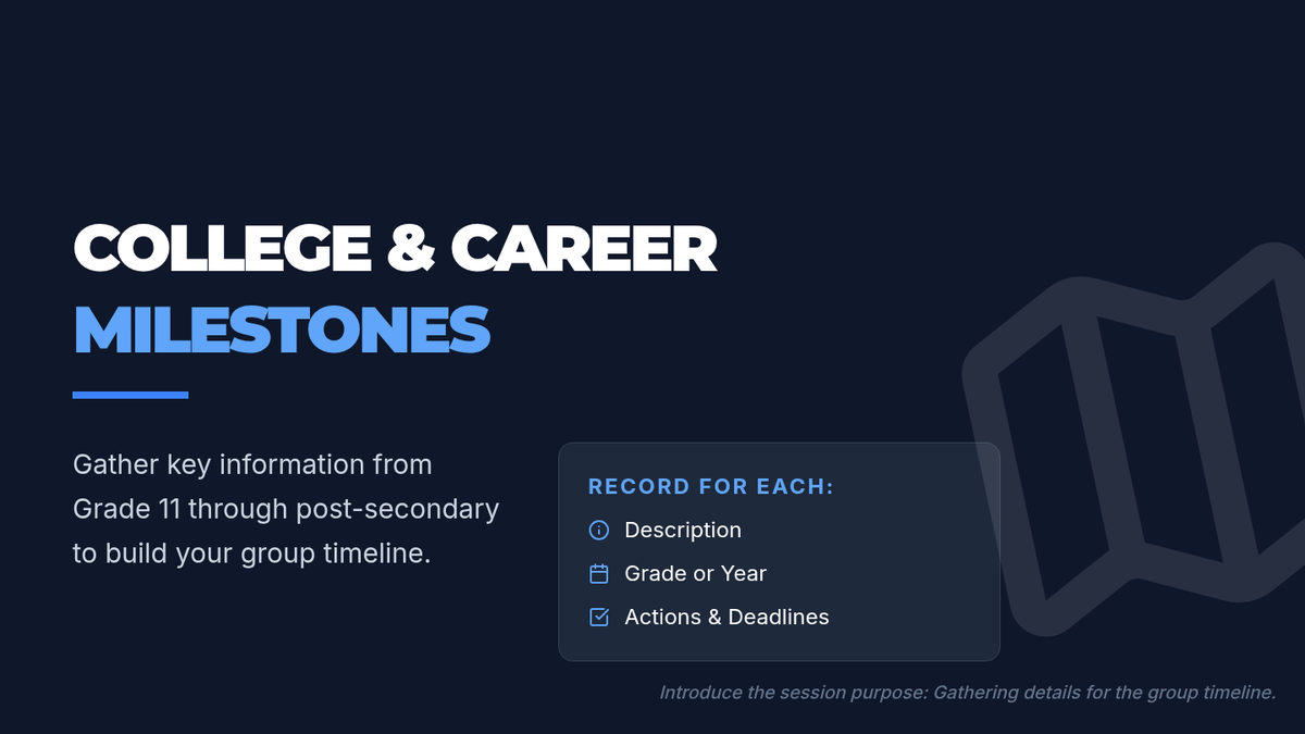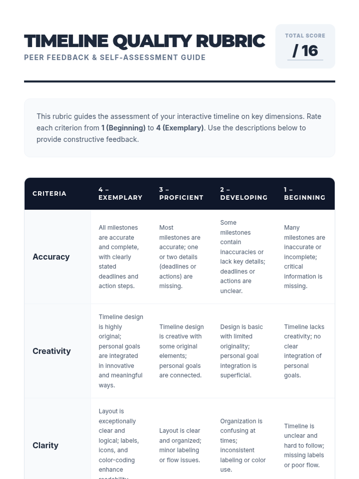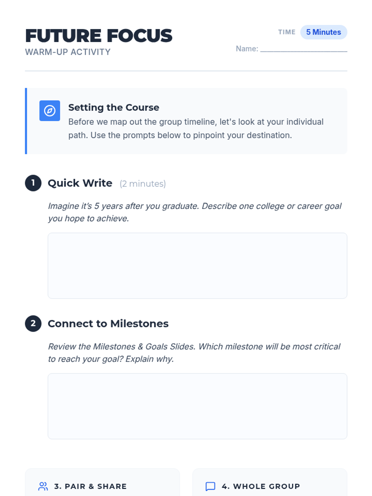 In this Tier 2 small-group project, 11th graders collaborate to build an interactive college and career readiness timeline, strengthening planning, teamwork, and goal-setting skills. Students research milestones, brainstorm ambitions, and craft a shared roadmap to their future.