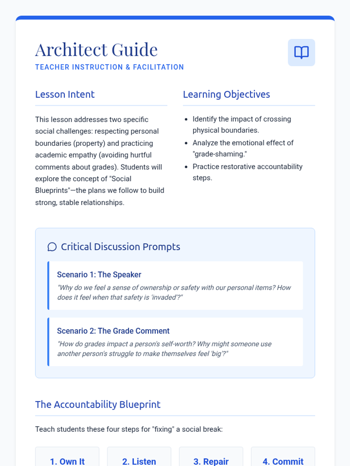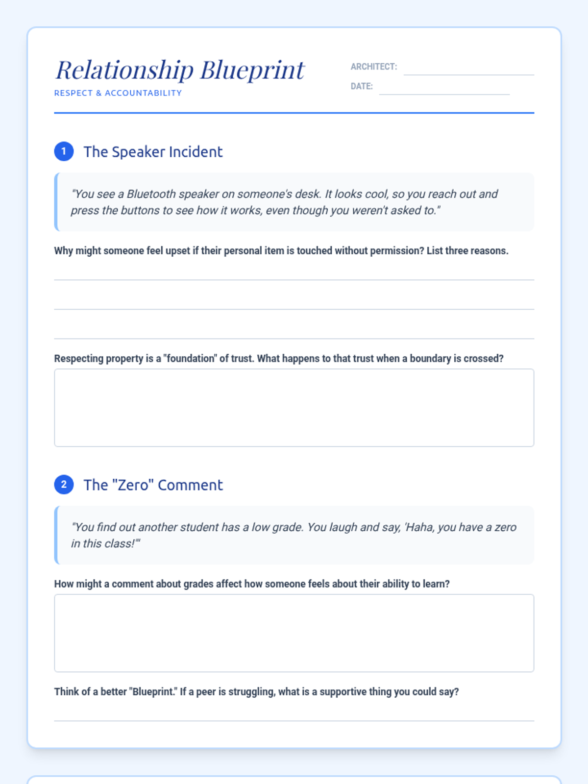 A social-emotional learning lesson focused on respecting personal property and practicing academic empathy through accountability.