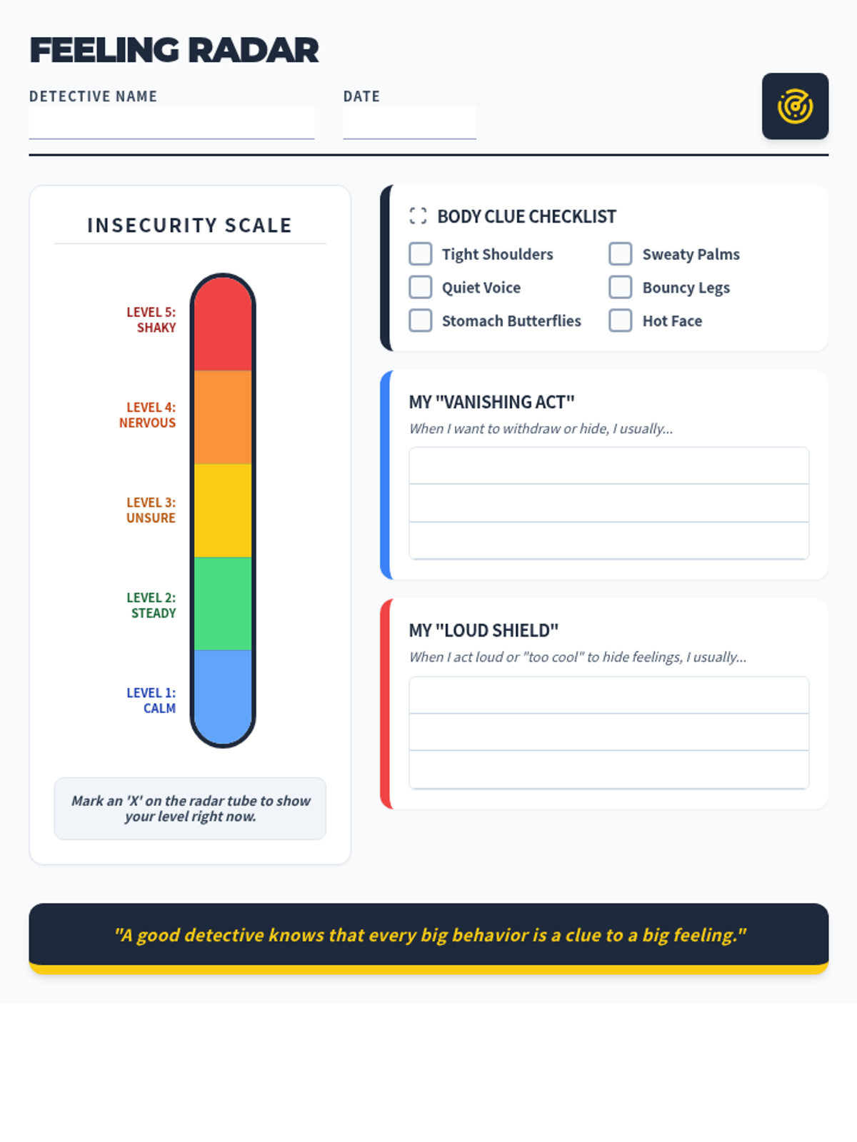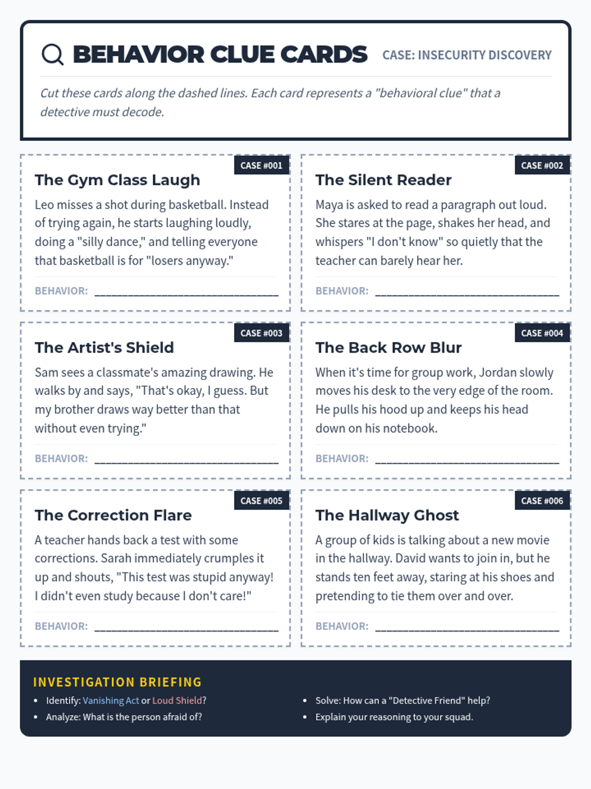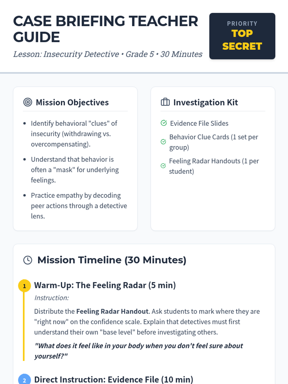 A Social-Emotional Learning lesson focused on identifying the behavioral 'masks' of insecurity. Students learn to spot signs like withdrawing and overcompensating through a detective-themed investigation.