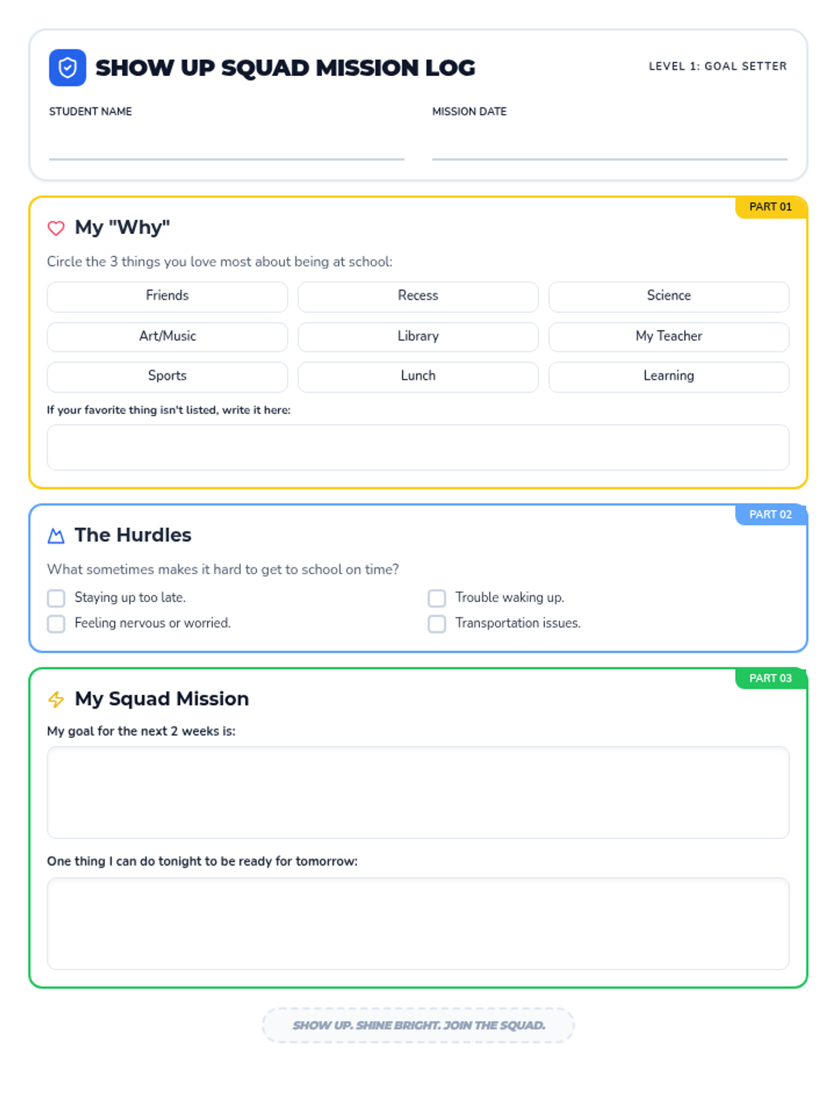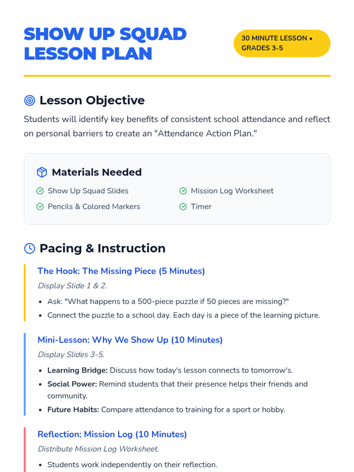 A 30-minute lesson designed for upper elementary students to understand the impact of school attendance on their learning and social connections. Students join the 'Show Up Squad' to reflect on their own attendance habits and set positive goals.