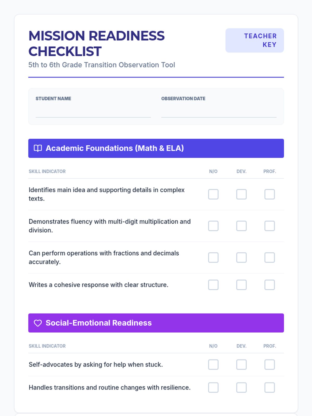 A comprehensive readiness assessment designed to evaluate academic, executive functioning, social-emotional, and functional independence skills for students transitioning from 5th to 6th grade.