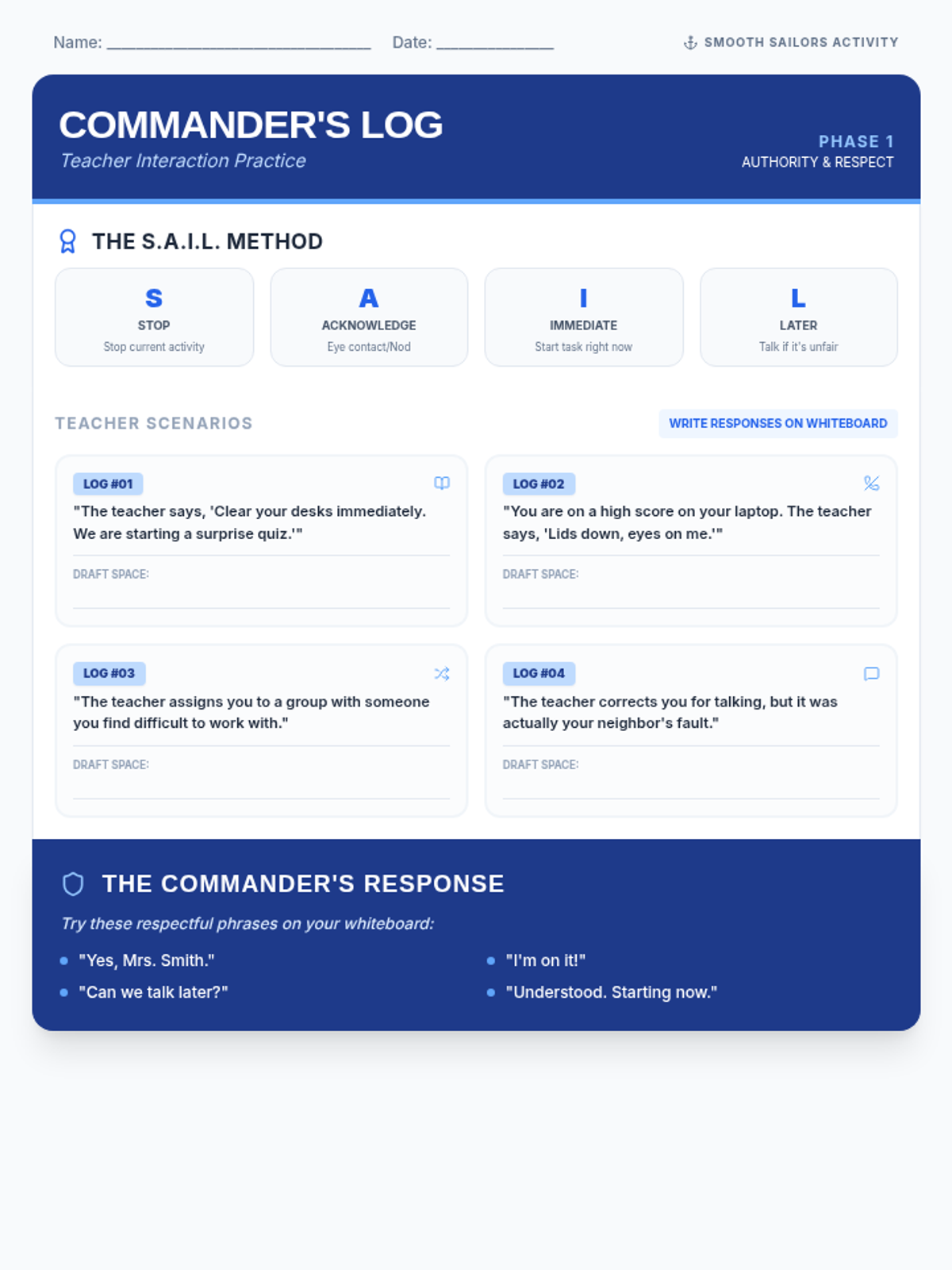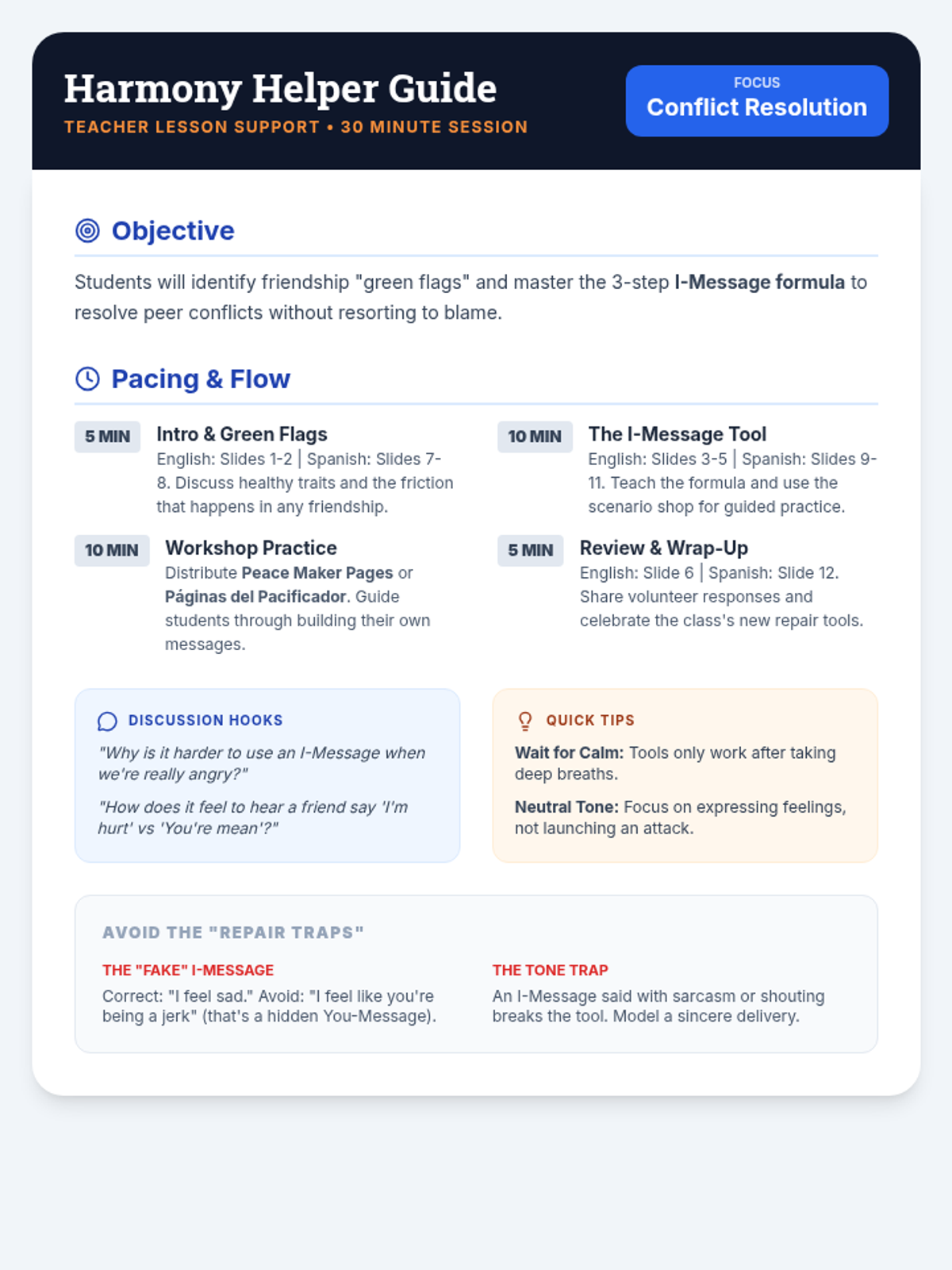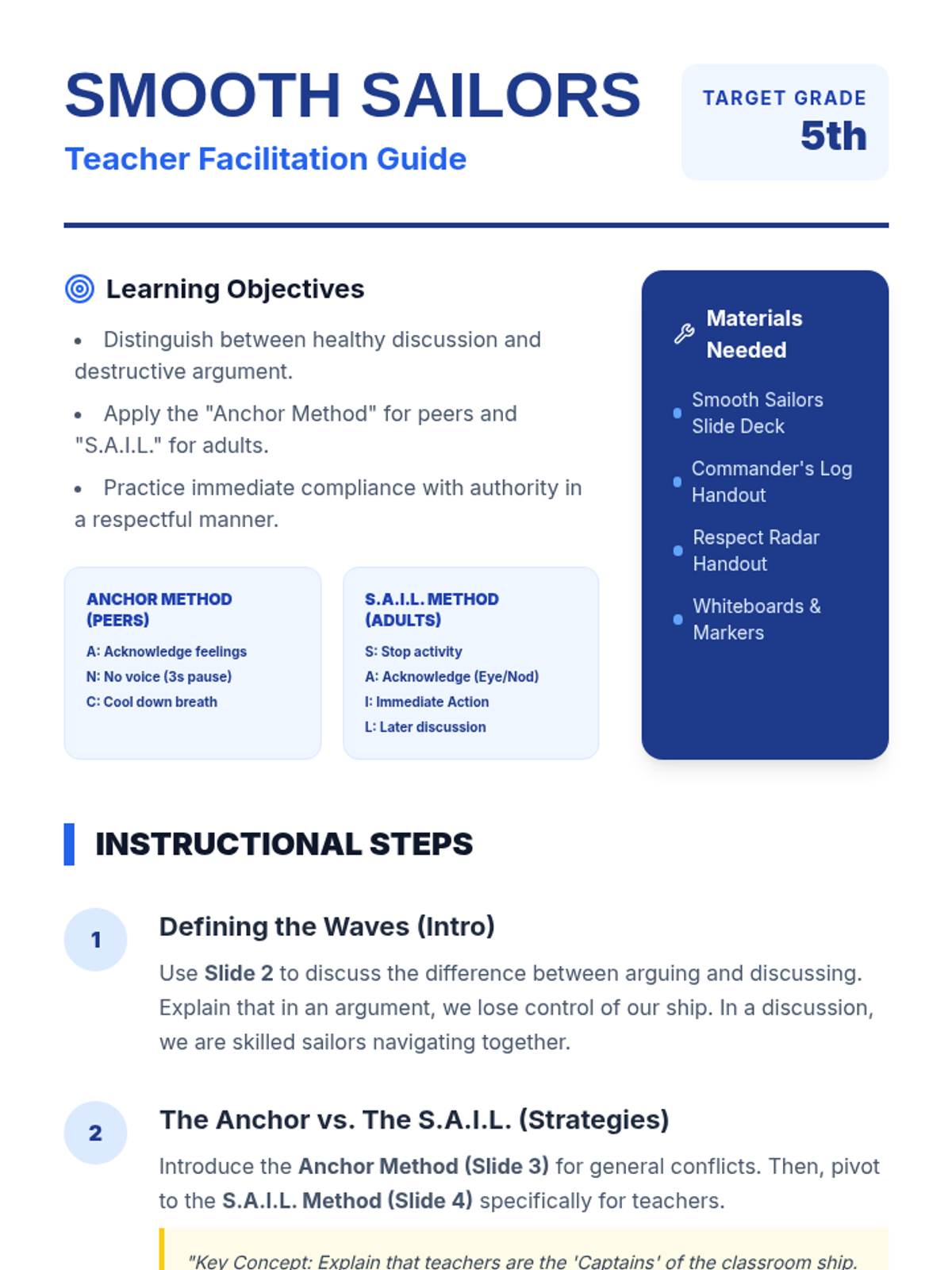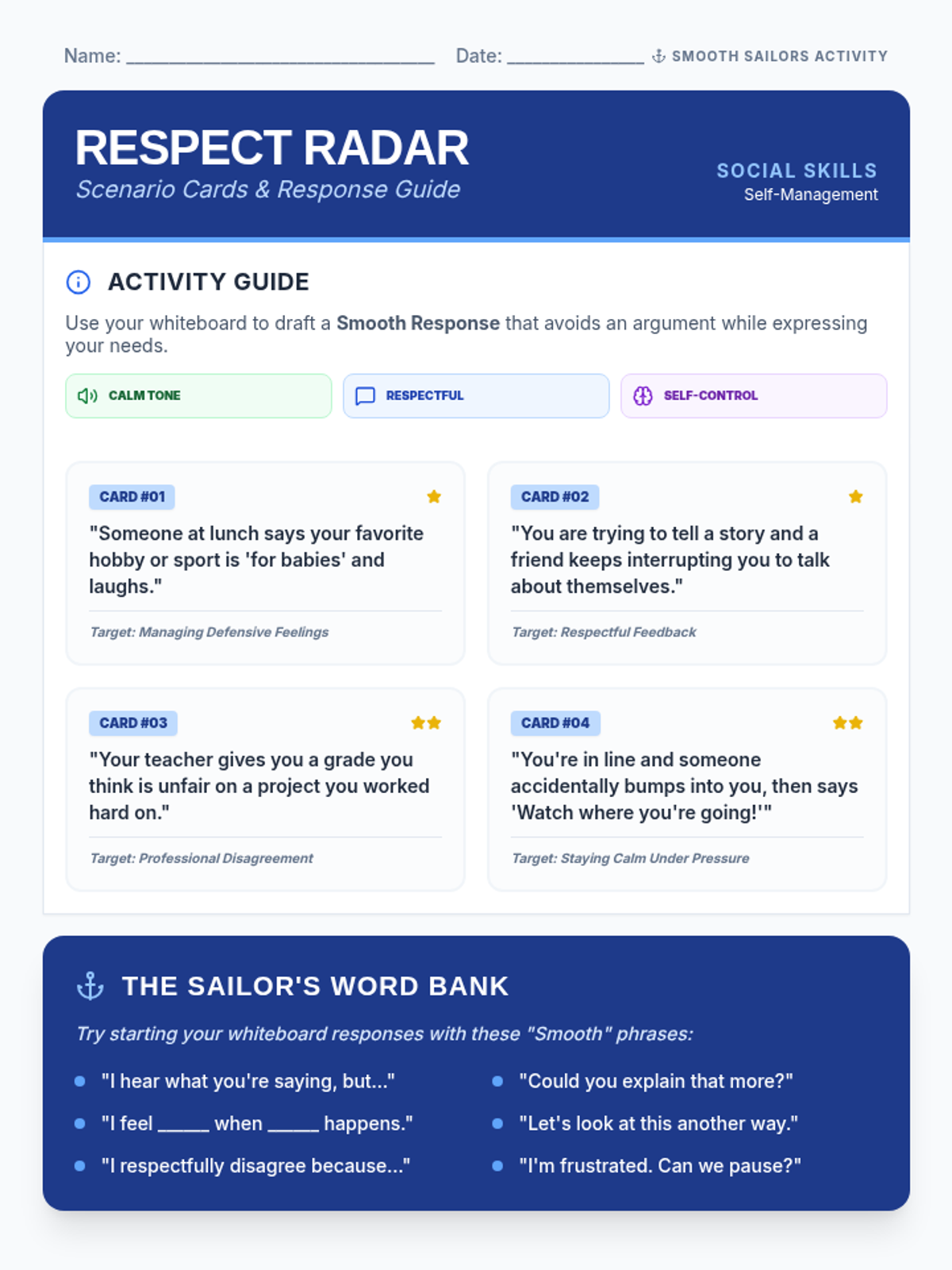 A social-emotional learning lesson focused on self-management and respect, teaching students how to handle disagreements without becoming argumentative. Students learn the 'Anchor Method' to stay calm and practice transforming conflict into conversation.