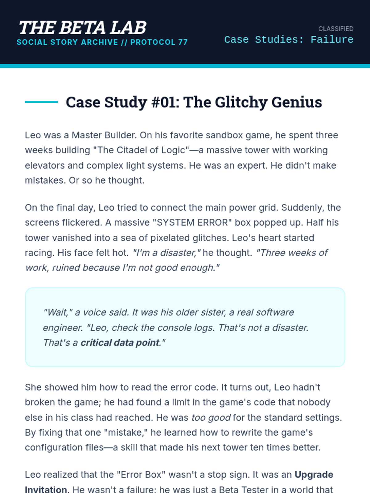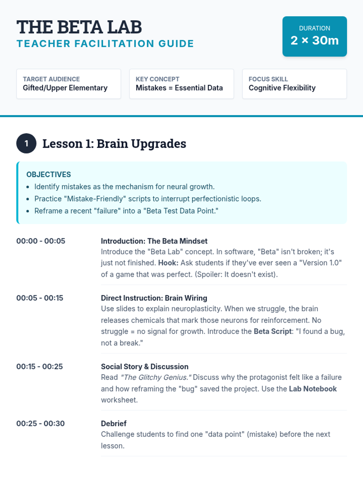 A 10-minute intervention using a robot social story to explain cognitive flexibility. Frames new learning as an "Expansion Pack" to existing brilliant skills.