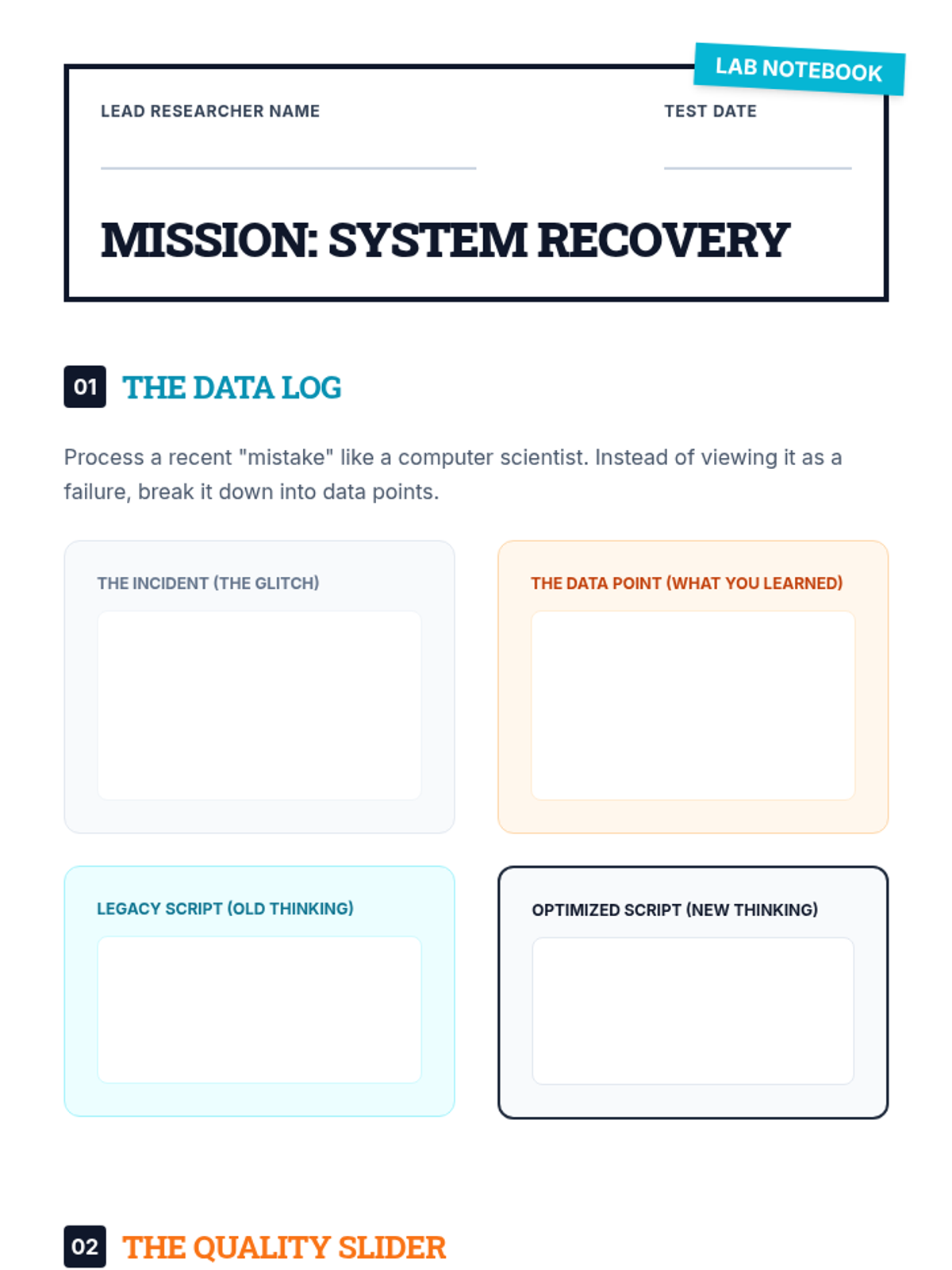 Students will explore the concept of 'The Quality Slider' to differentiate between necessary quality and perfection, while practicing intentional safe mistakes.