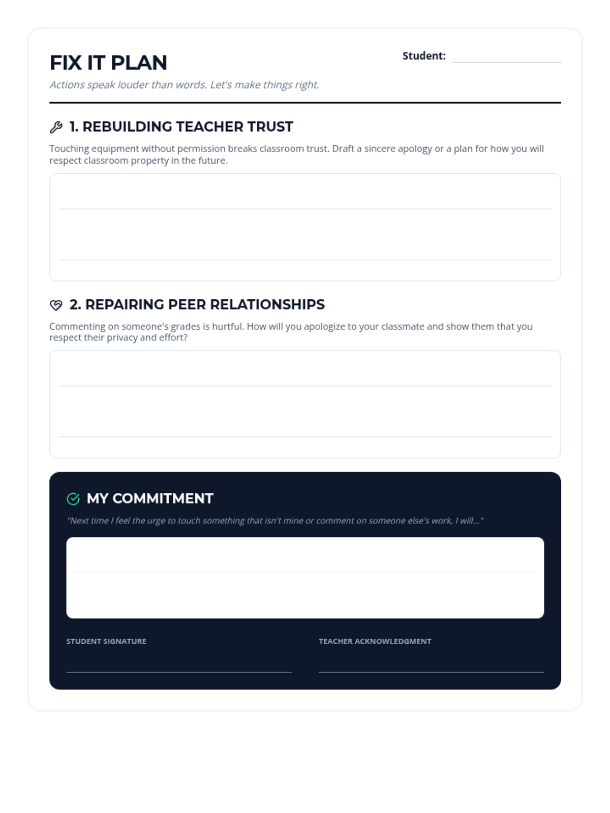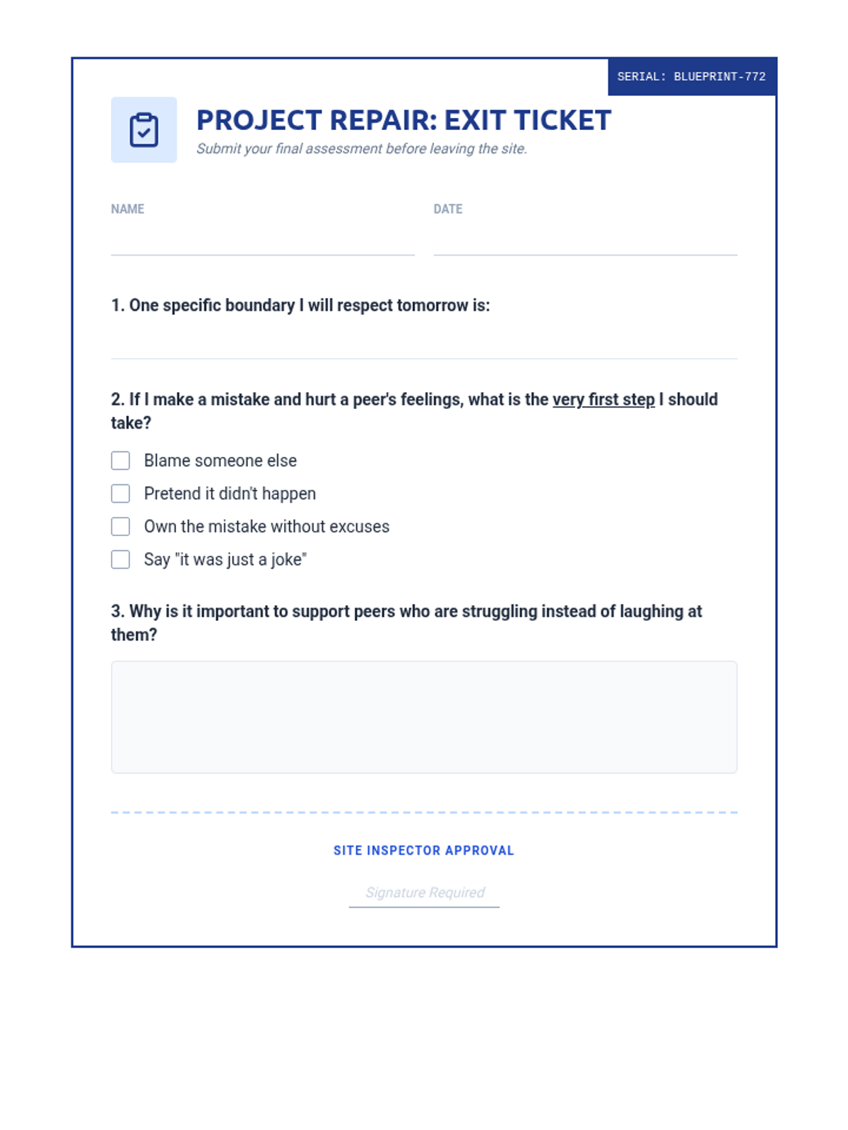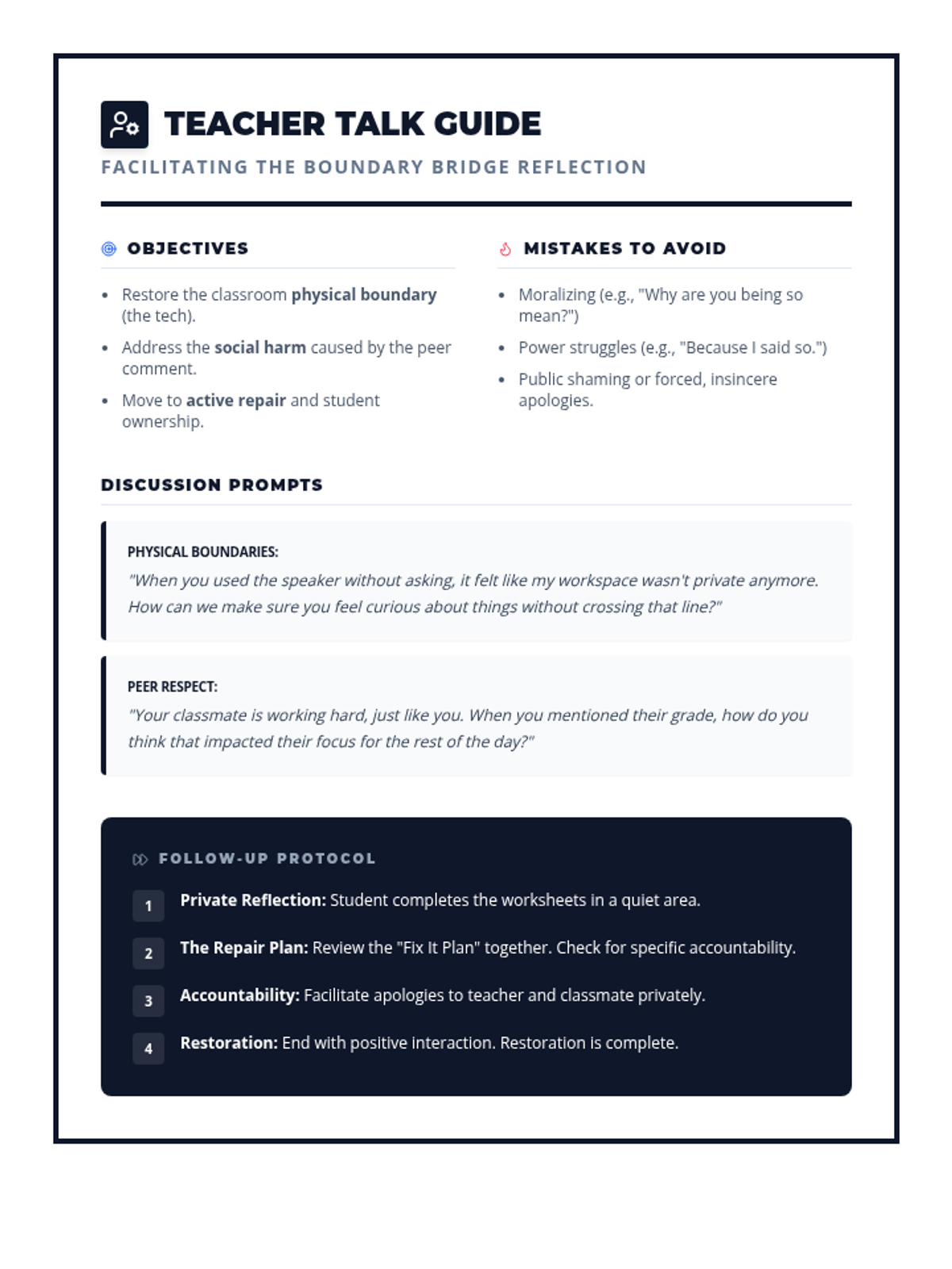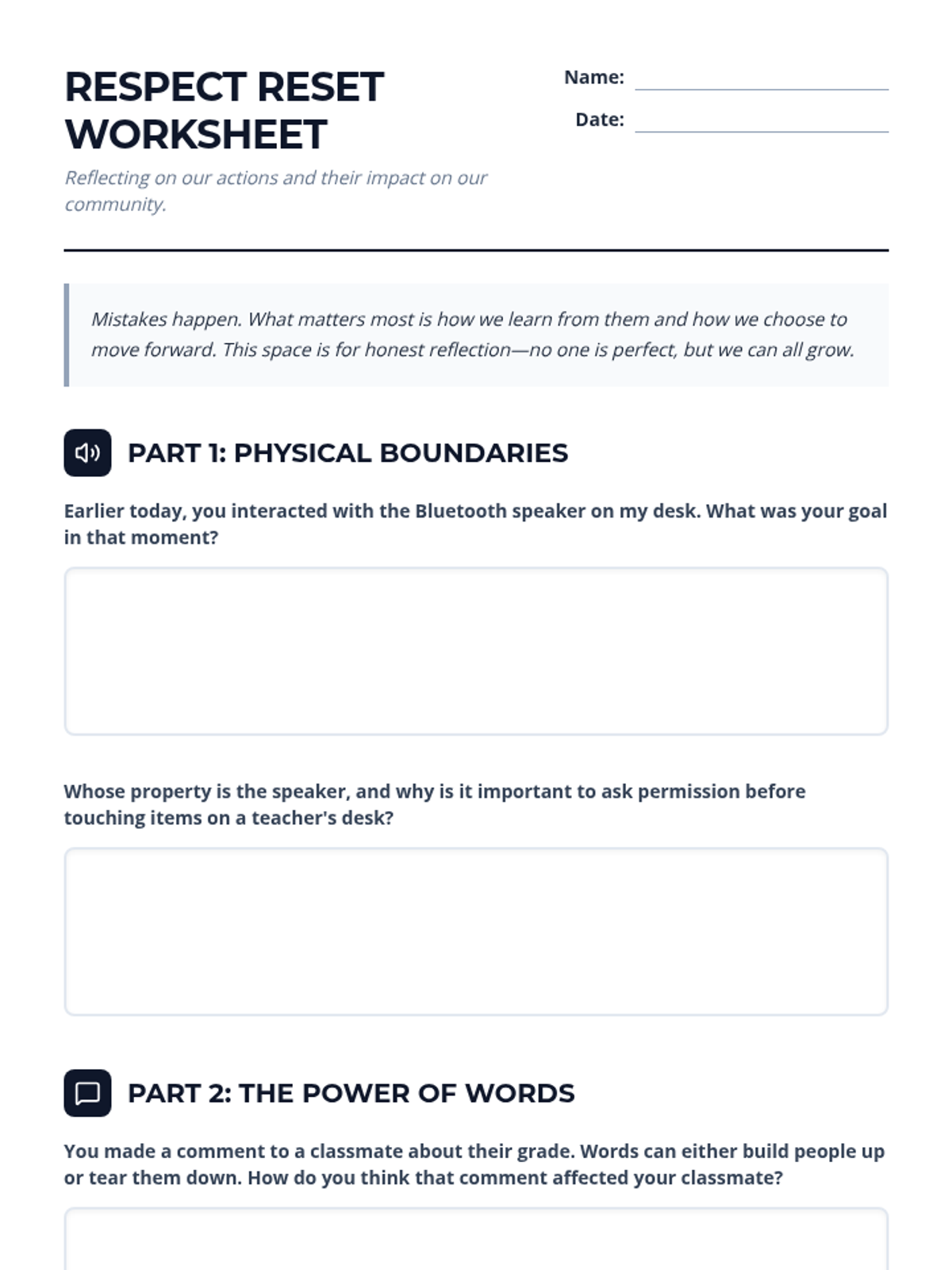 A restorative justice lesson designed to help students reflect on physical boundaries, digital responsibility, and peer respect after a behavioral incident involving classroom property and unkind comments.