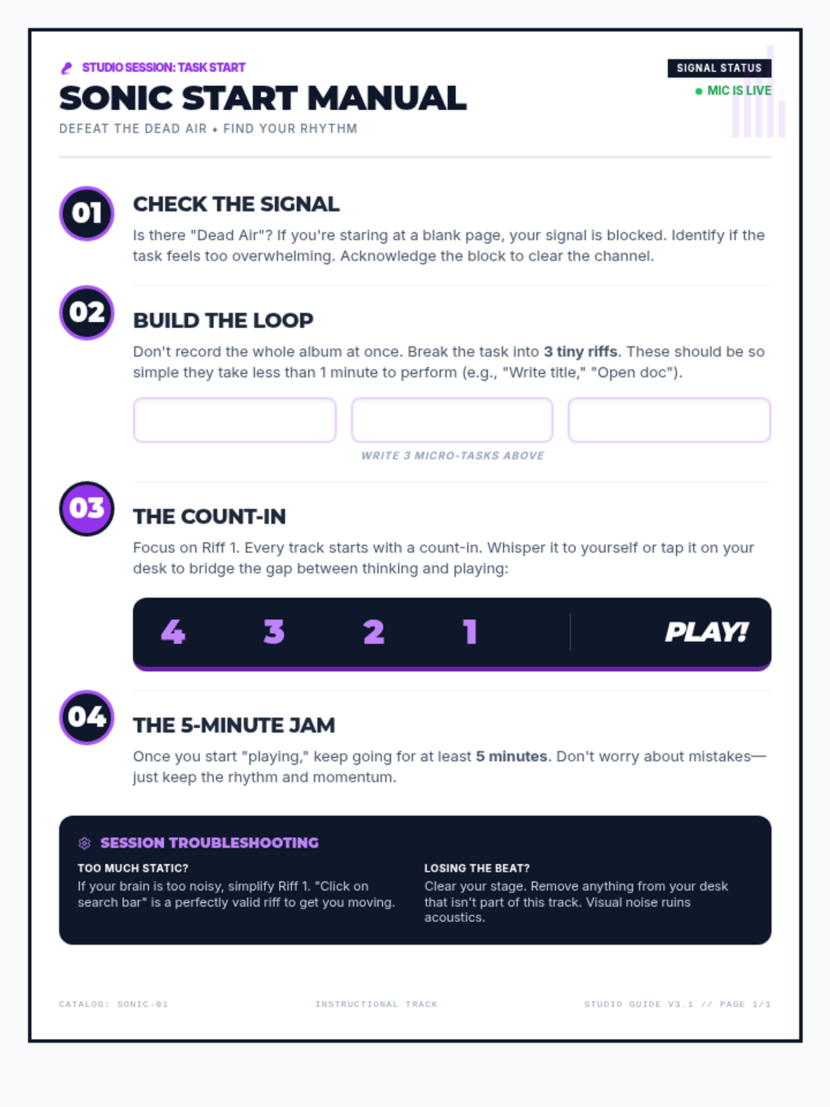 A practical lesson focusing on task initiation through a musical lens. Students learn to overcome 'Dead Air' (procrastination) using 'The Count-In' and 'The 5-Minute Jam' to build momentum in their classroom work.