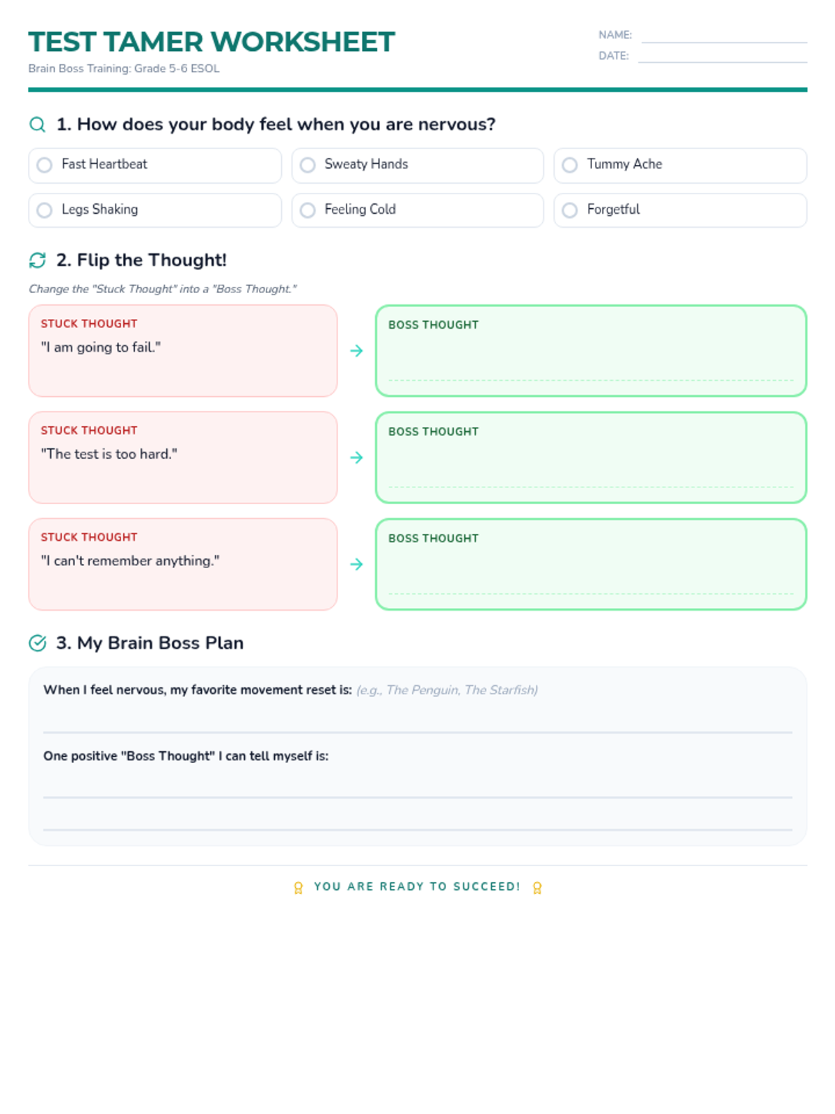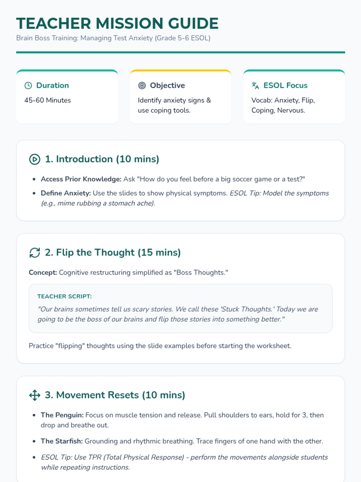 A lesson designed for Grade 5-6 ESOL students to identify signs of test anxiety and implement coping strategies including movement and cognitive restructuring. Students will learn to 'flip' negative thoughts and use physical resets to stay focused during assessments.