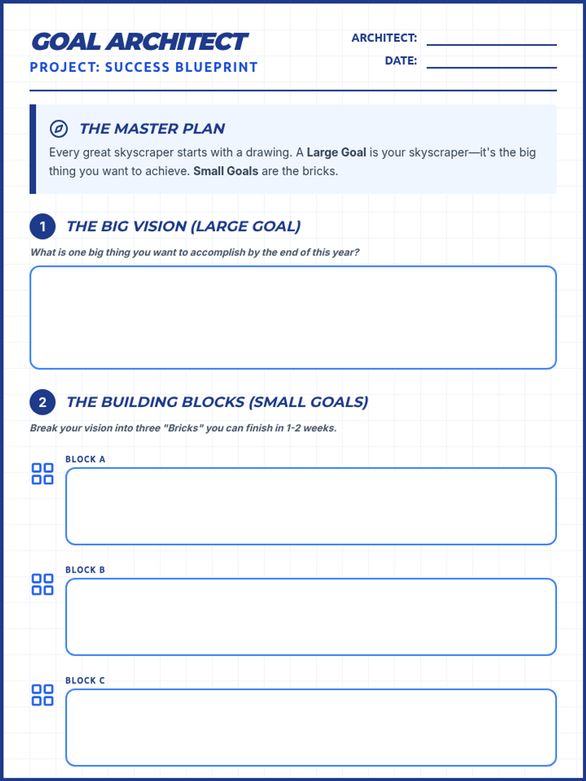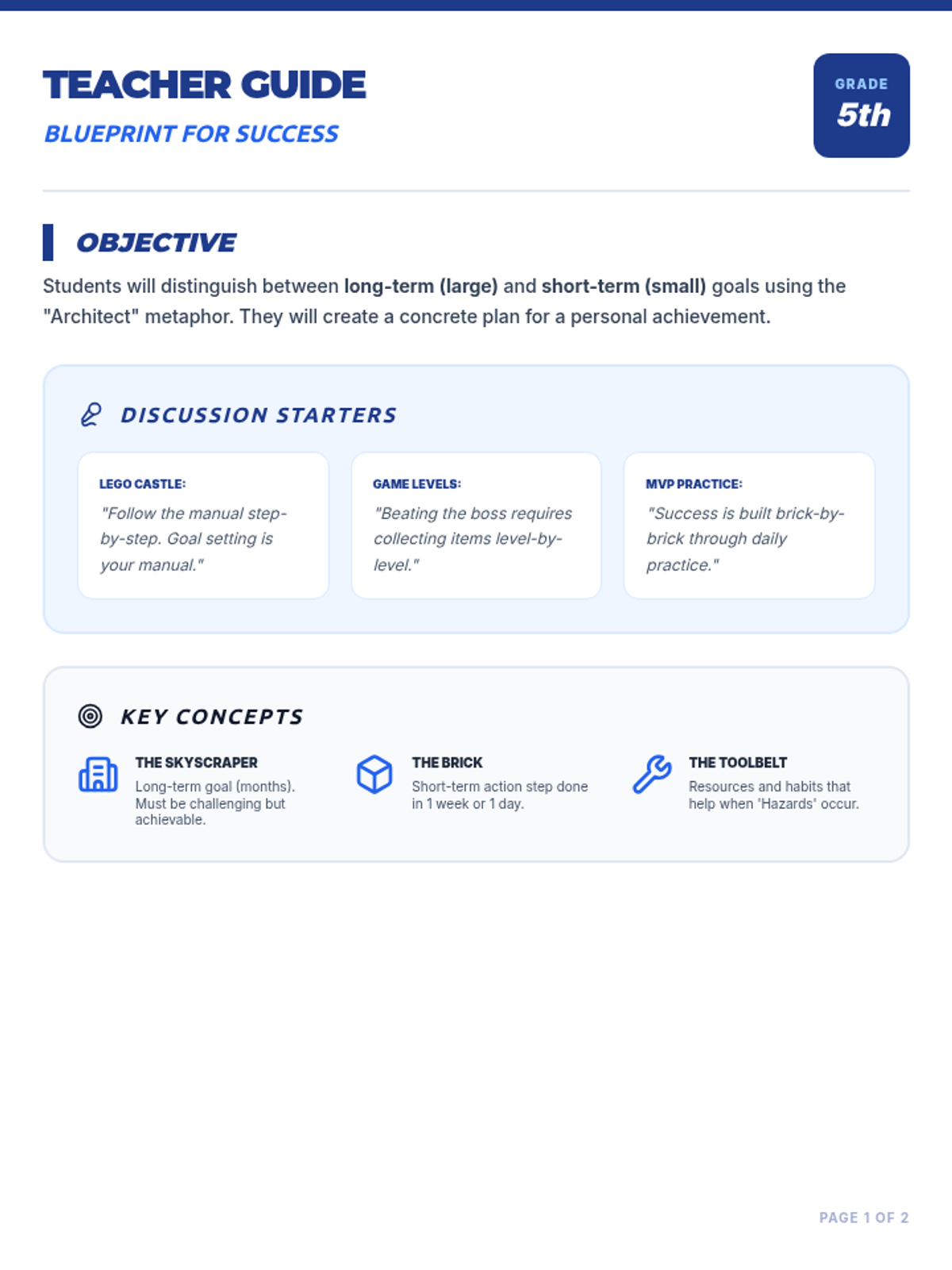 Students learn to distinguish between long-term (large) goals and short-term (small) goals, using a 'blueprint' framework to break down big dreams into manageable steps.
