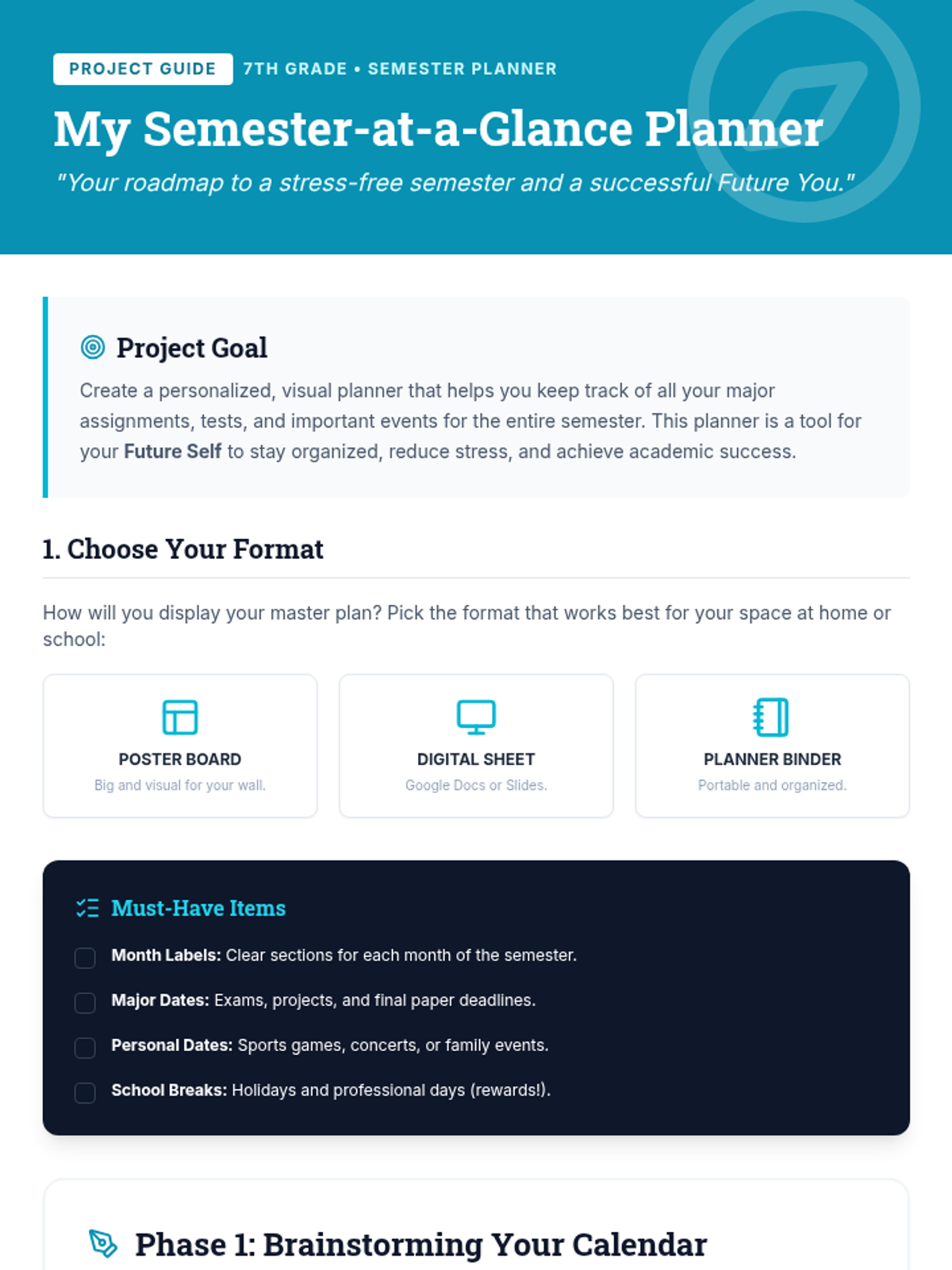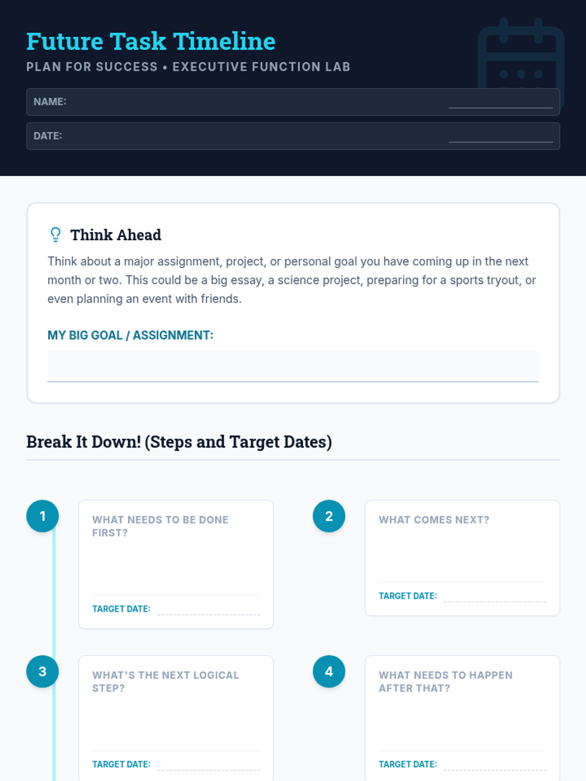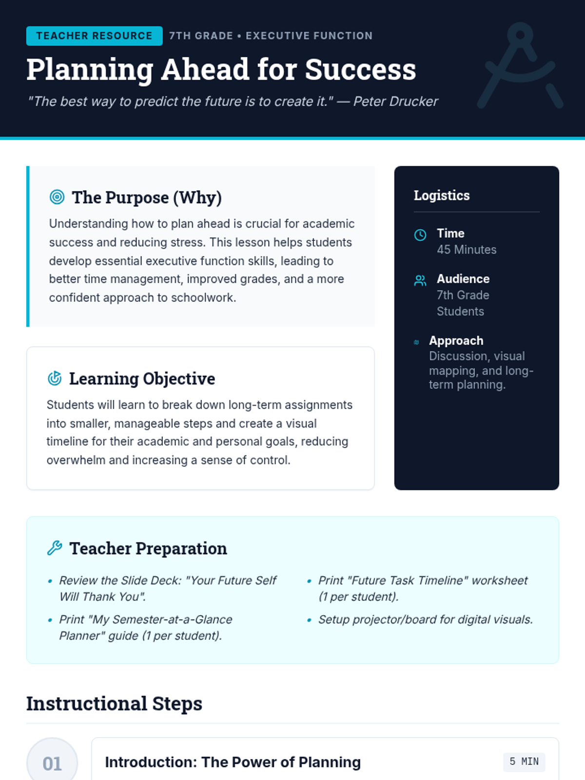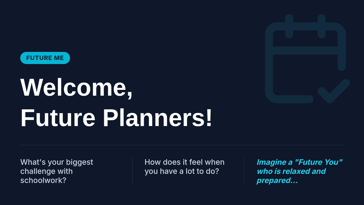 A 45-minute lesson for 7th graders focused on developing foresight and planning skills through visual timelines and long-term project organization. Students learn to break down large tasks to reduce anxiety and increase productivity.