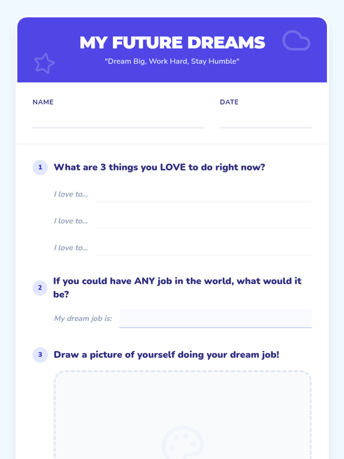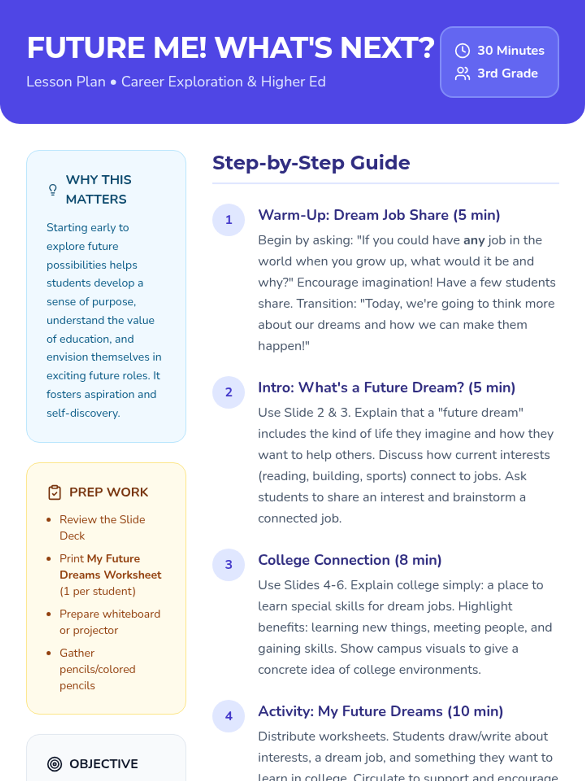 A 30-minute lesson for 3rd graders exploring interests, future careers, and the role of higher education in achieving dreams.