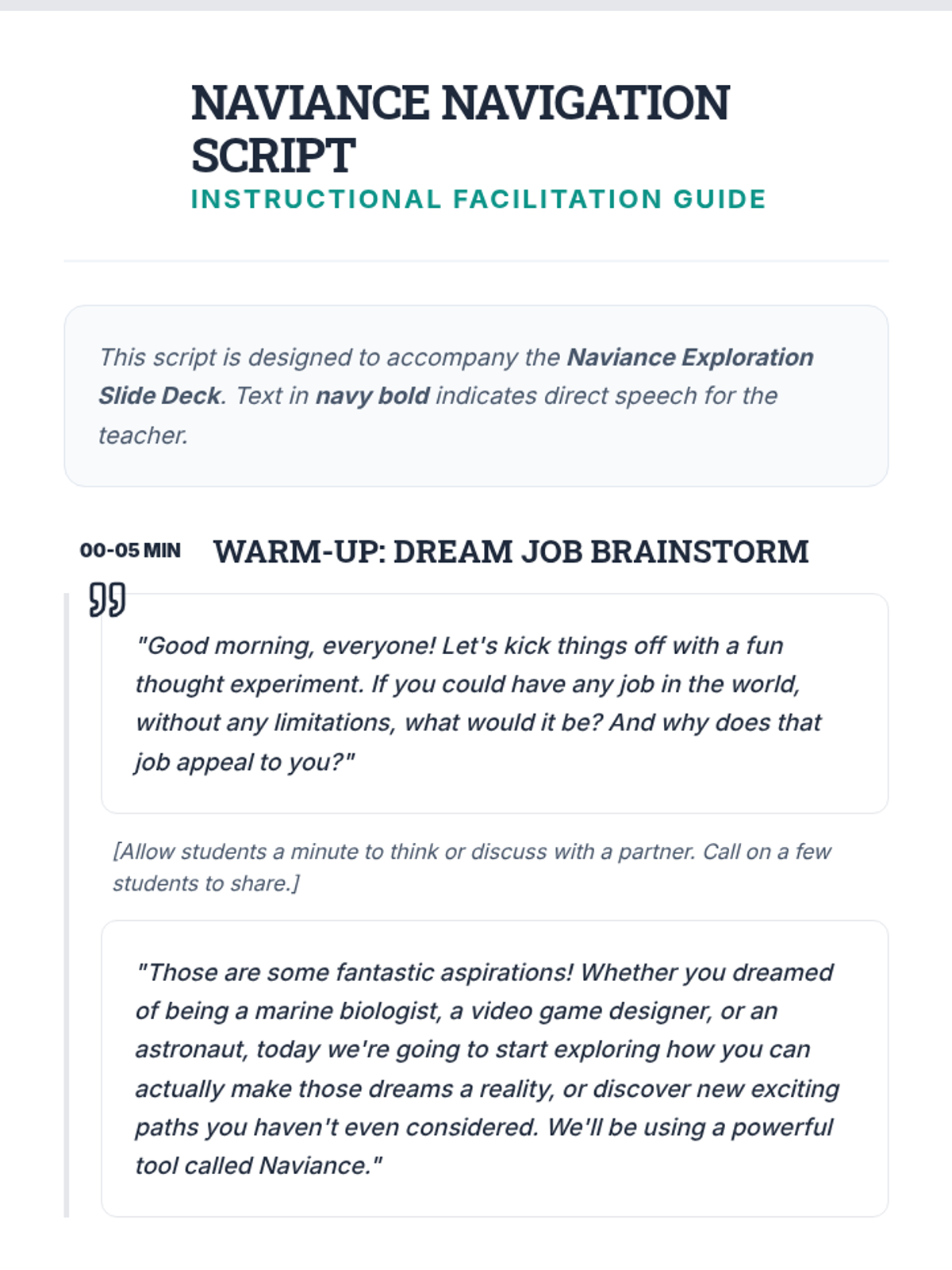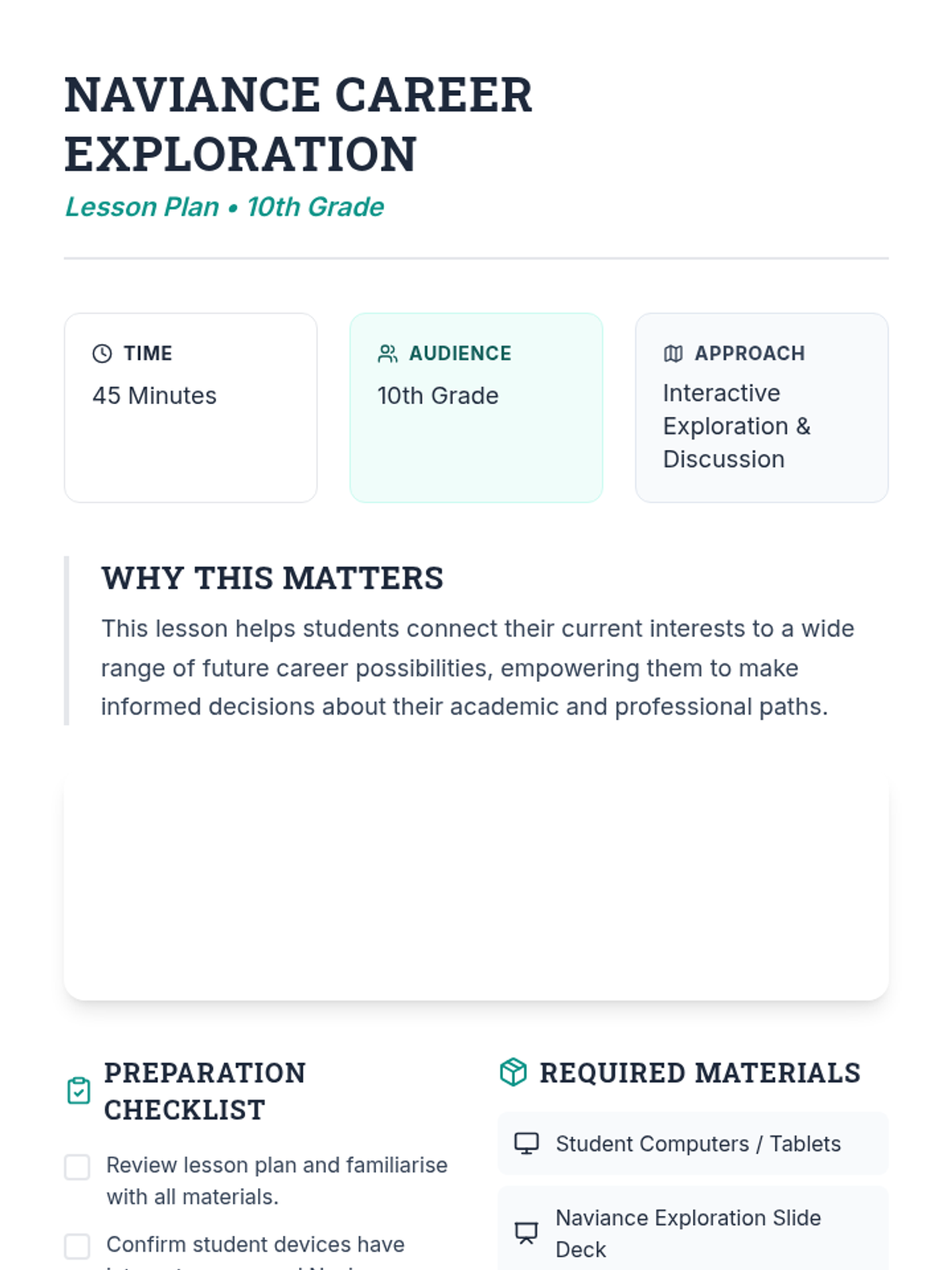 A 45-minute Tier 1 classroom lesson for 10th-grade students focusing on navigating the Naviance platform for career exploration and goal setting.