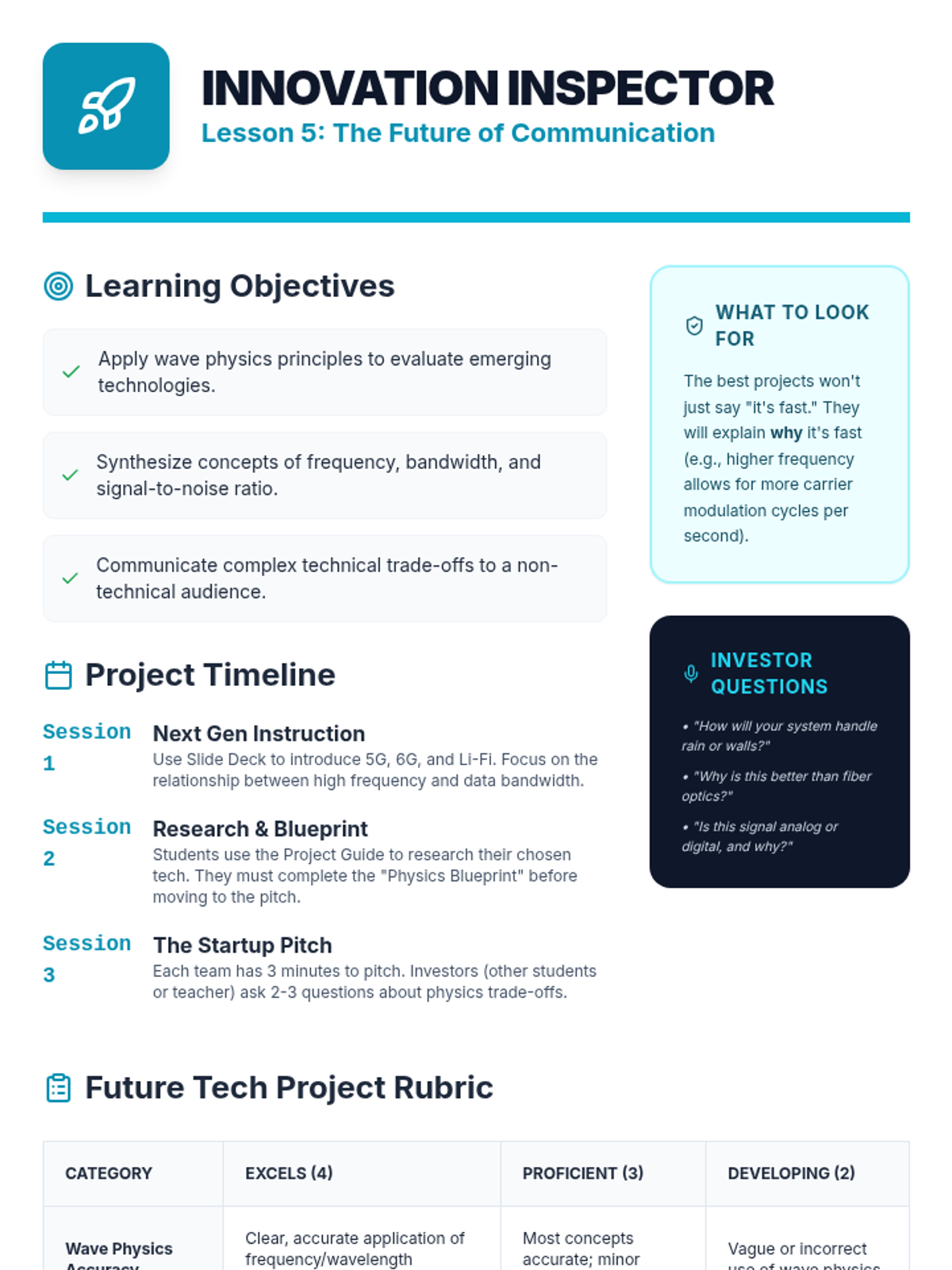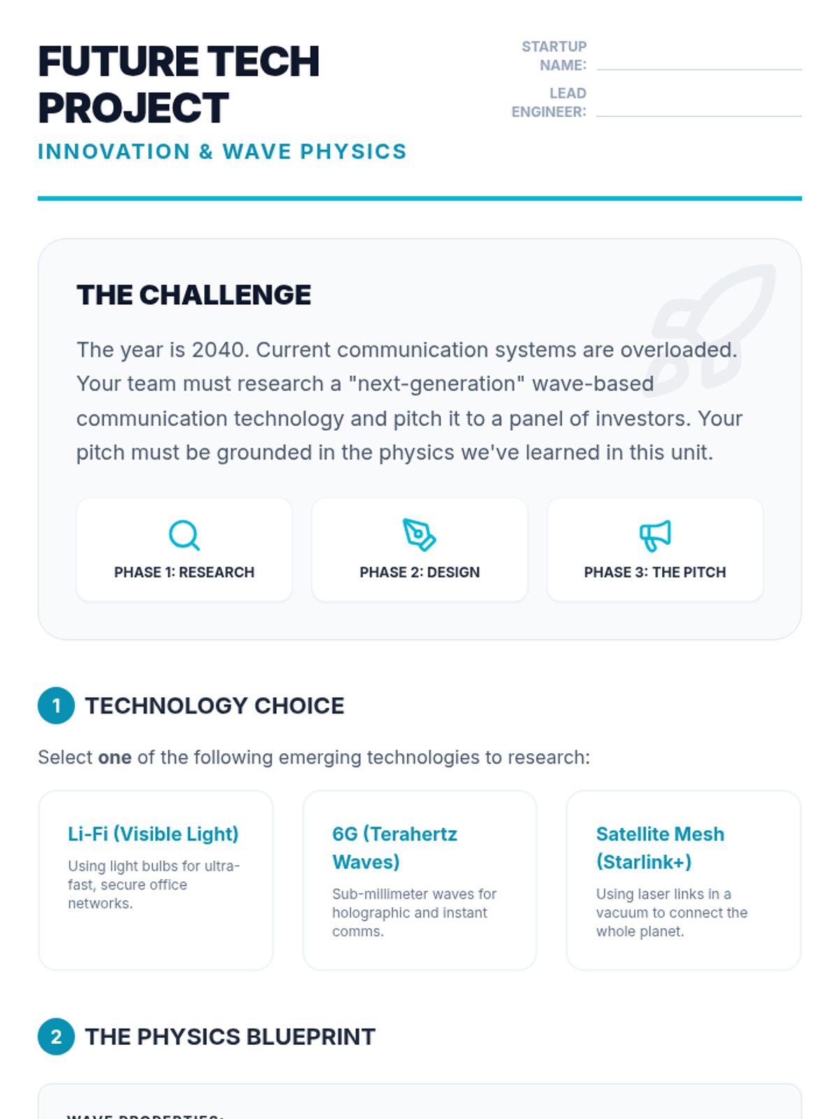 Students research emerging communication technologies like Li-Fi and 5G/6G, applying wave physics to predict future trends.