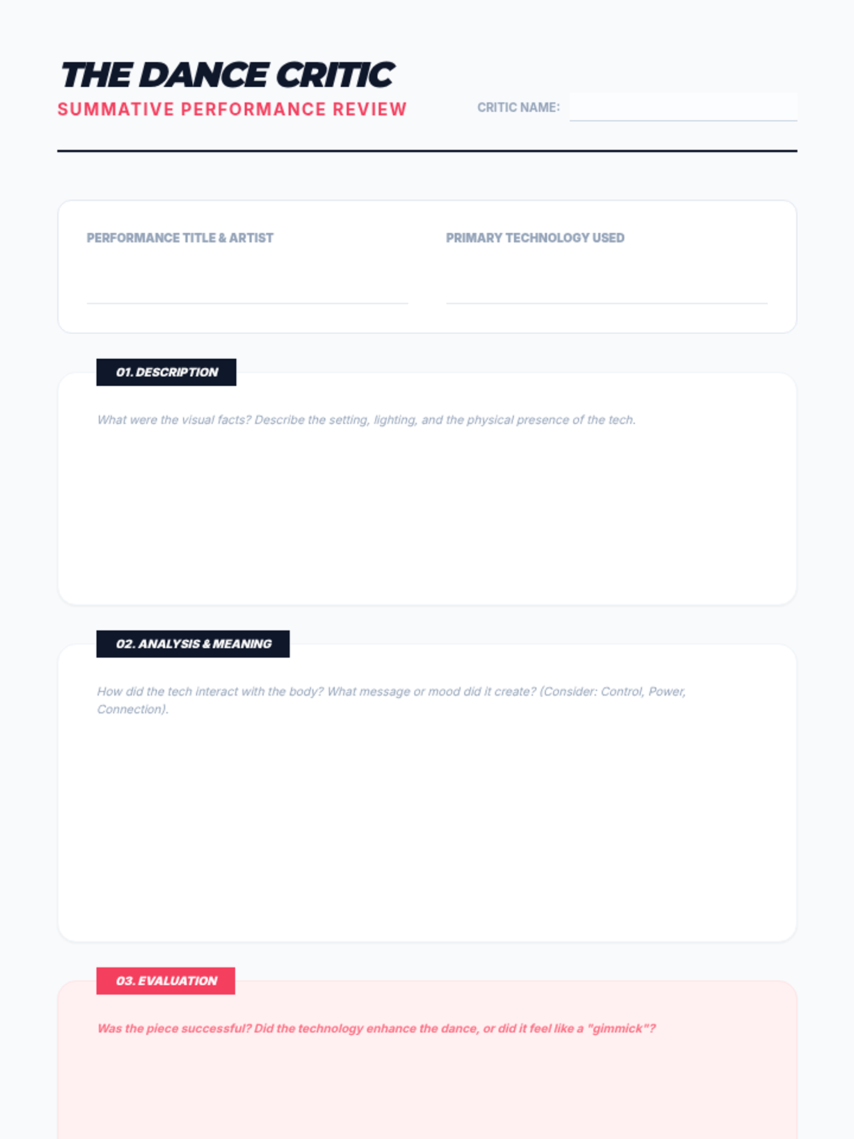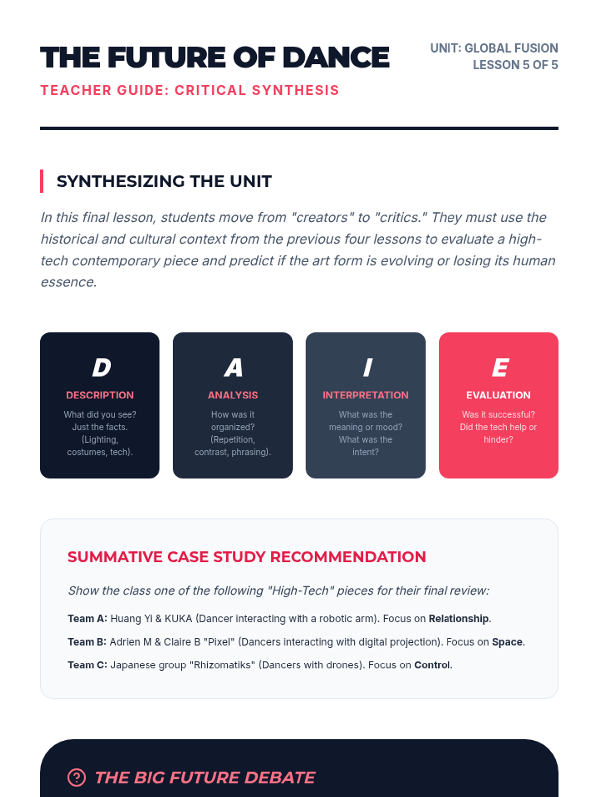Students synthesize their learning by critiquing high-tech contemporary performances and predicting the future of dance in an era of robotics and projection mapping.