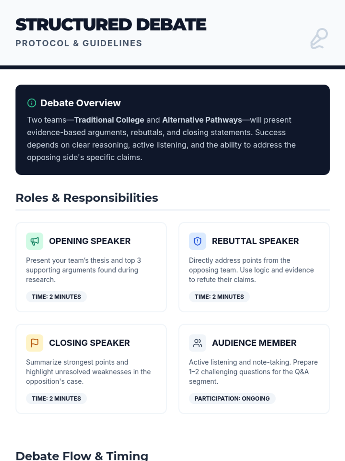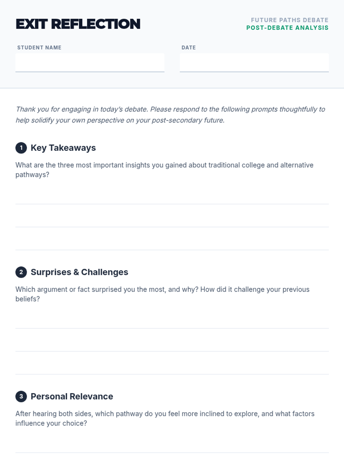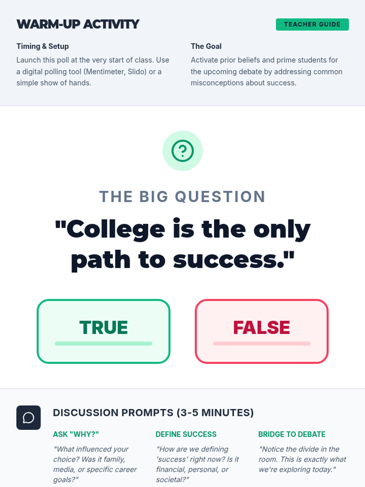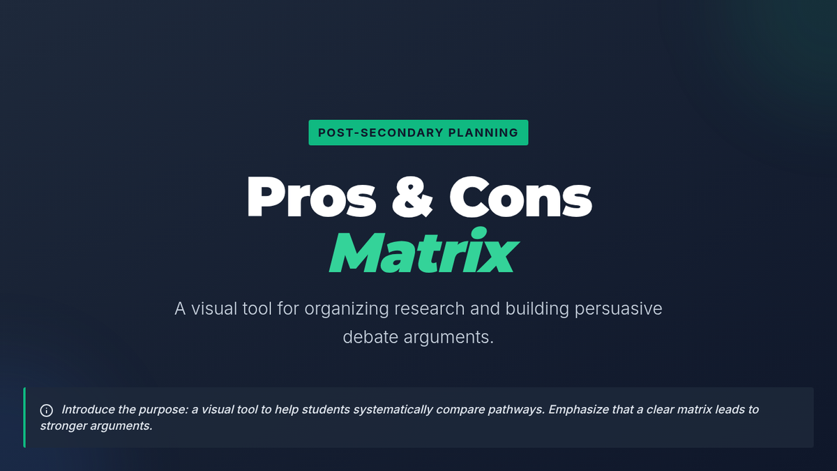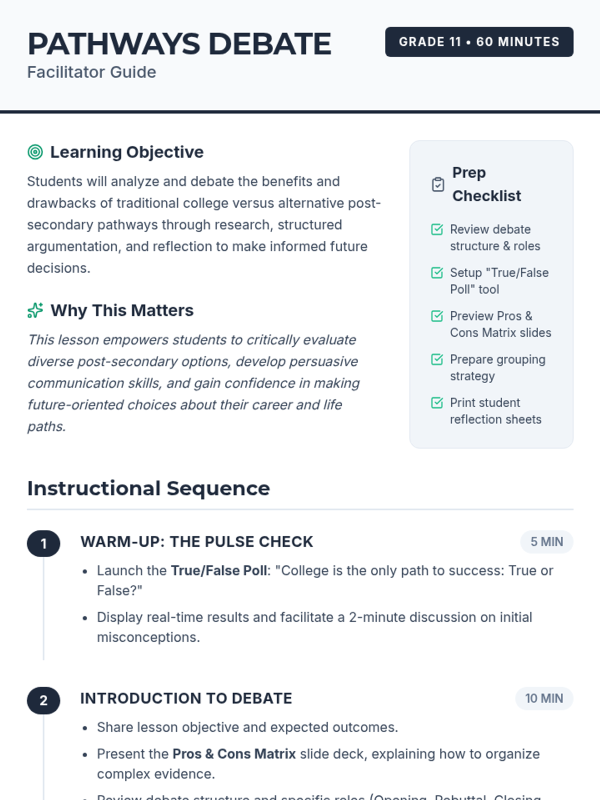 A 60-minute debate lesson for 11th graders to explore the pros and cons of traditional college versus alternative post-secondary pathways. Students engage in research, structured argumentation, and personal reflection to support their future planning.