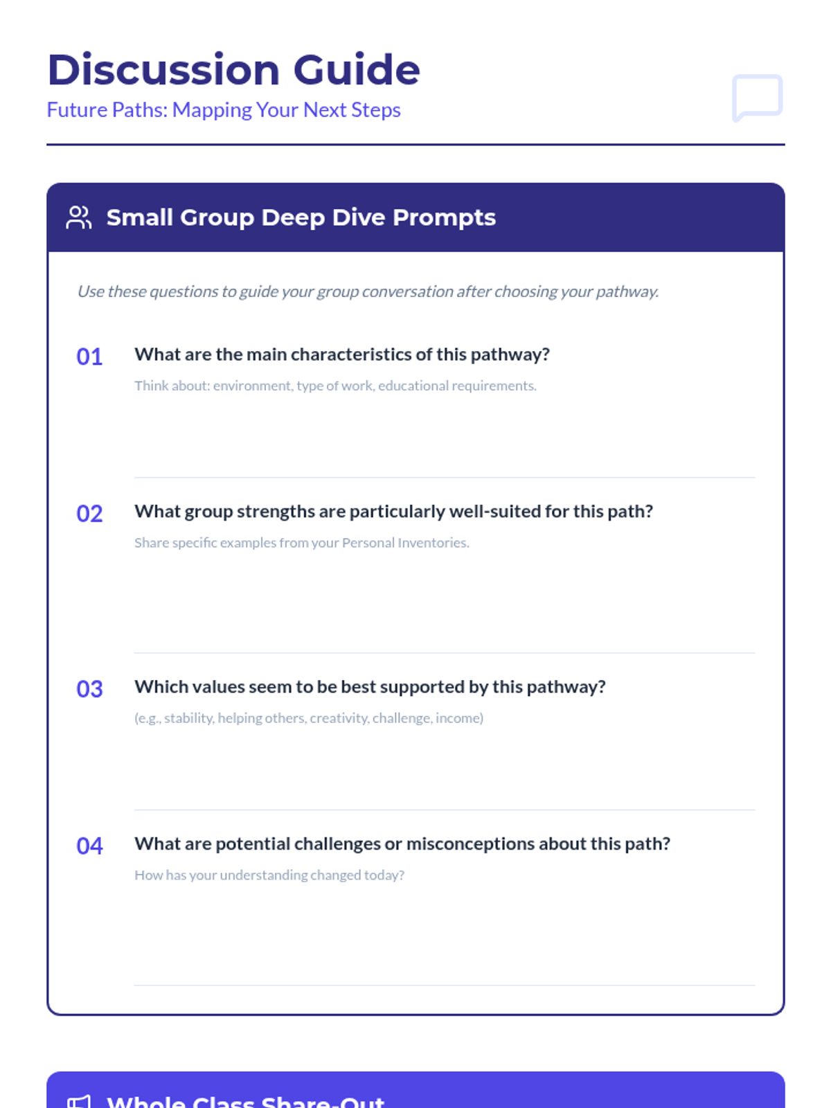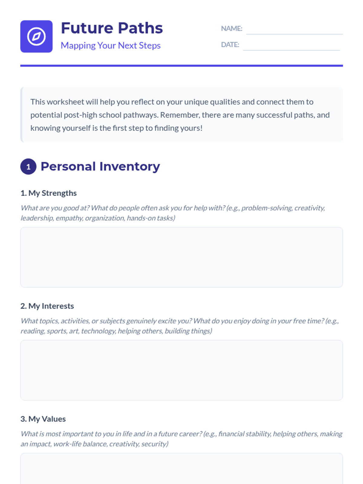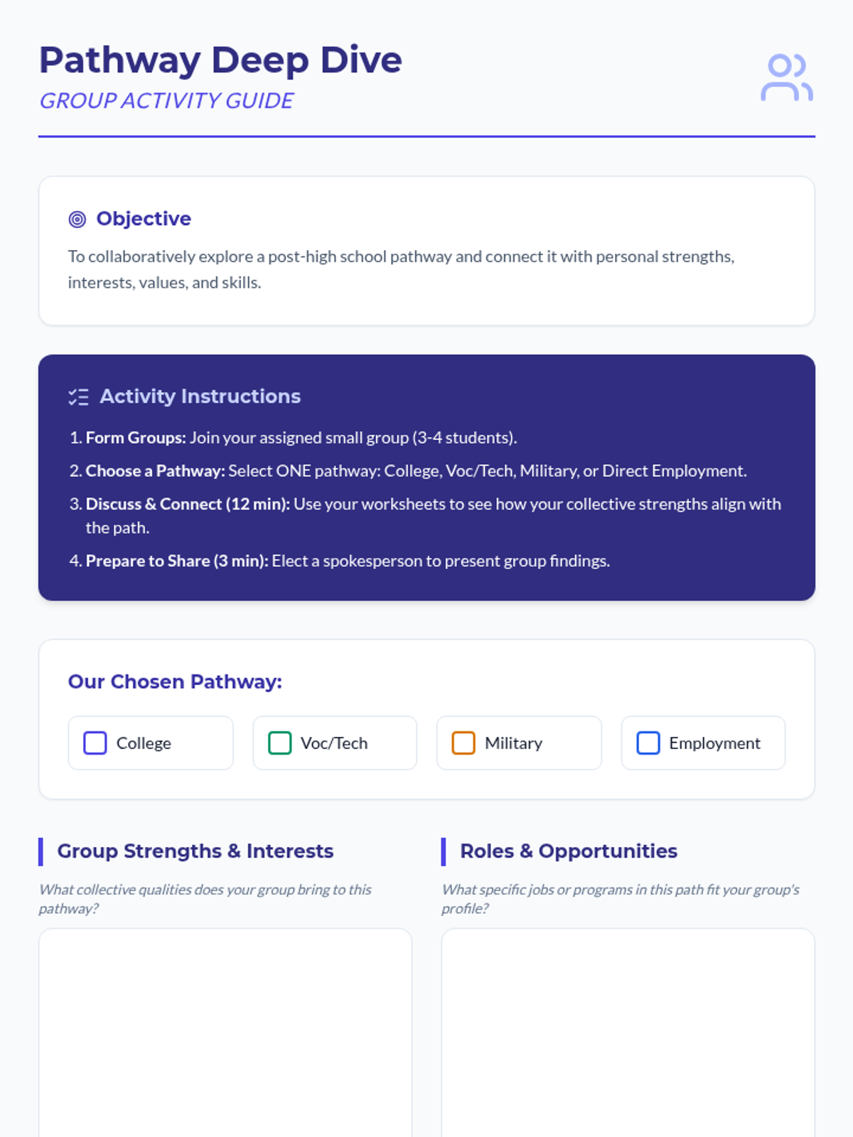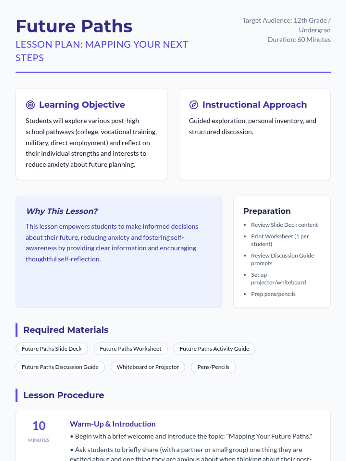 A comprehensive 60-minute lesson designed to help 12th-grade and undergraduate students explore post-high school pathways including college, vocational training, military, and direct employment. Through self-reflection and group discussion, students will identify how their personal strengths align with various career trajectories to reduce future-oriented anxiety.