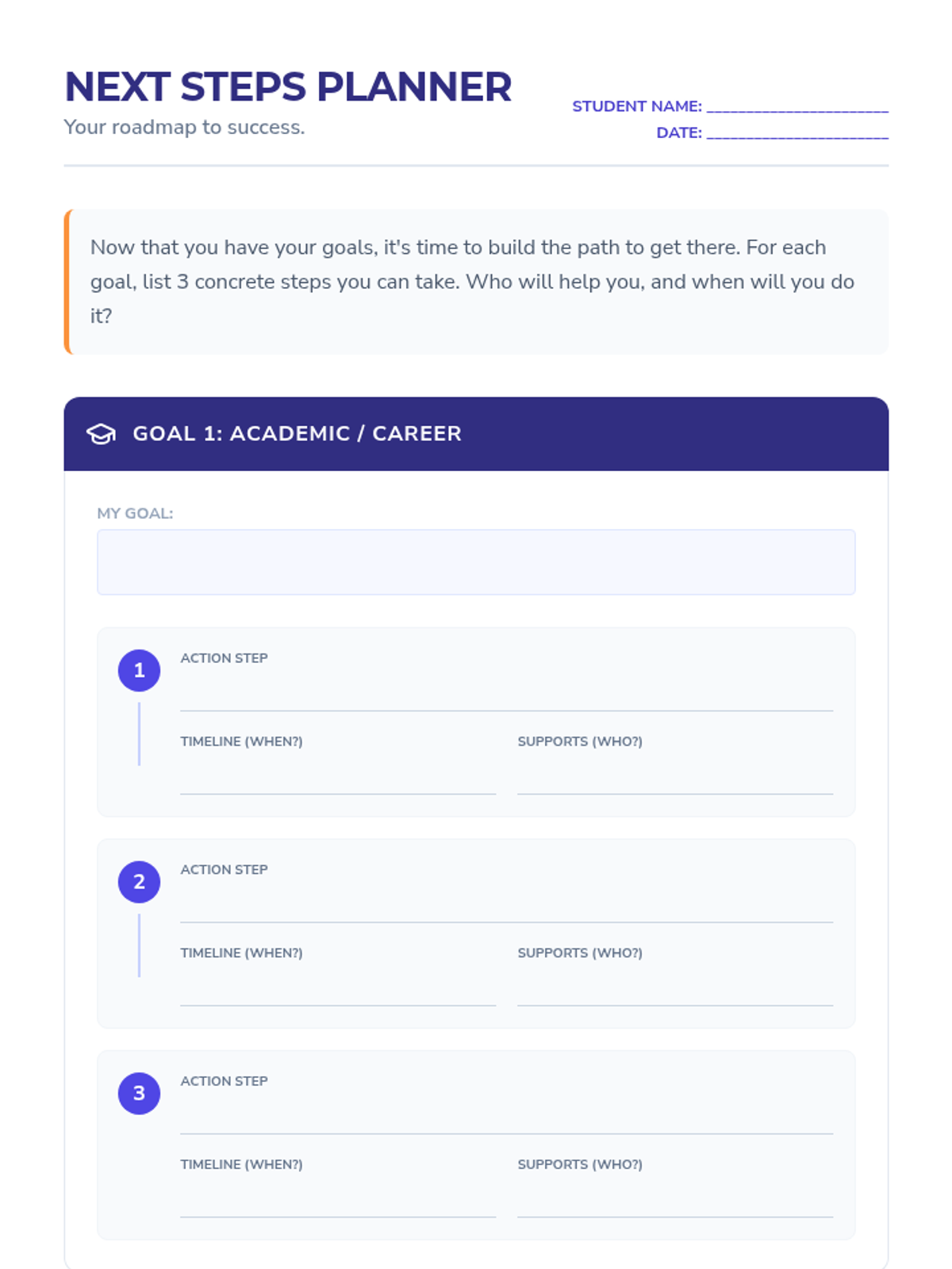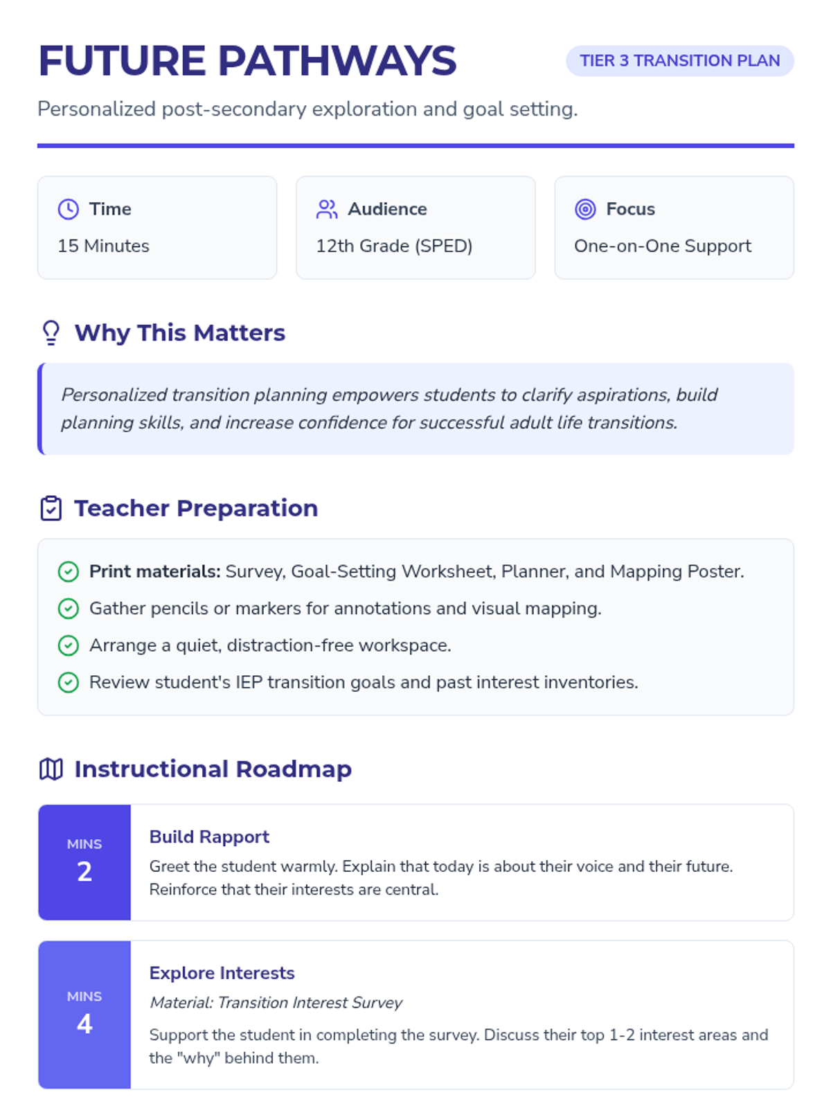 A focused 15-minute Tier 3 transition planning session for 12th-grade special education students to explore post-high school goals and actionable next steps.