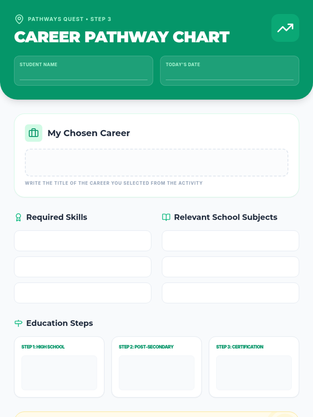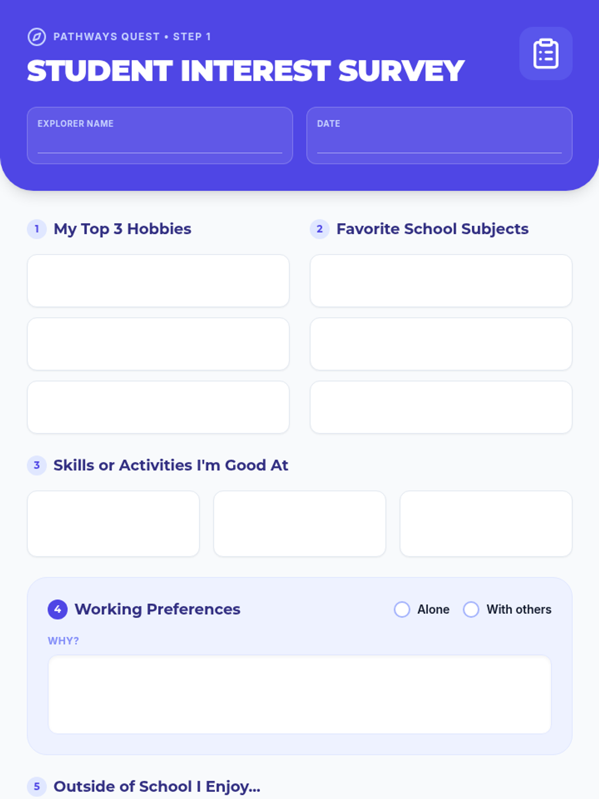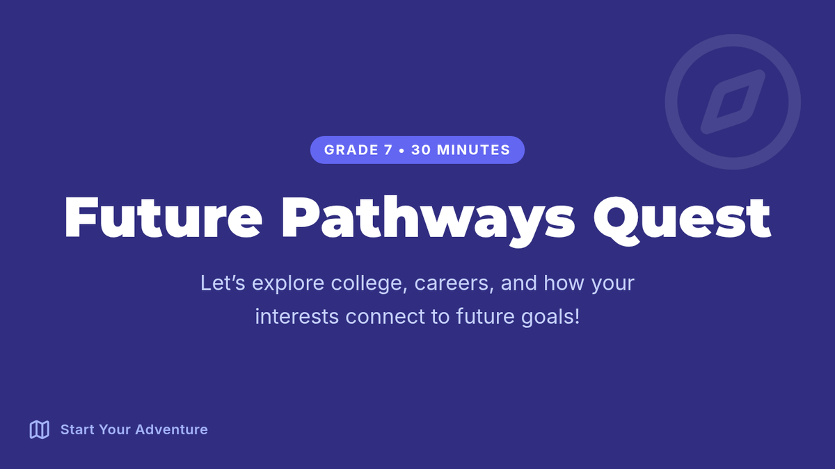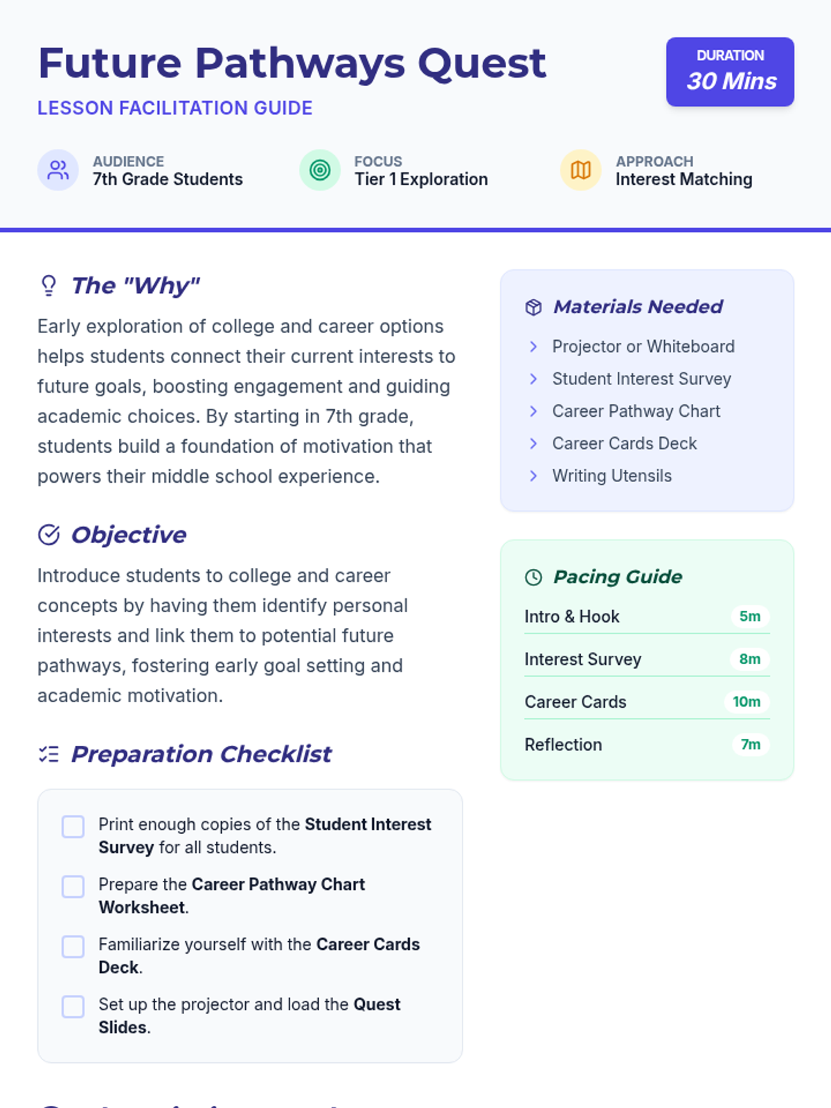 A 30-minute introductory session for 7th graders to explore college and career pathways by linking personal interests to future goals. Students engage in self-reflection and group activities to foster academic motivation.