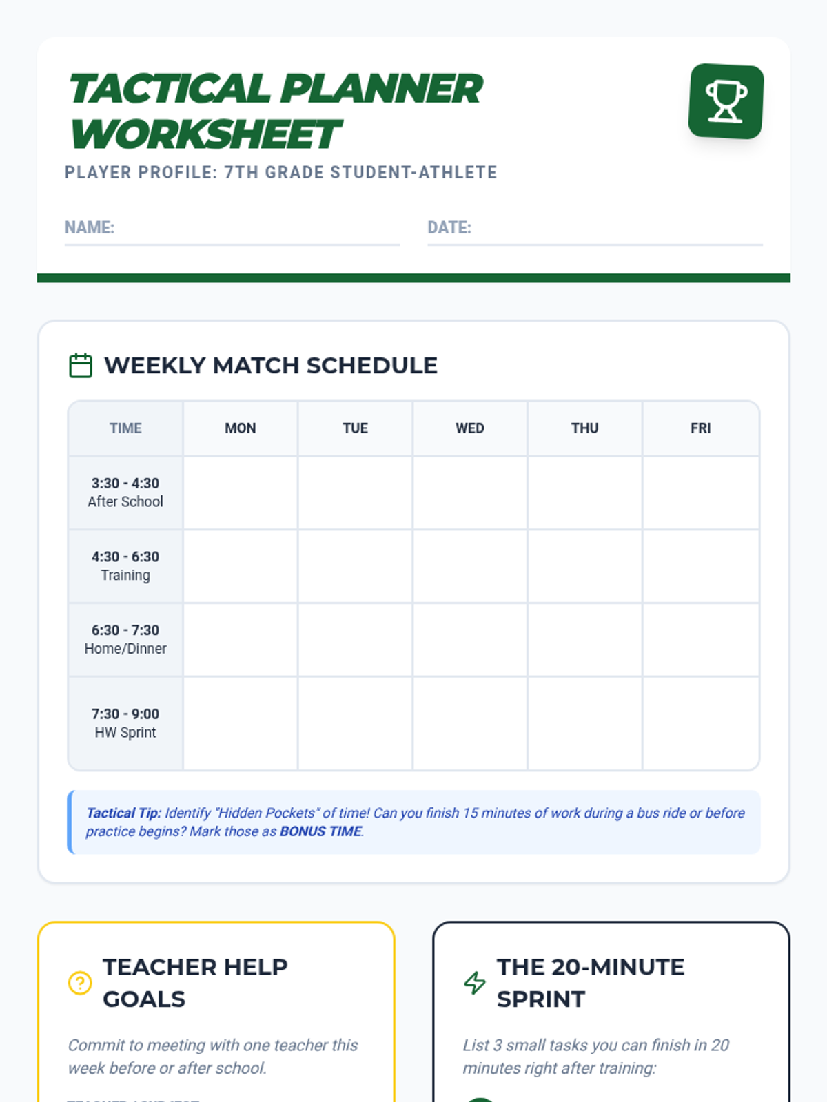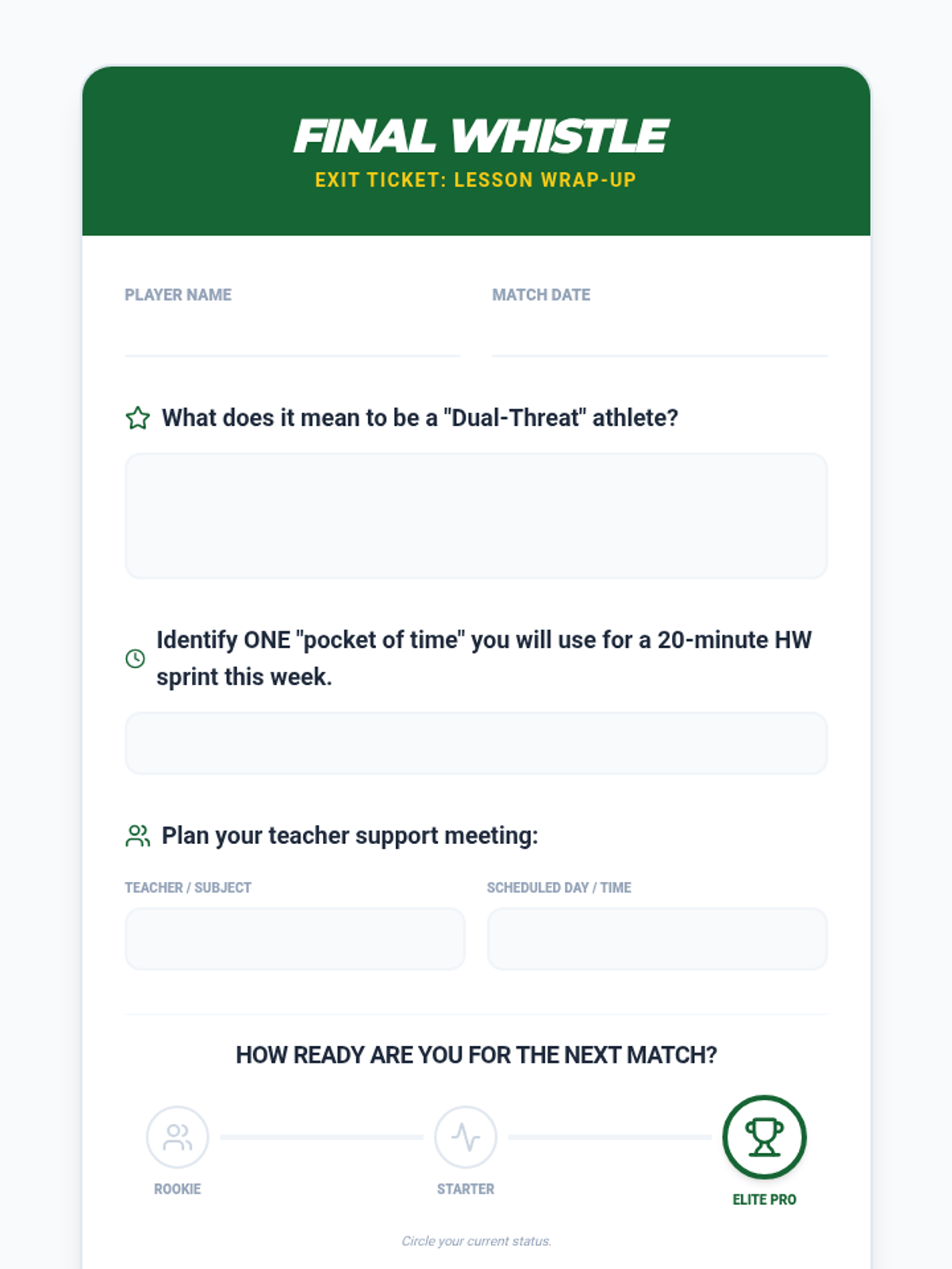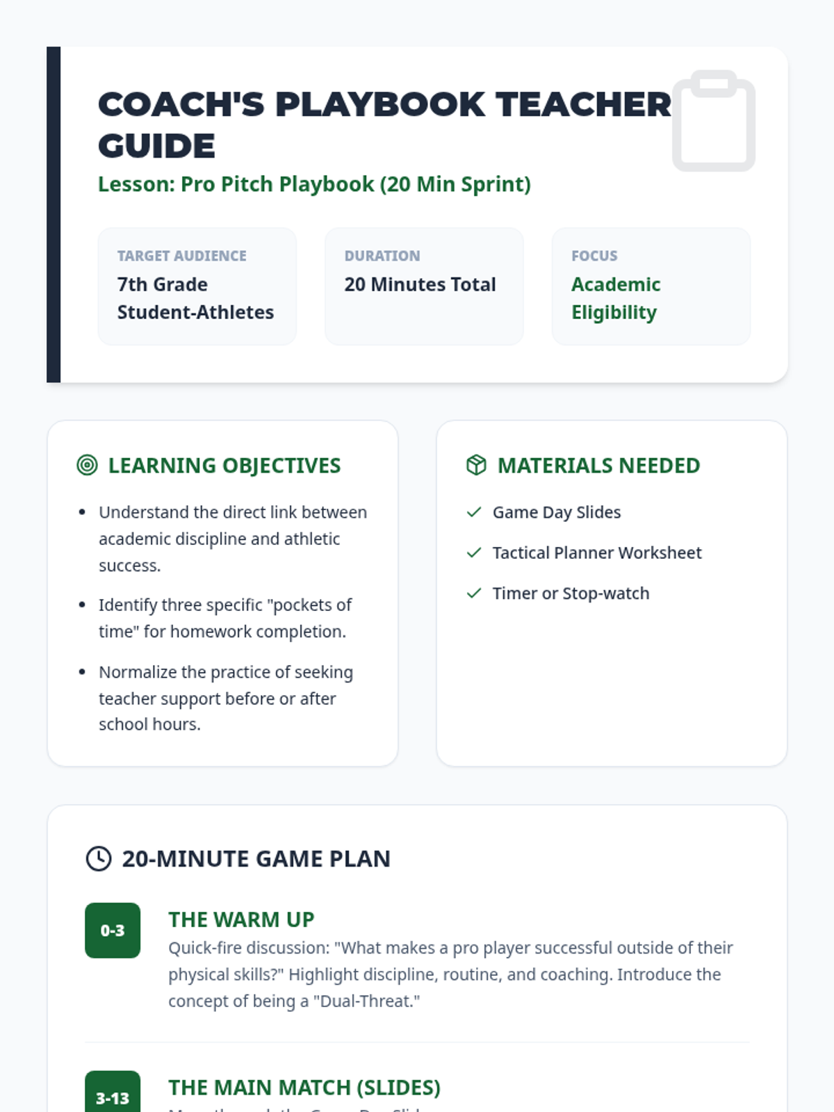 A fast-paced, soccer-themed lesson designed to help student-athletes master their schedule, prioritize homework, and utilize teacher support to maintain academic eligibility and success.