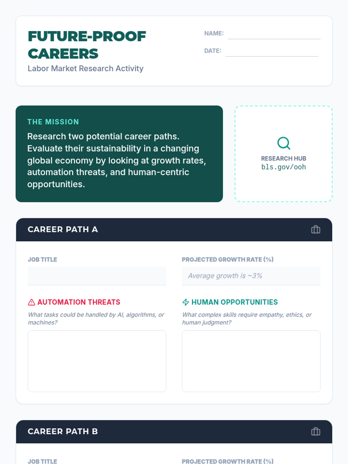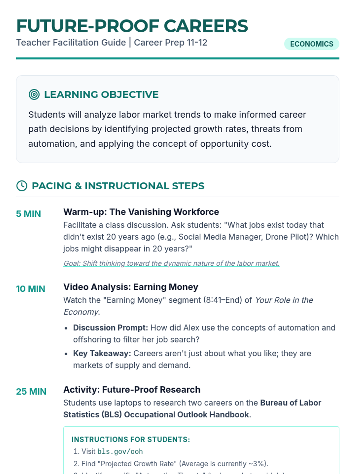Students will investigate labor market trends using Bureau of Labor Statistics data to analyze career sustainability. The lesson focuses on identifying 'future-proof' careers by weighing the impacts of automation and offshoring while applying the concept of opportunity cost to career decision-making.