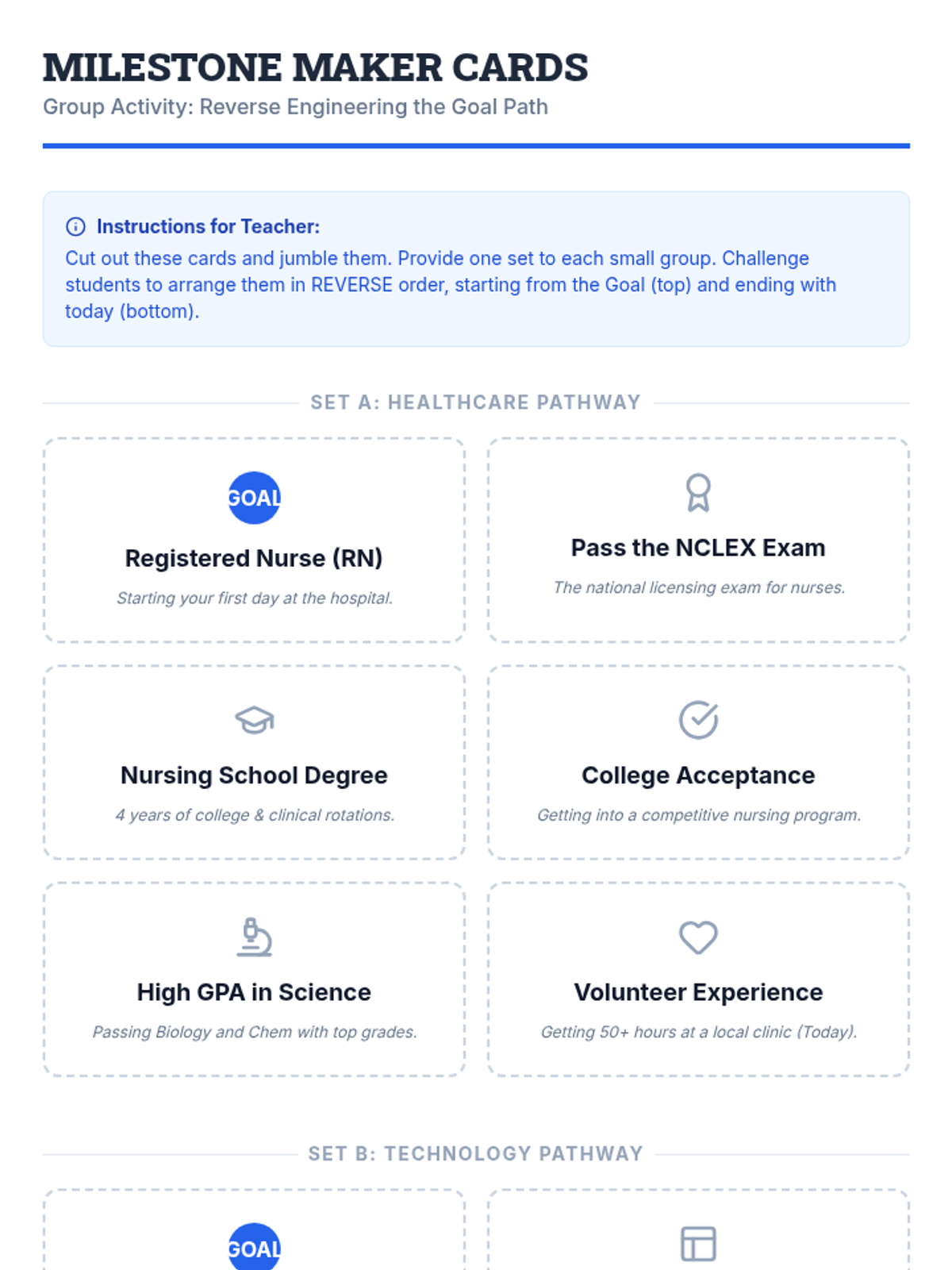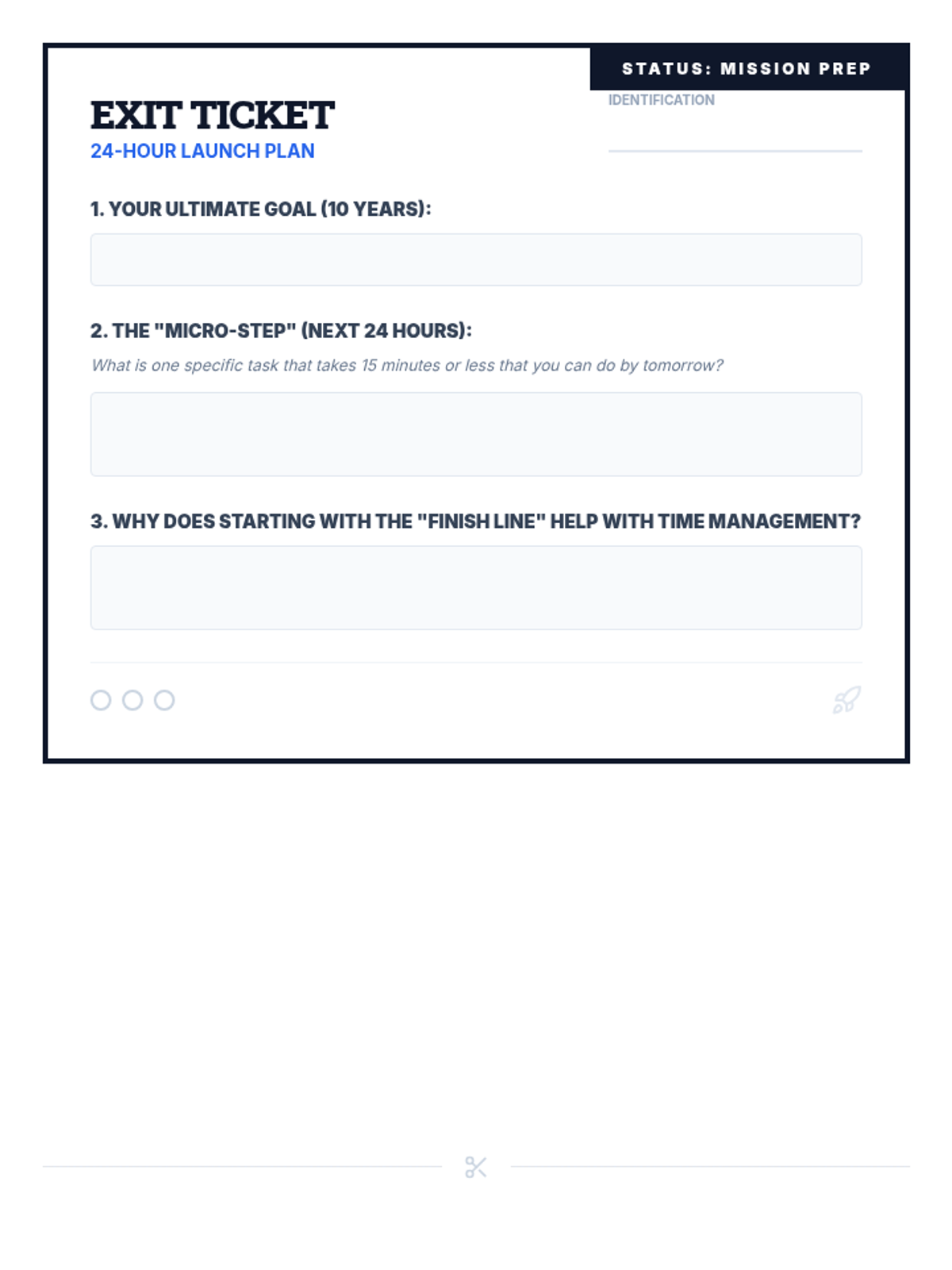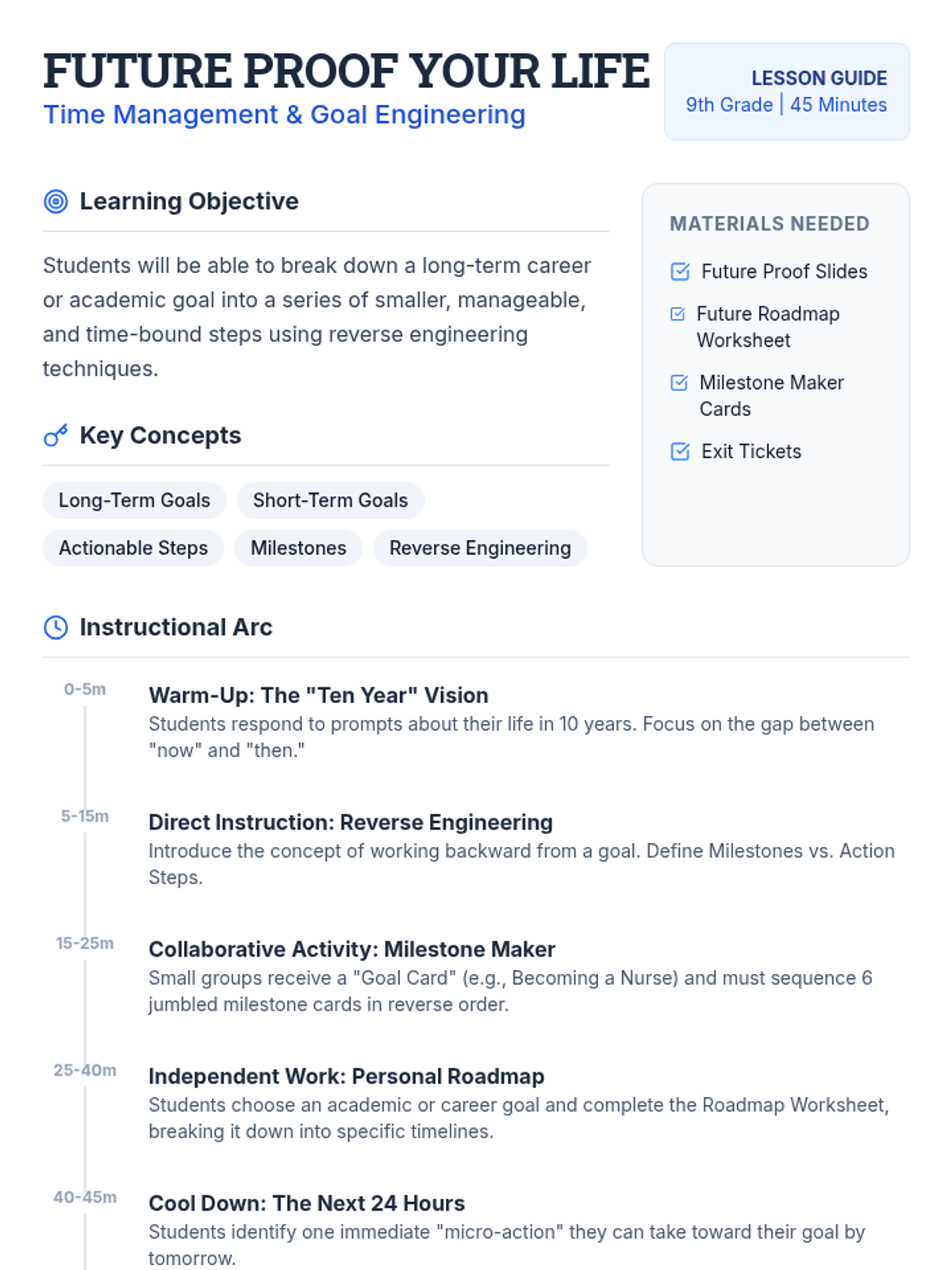 A comprehensive lesson for 9th graders on time management and goal decomposition using reverse engineering techniques. Students learn to transform big dreams into actionable blueprints for college and career success.
