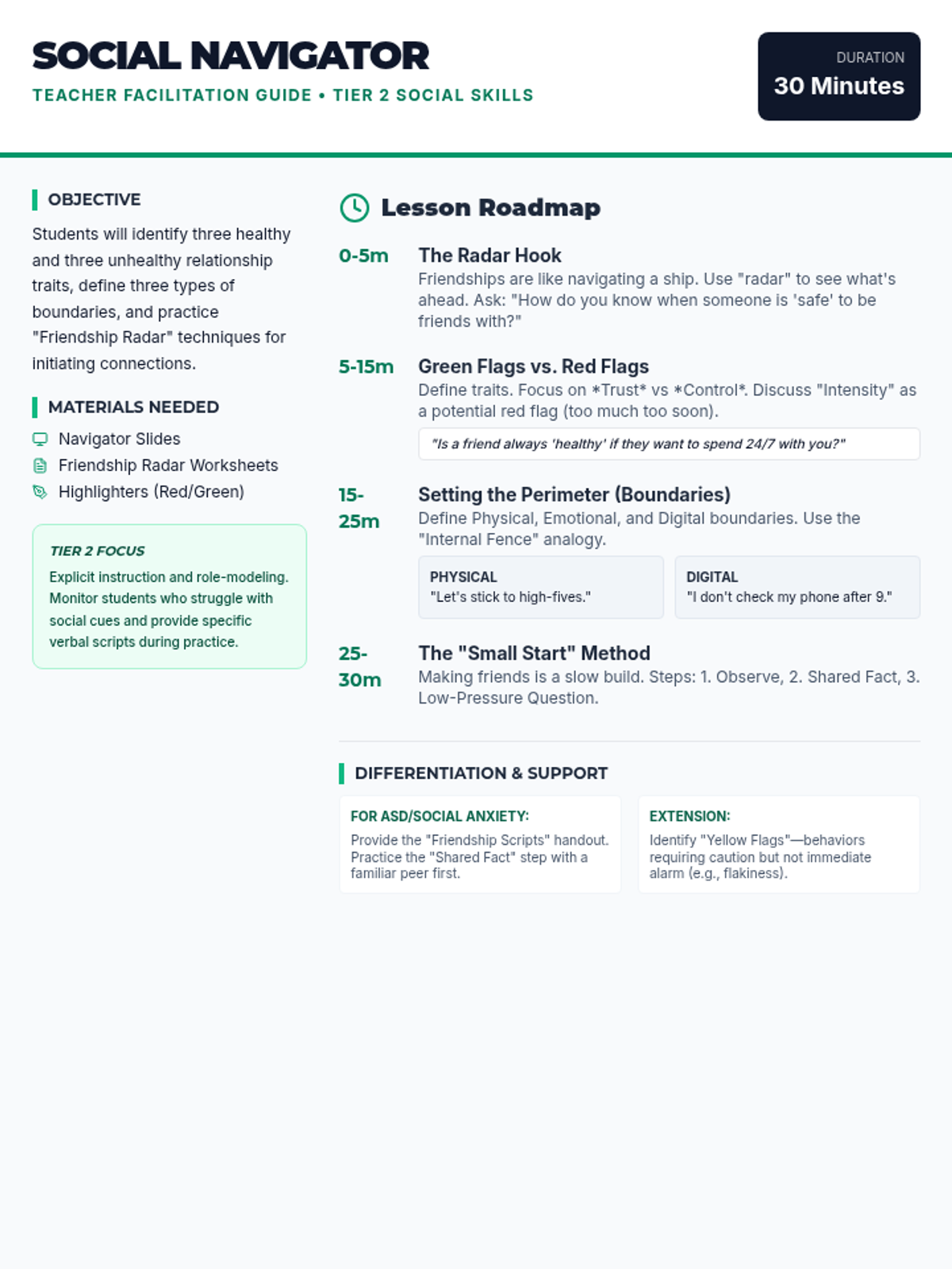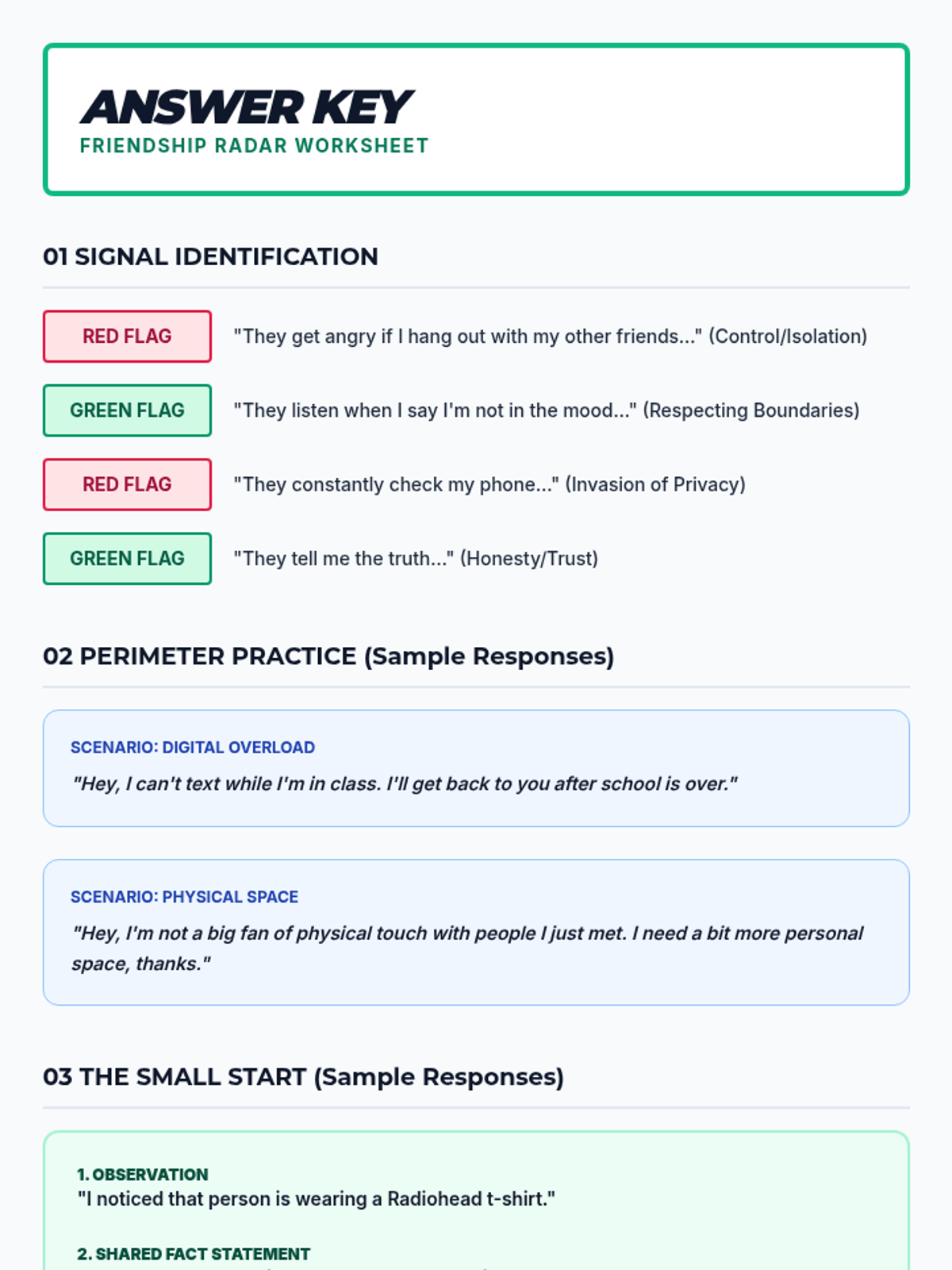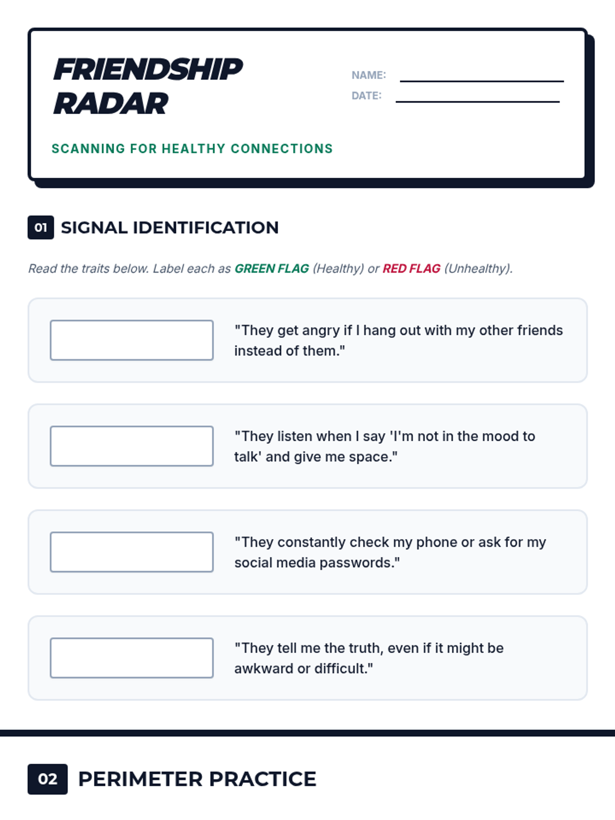 A 30-minute targeted lesson for high school students focusing on distinguishing healthy from unhealthy relationship traits, establishing personal boundaries, and the mechanics of making friends.