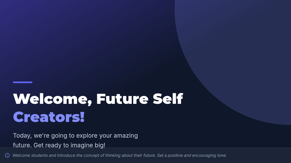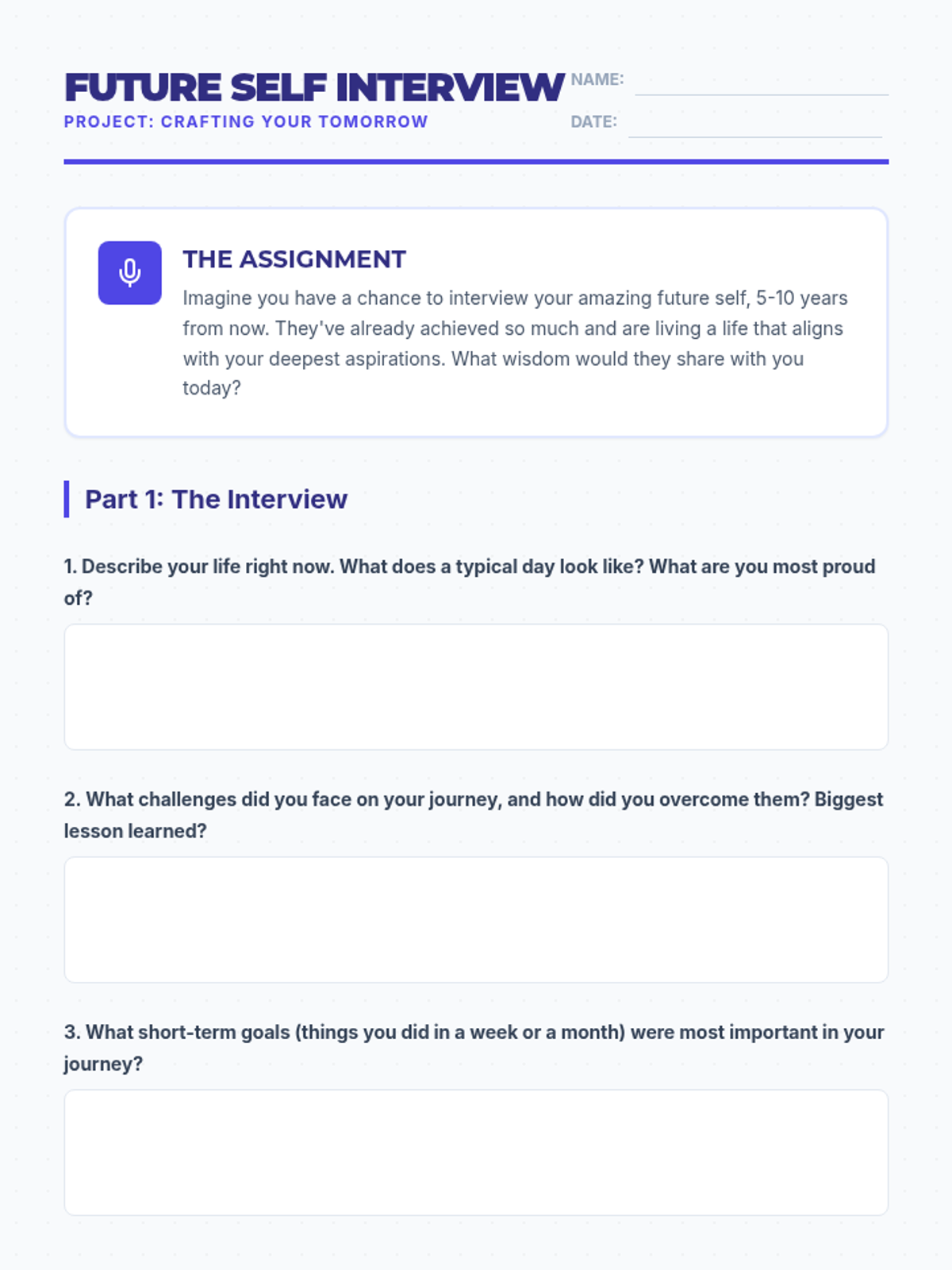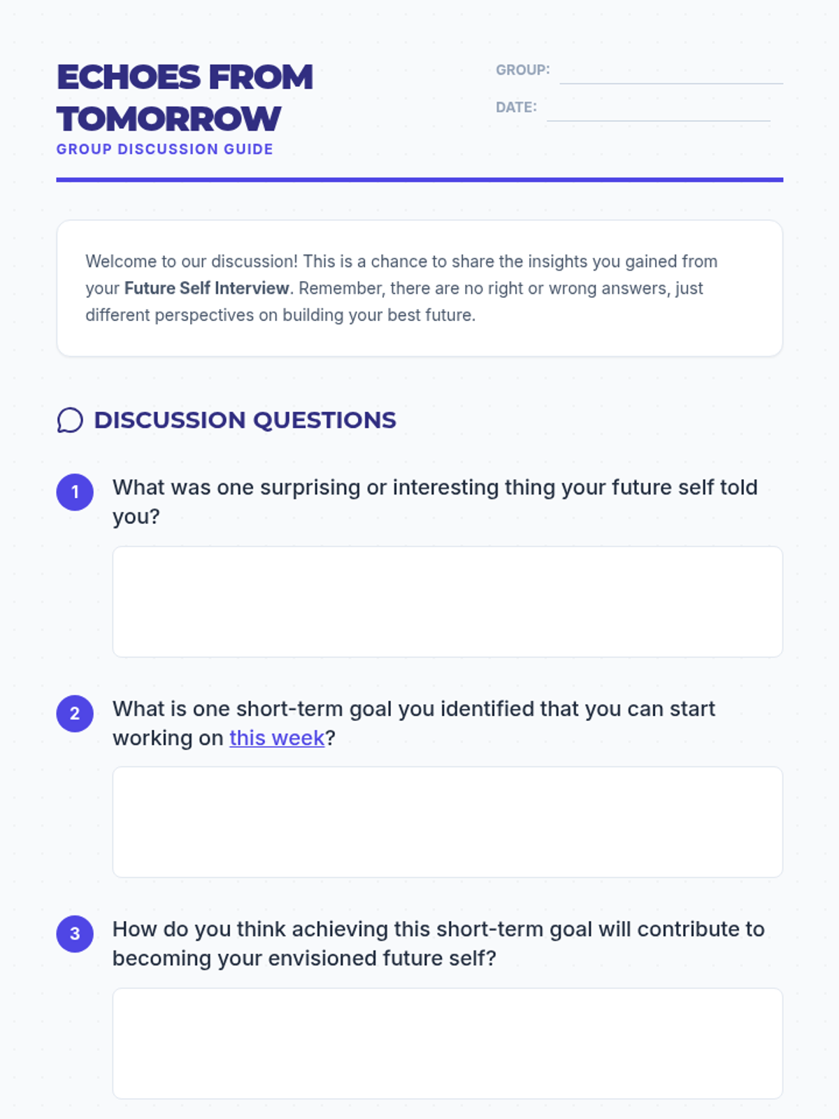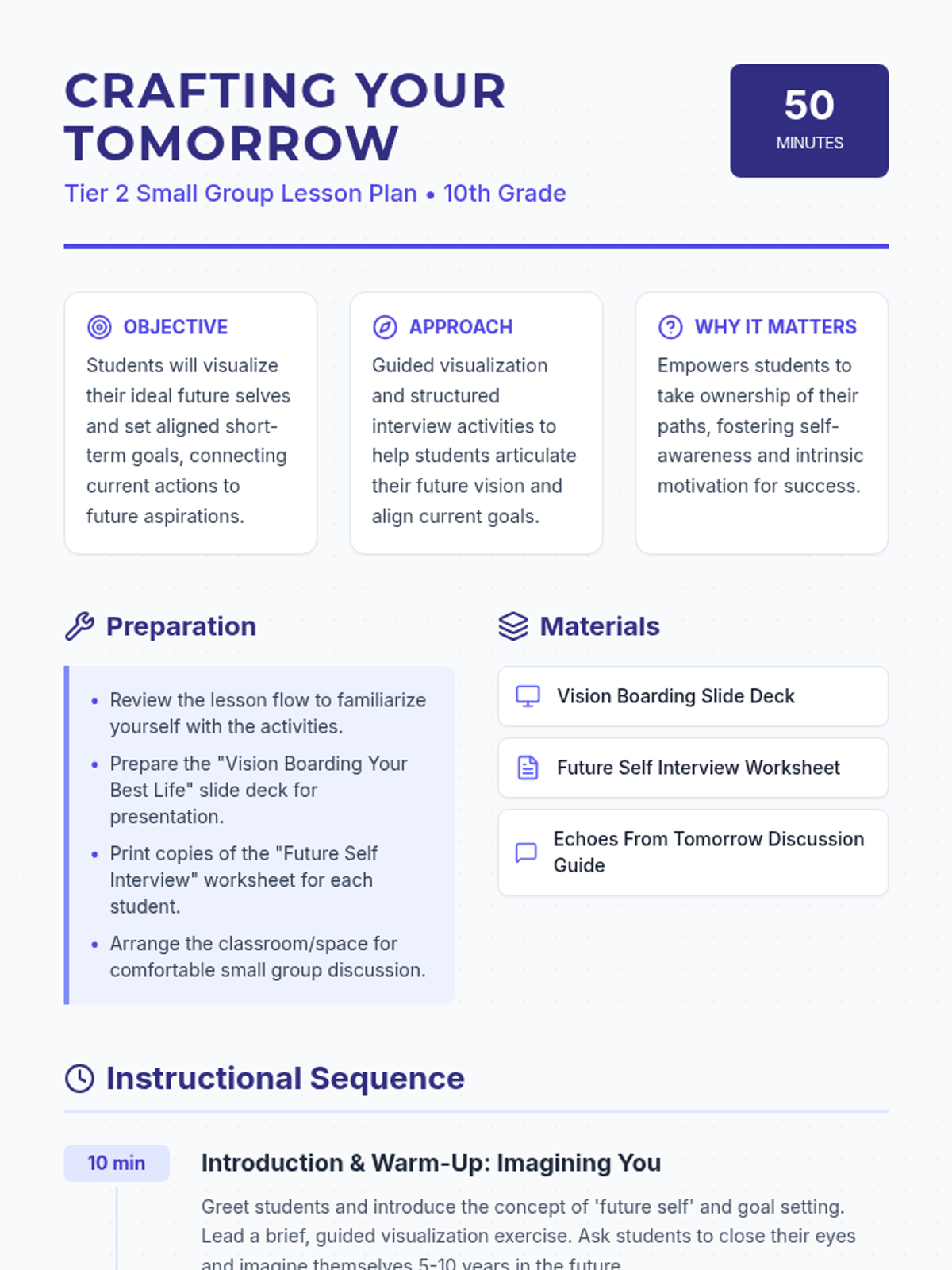 A 50-minute Tier 2 small group lesson for 10th-grade students focused on visualizing their ideal future selves and setting aligned short-term goals. Through guided visualization and a 'future self' interview, students connect current actions to long-term aspirations.