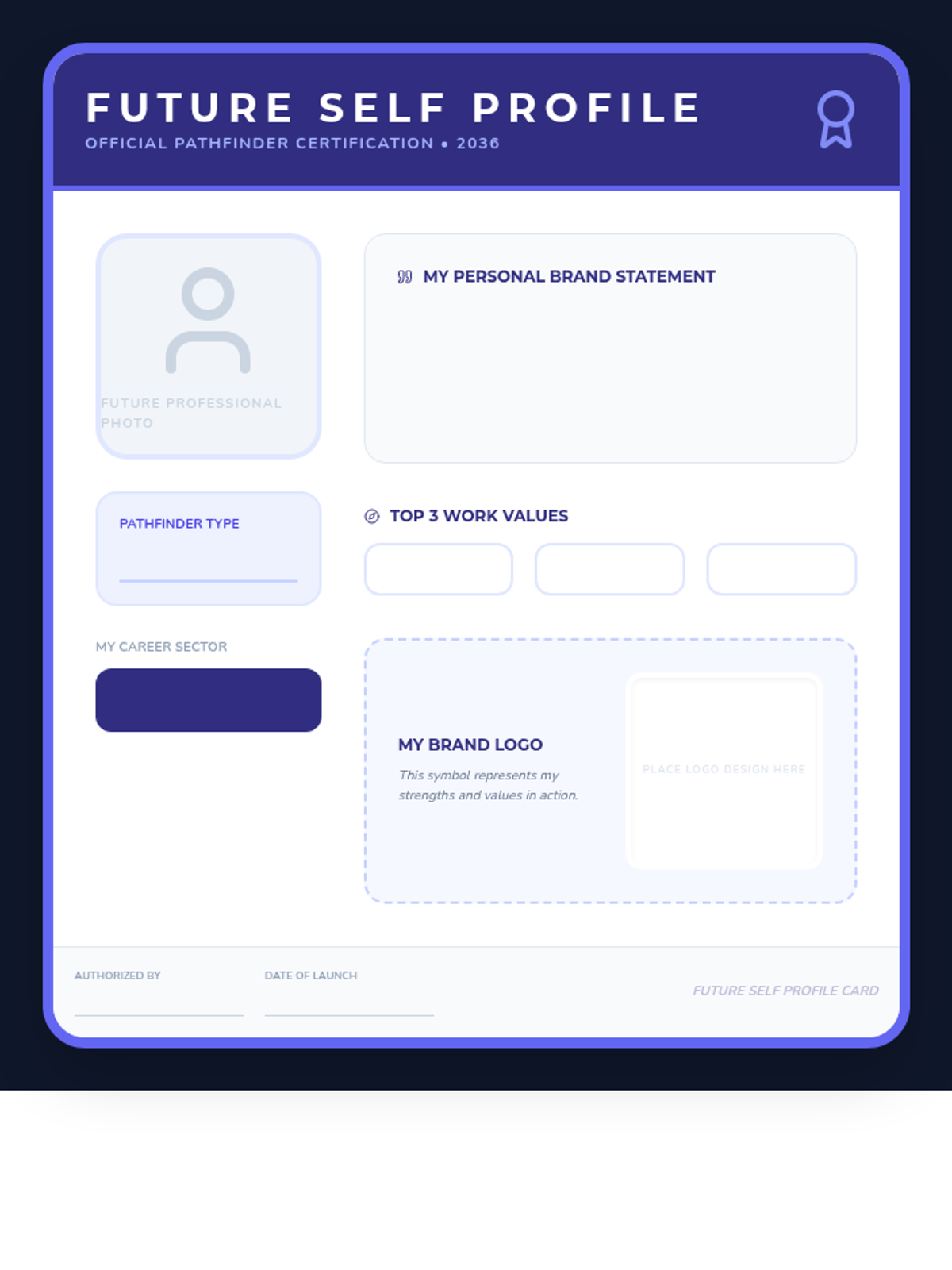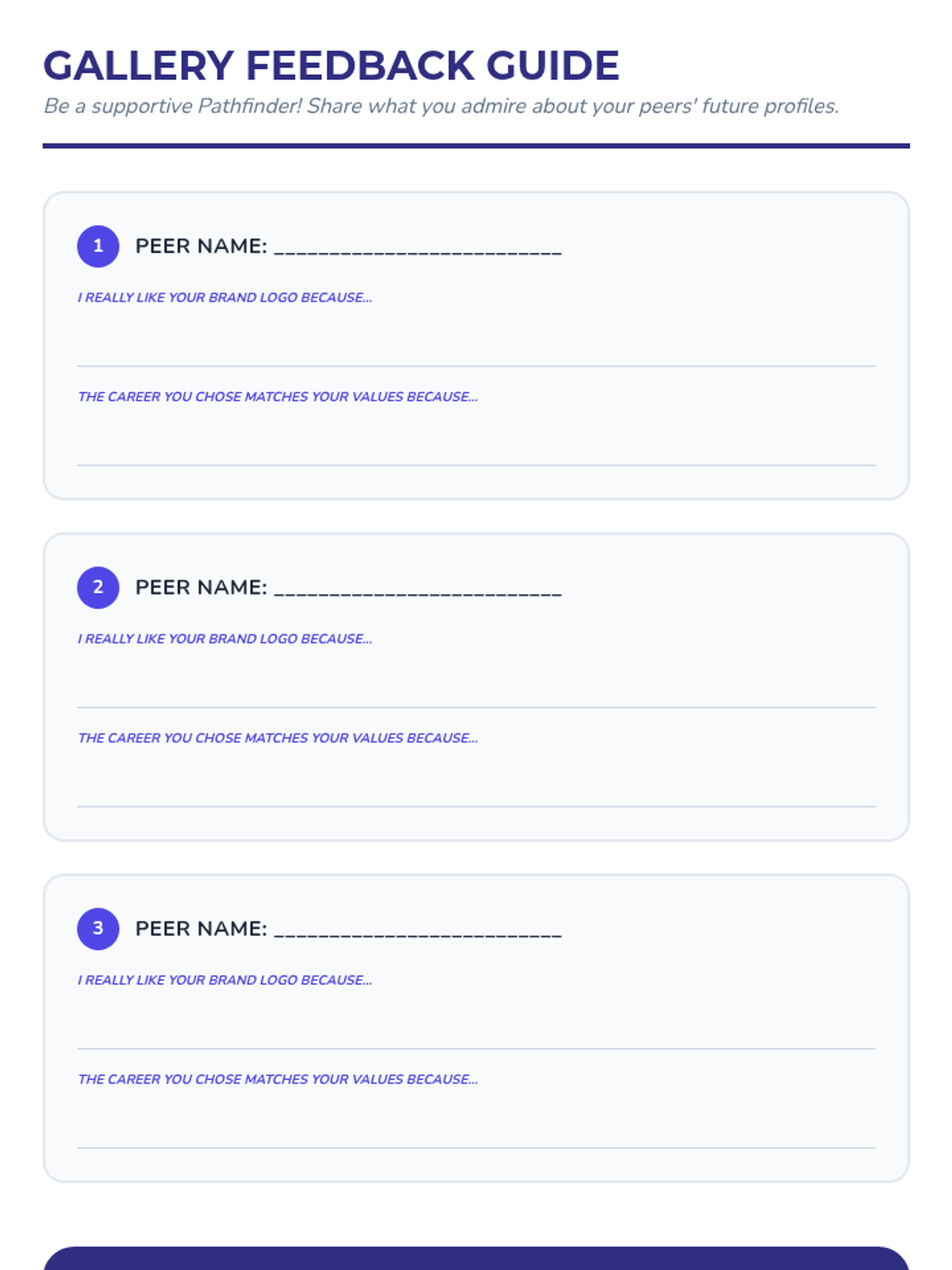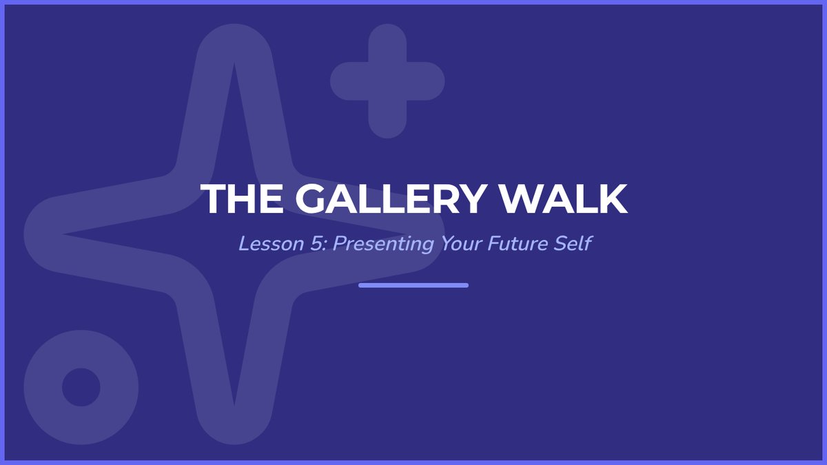 Students create and present a 'Future Self' profile card in a gallery walk, articulating their journey from interests to career possibilities.