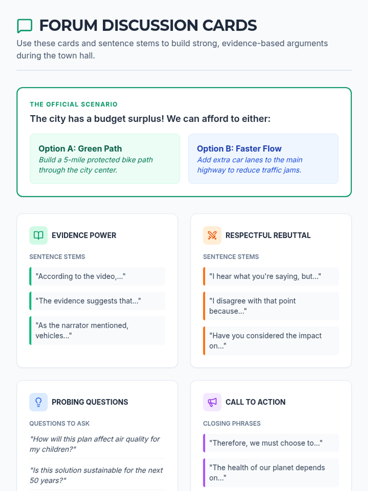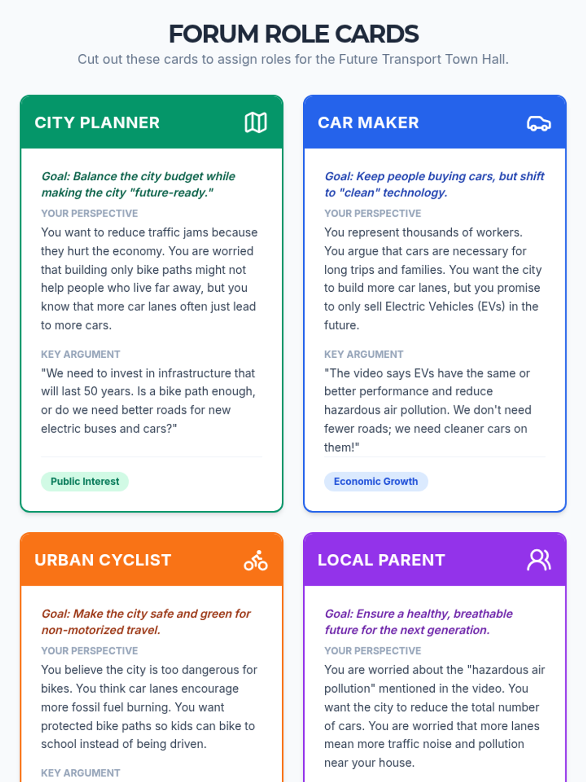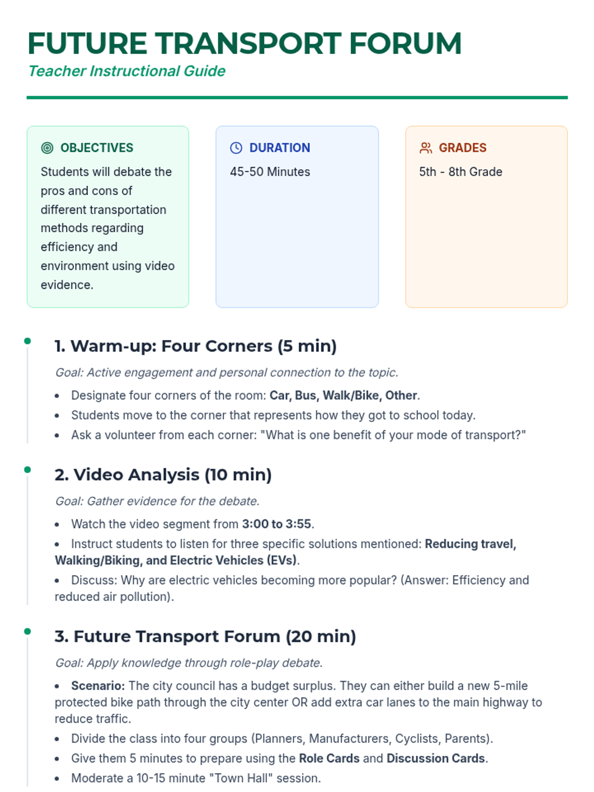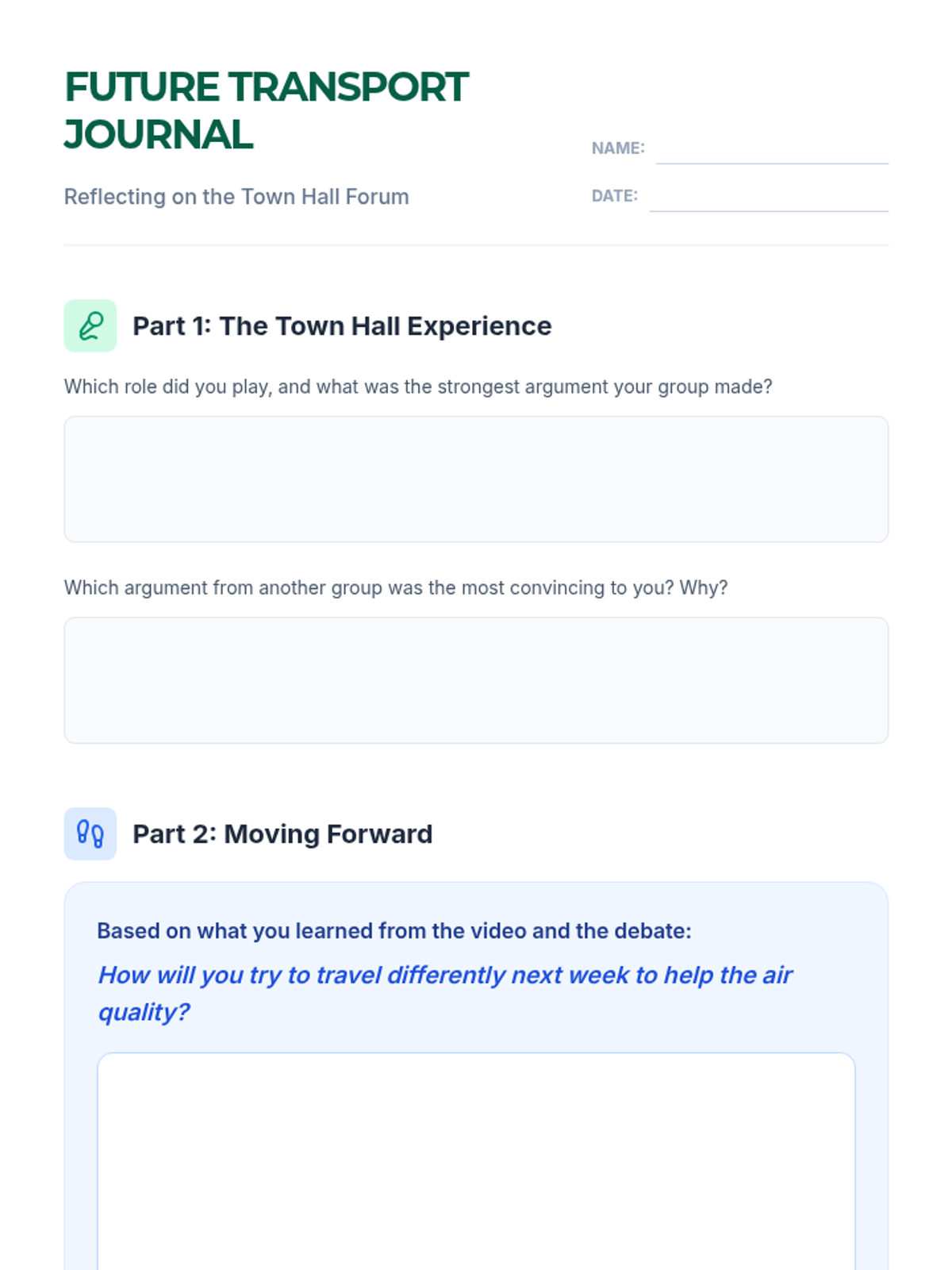 Students investigate the environmental impact of transportation and engage in a town hall debate to decide the future of city infrastructure using evidence from a video on greenhouse gas emissions.