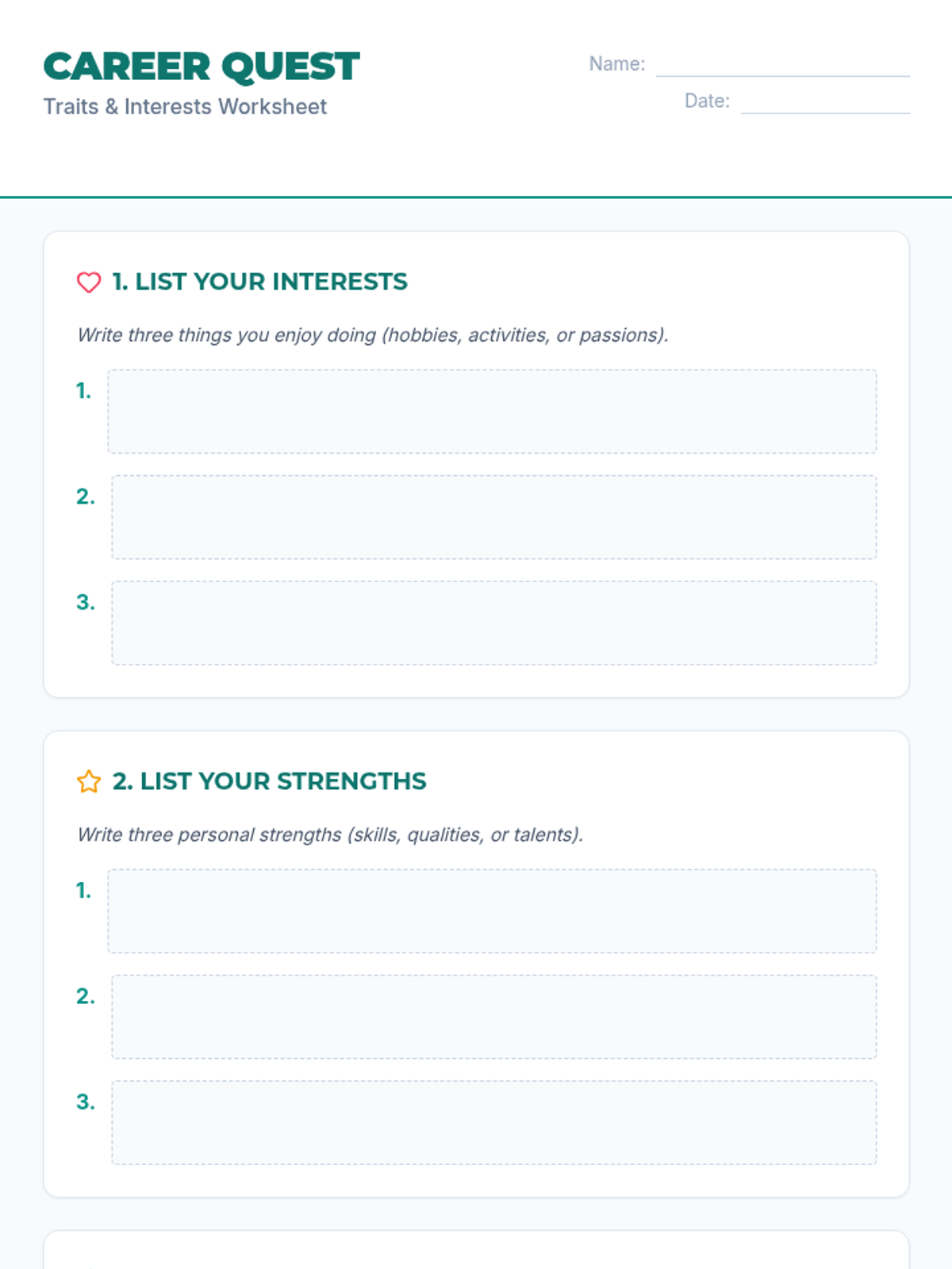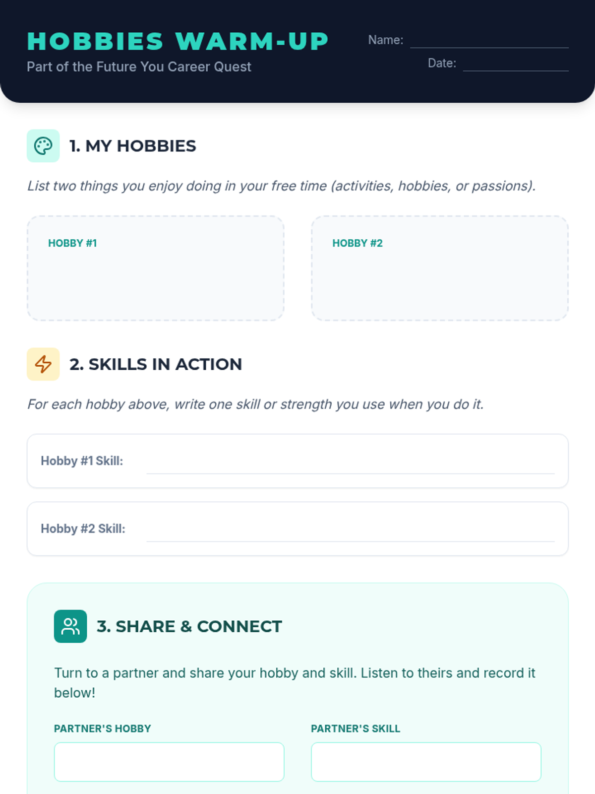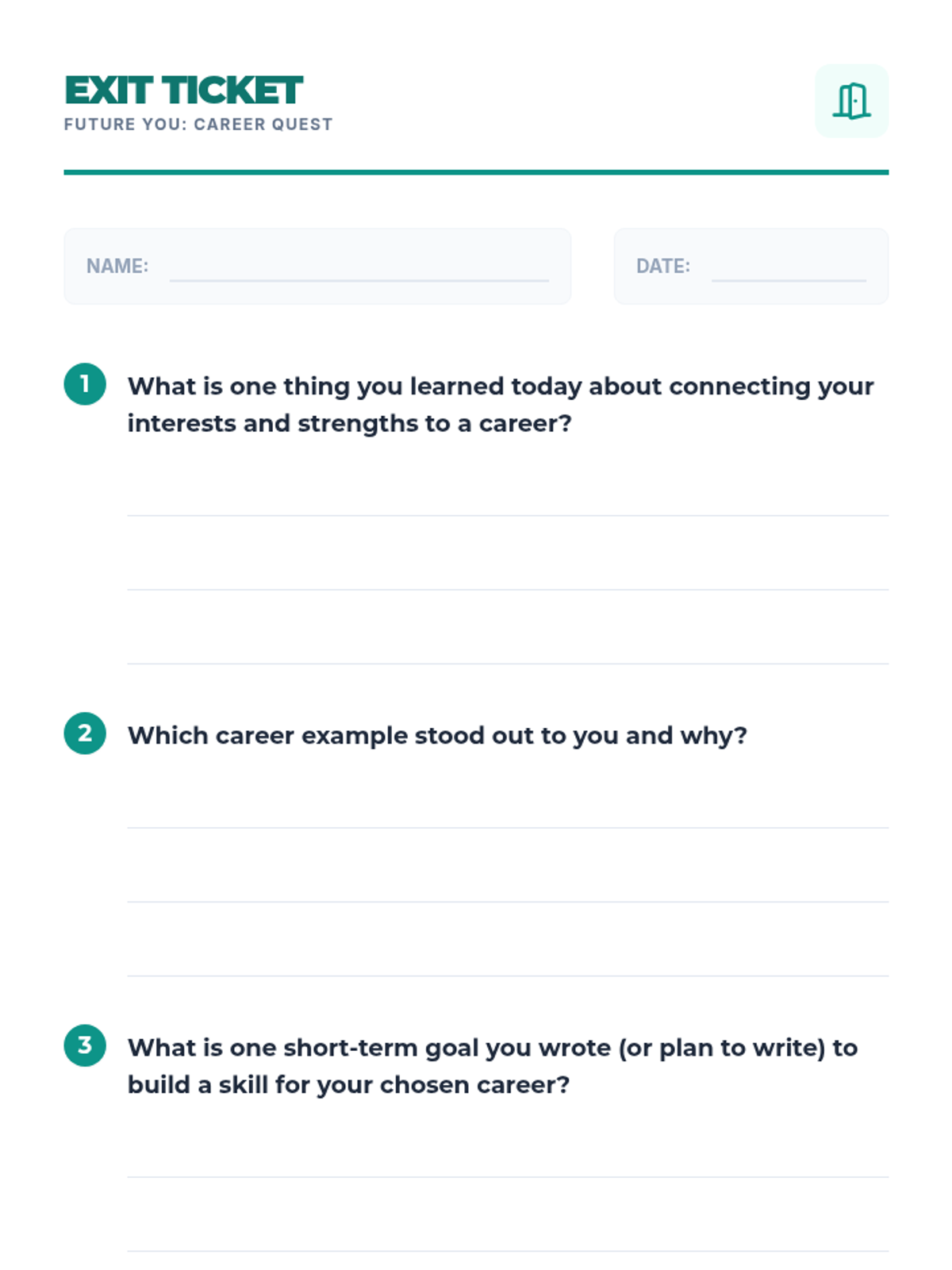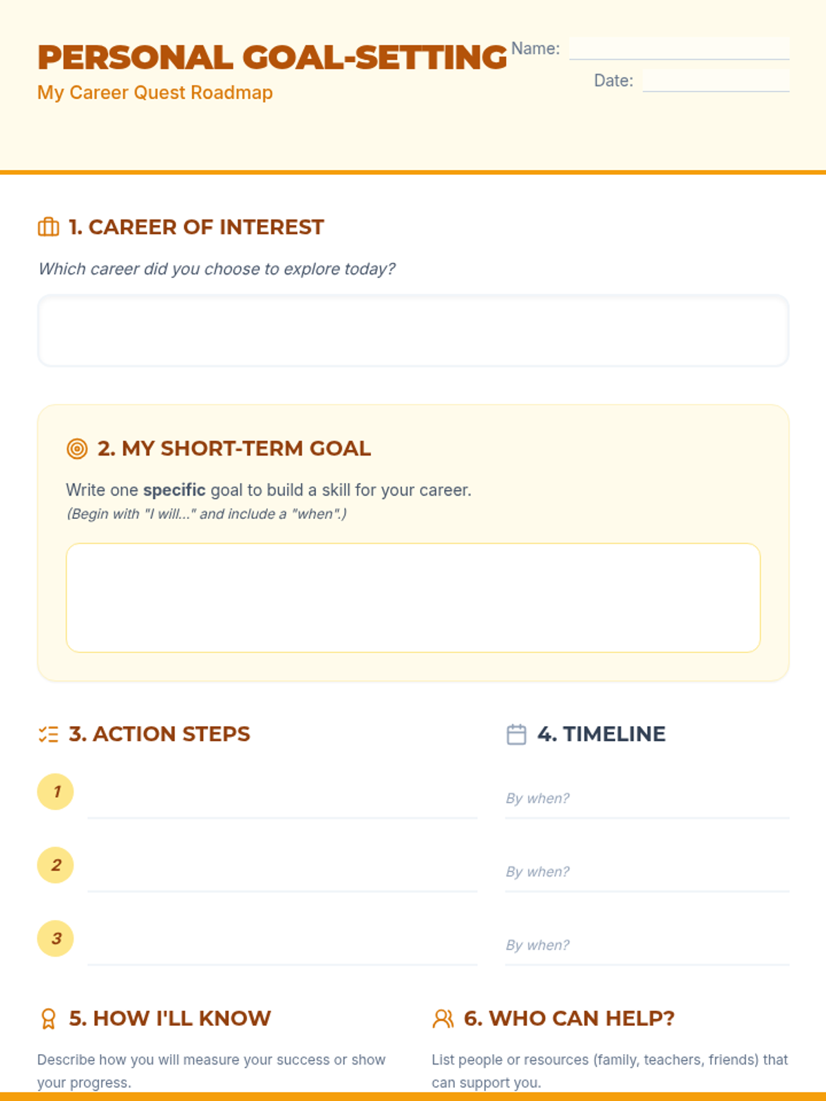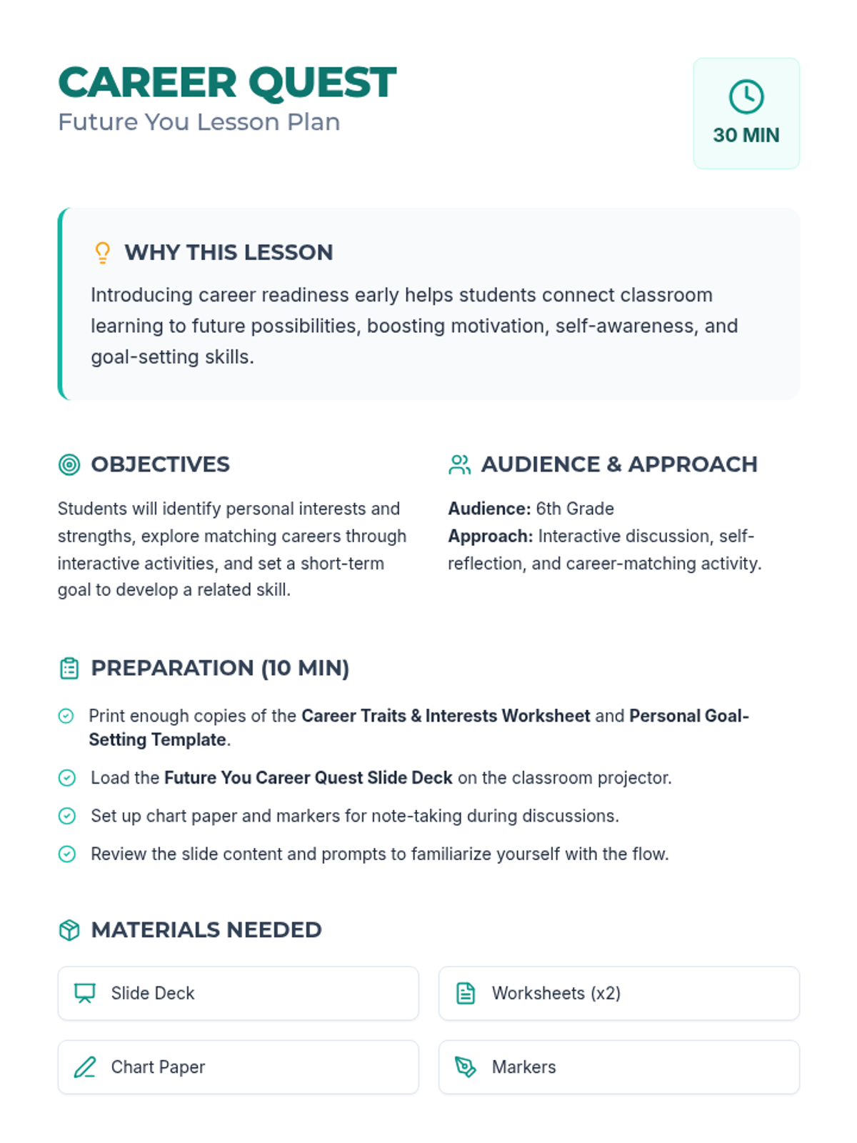 A 30-minute 6th-grade lesson where students explore careers by connecting their personal interests and strengths to future jobs and setting growth goals.