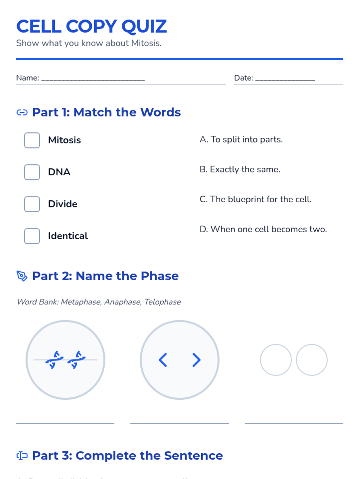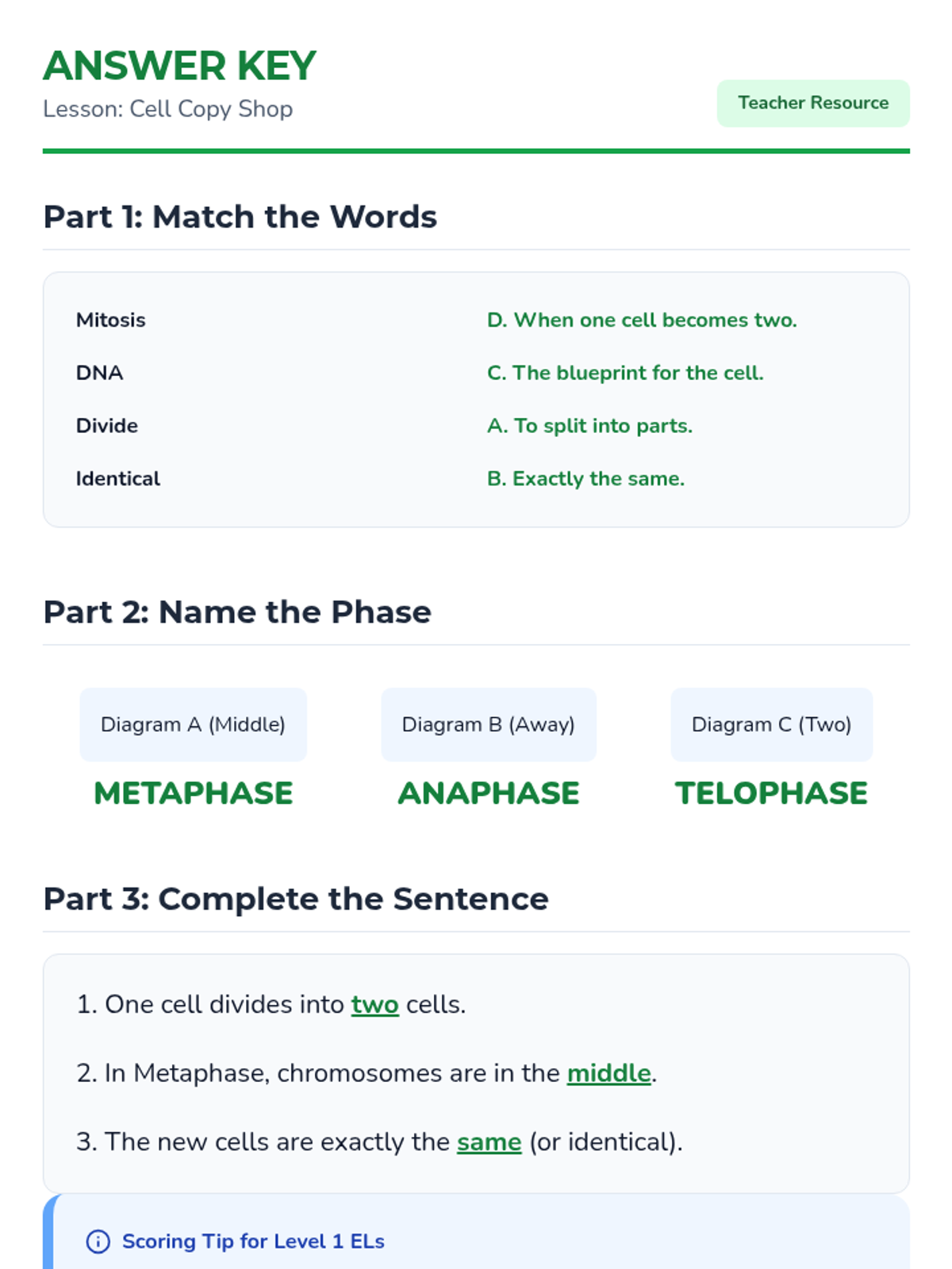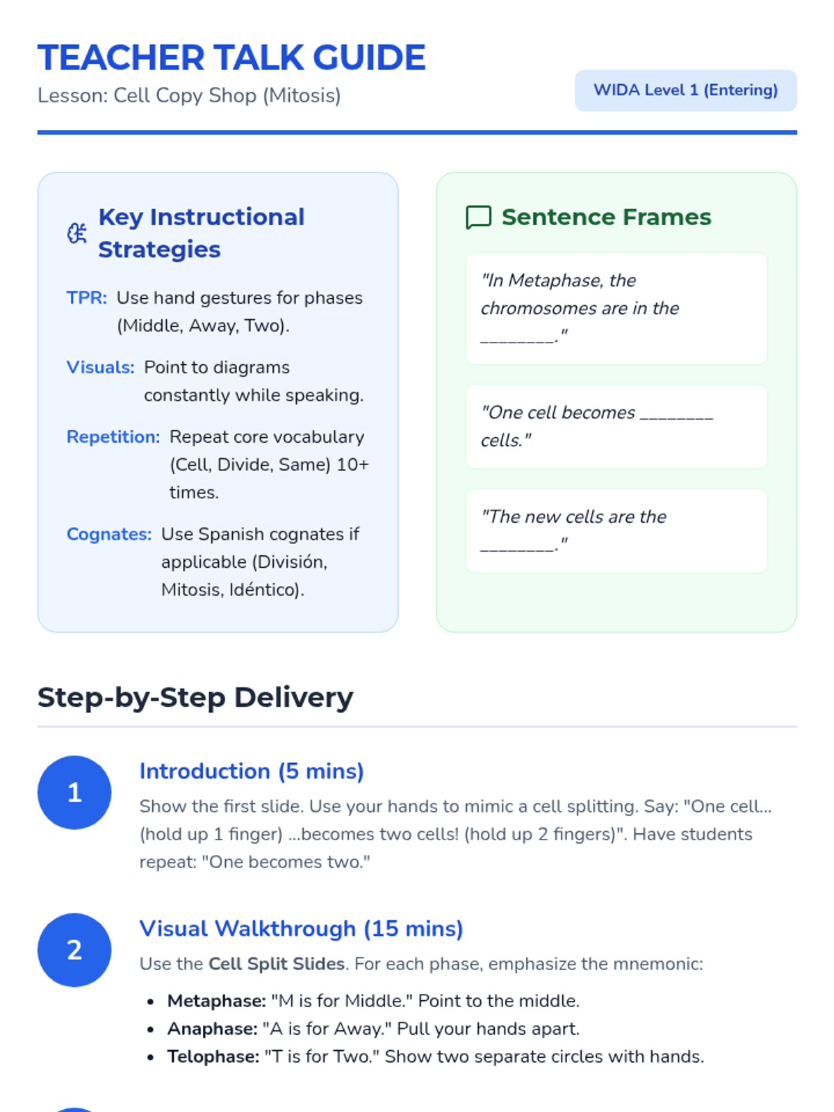 A highly visual lesson designed for WIDA Level 1 ELs, focusing on the phases of mitosis and the process of cell division using simplified language and clear diagrams.