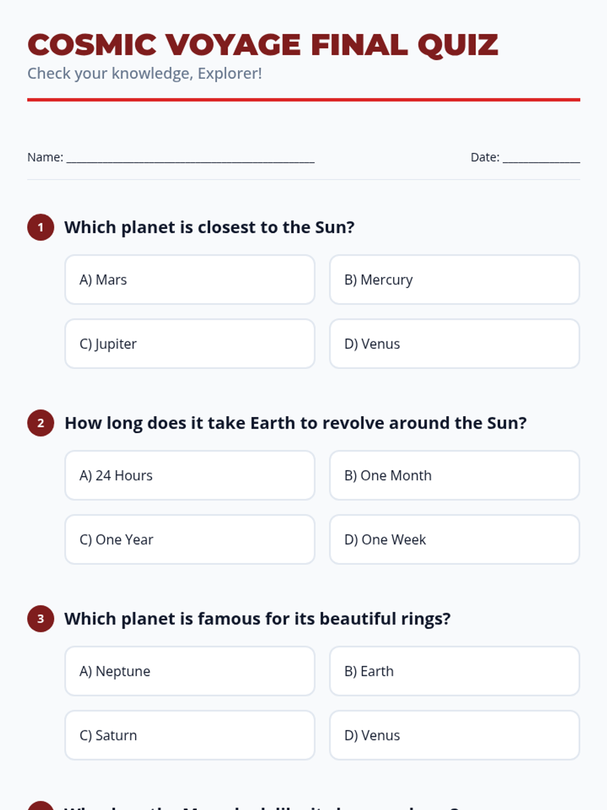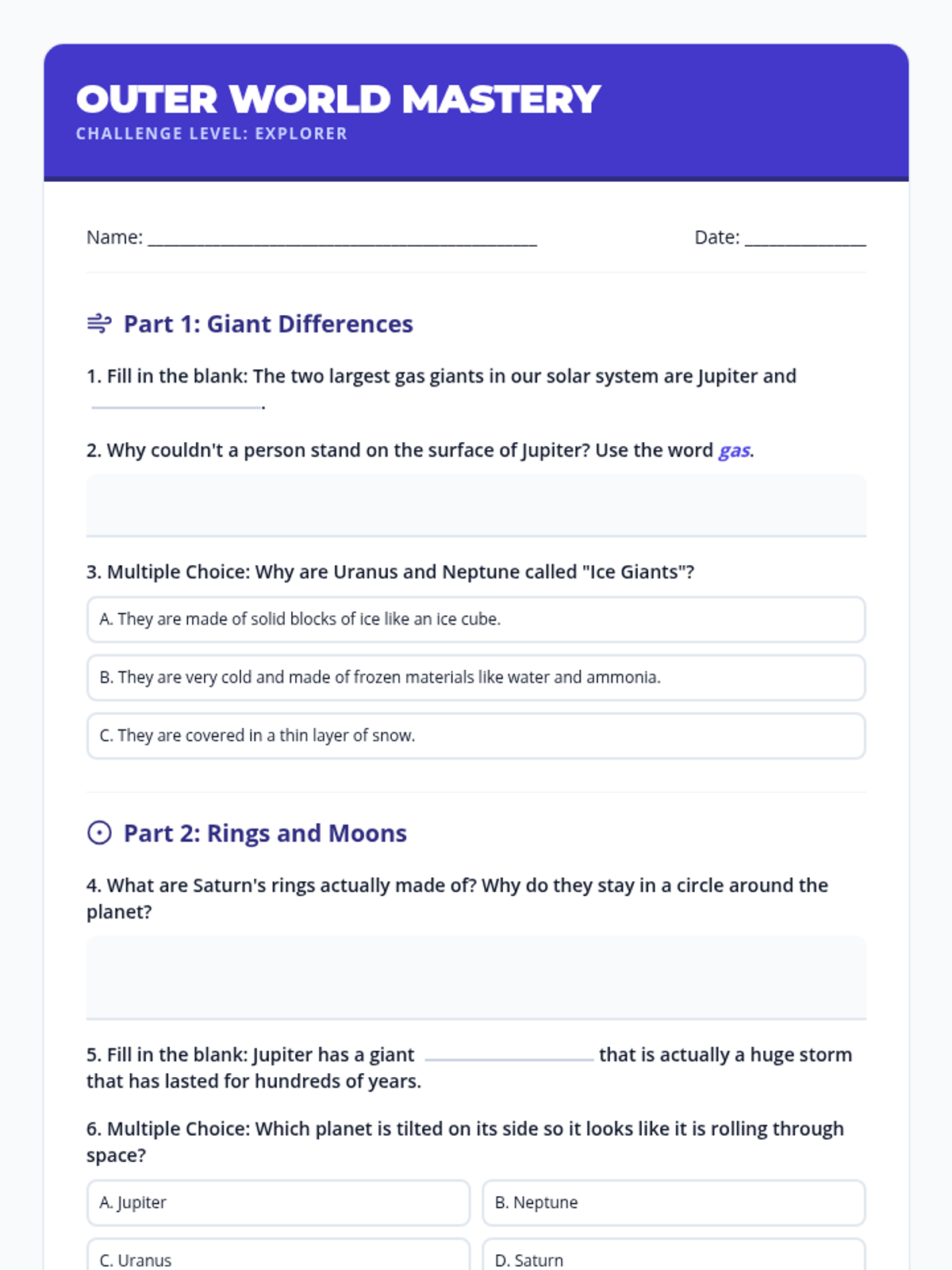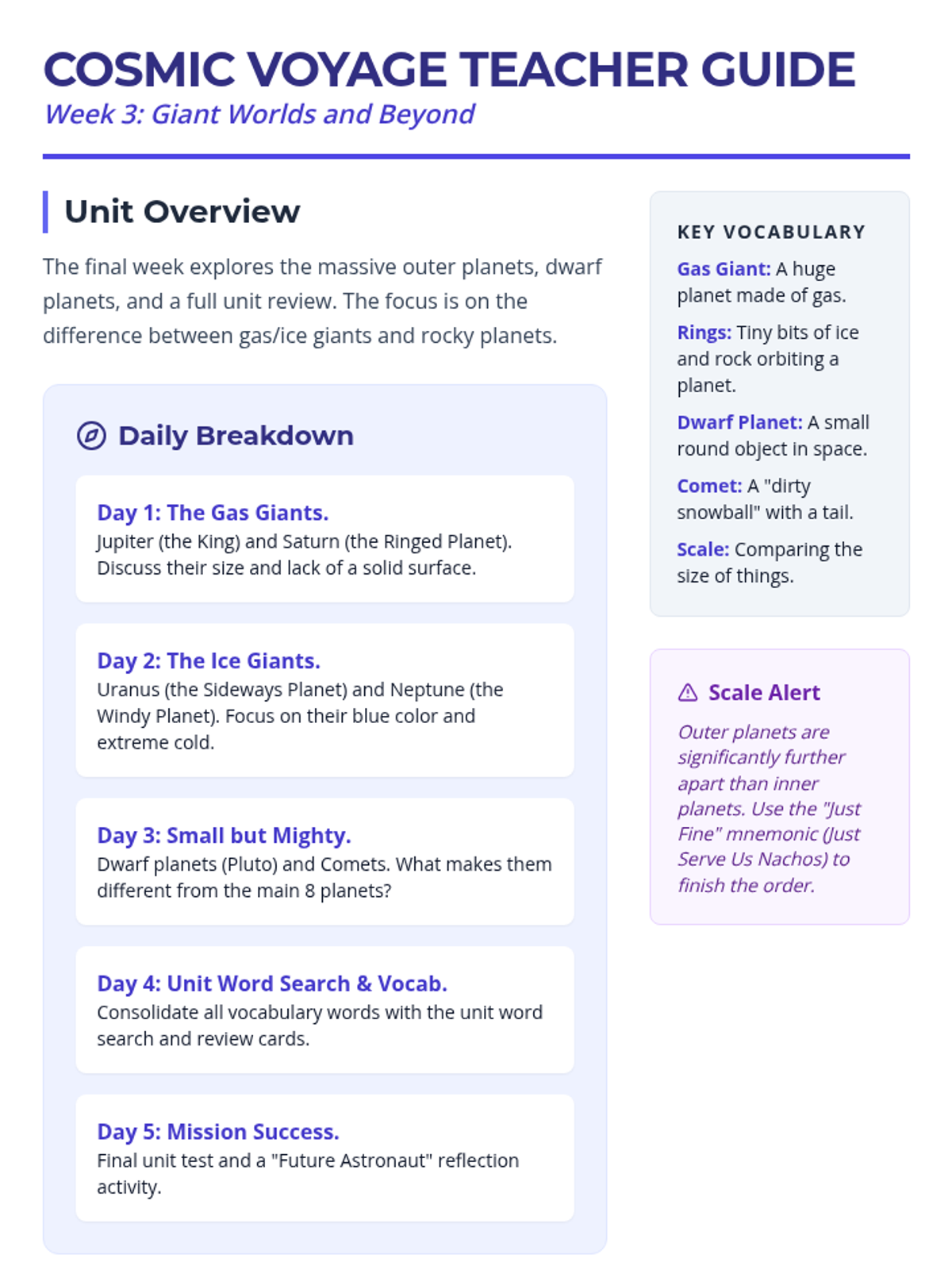 Covers the four gas and ice giants (Jupiter, Saturn, Uranus, and Neptune), along with dwarf planets and a final unit review.