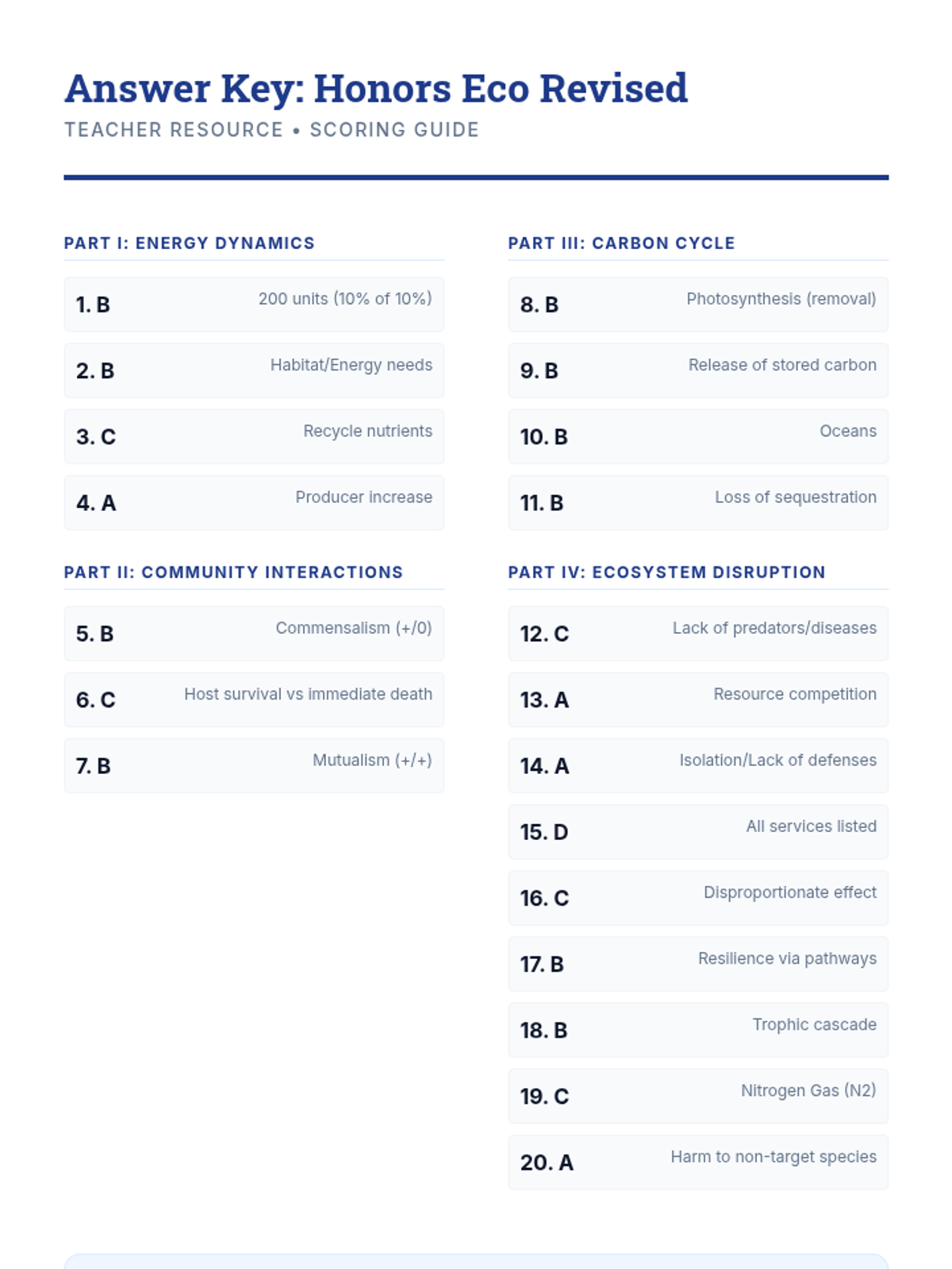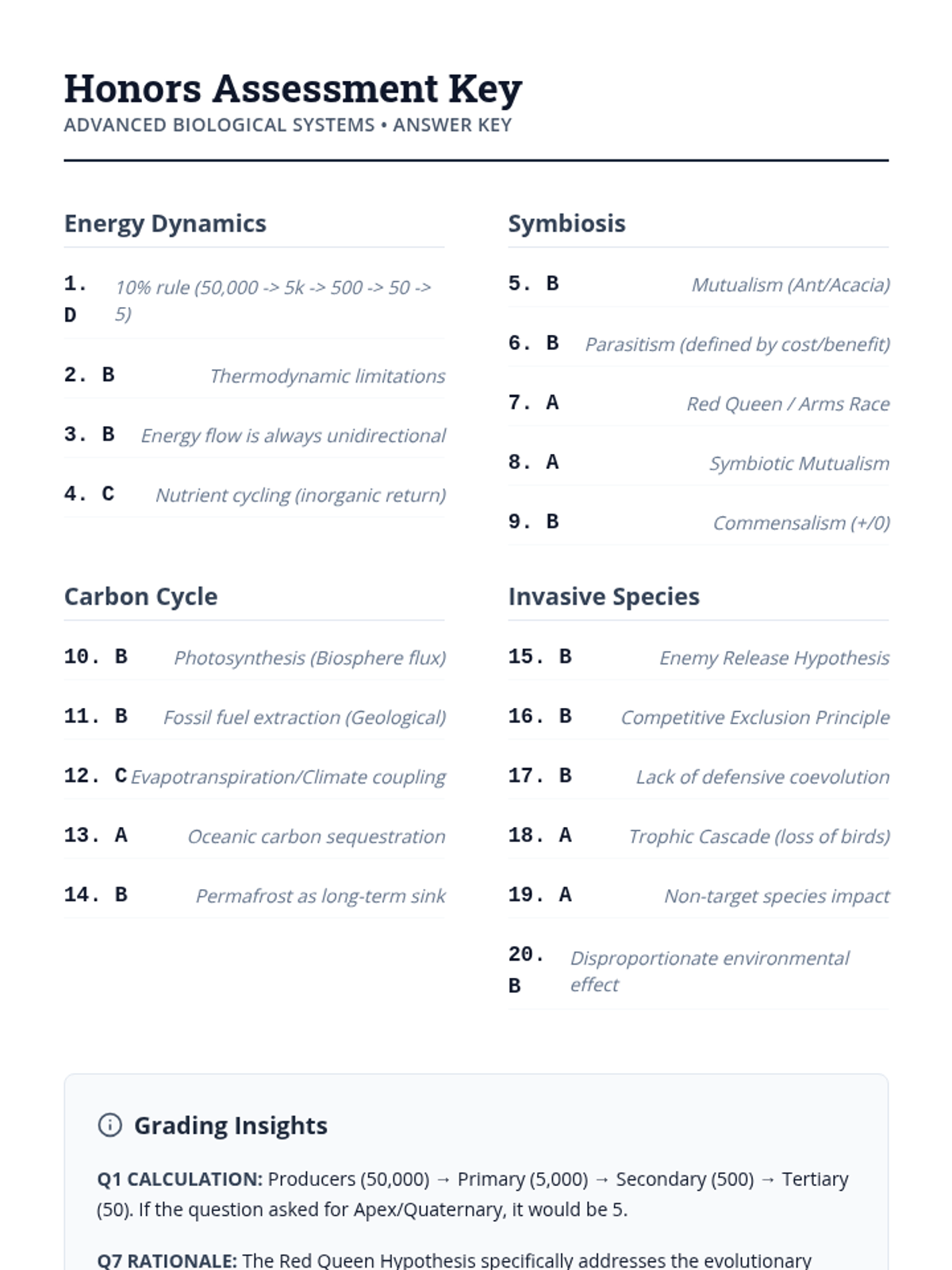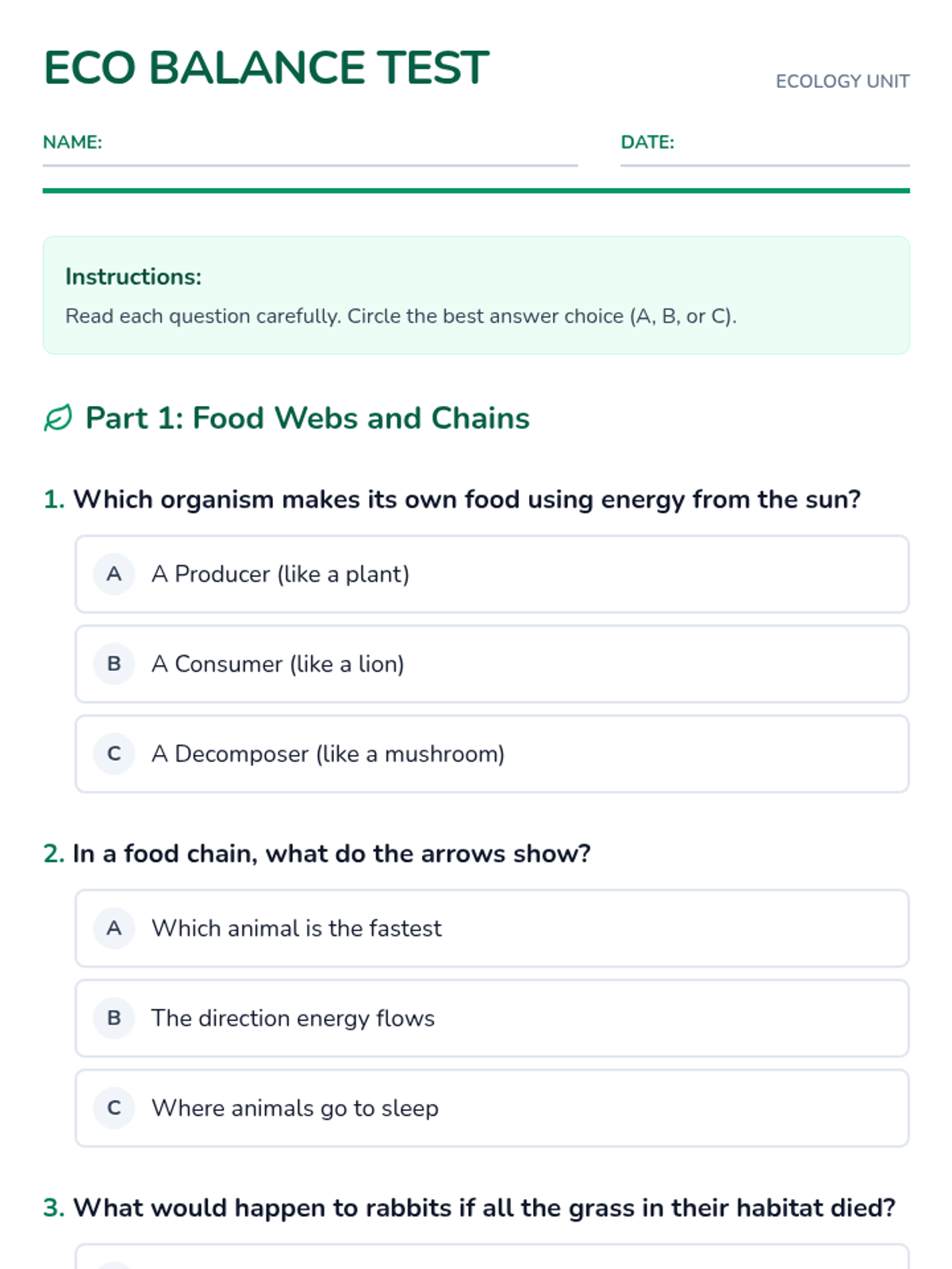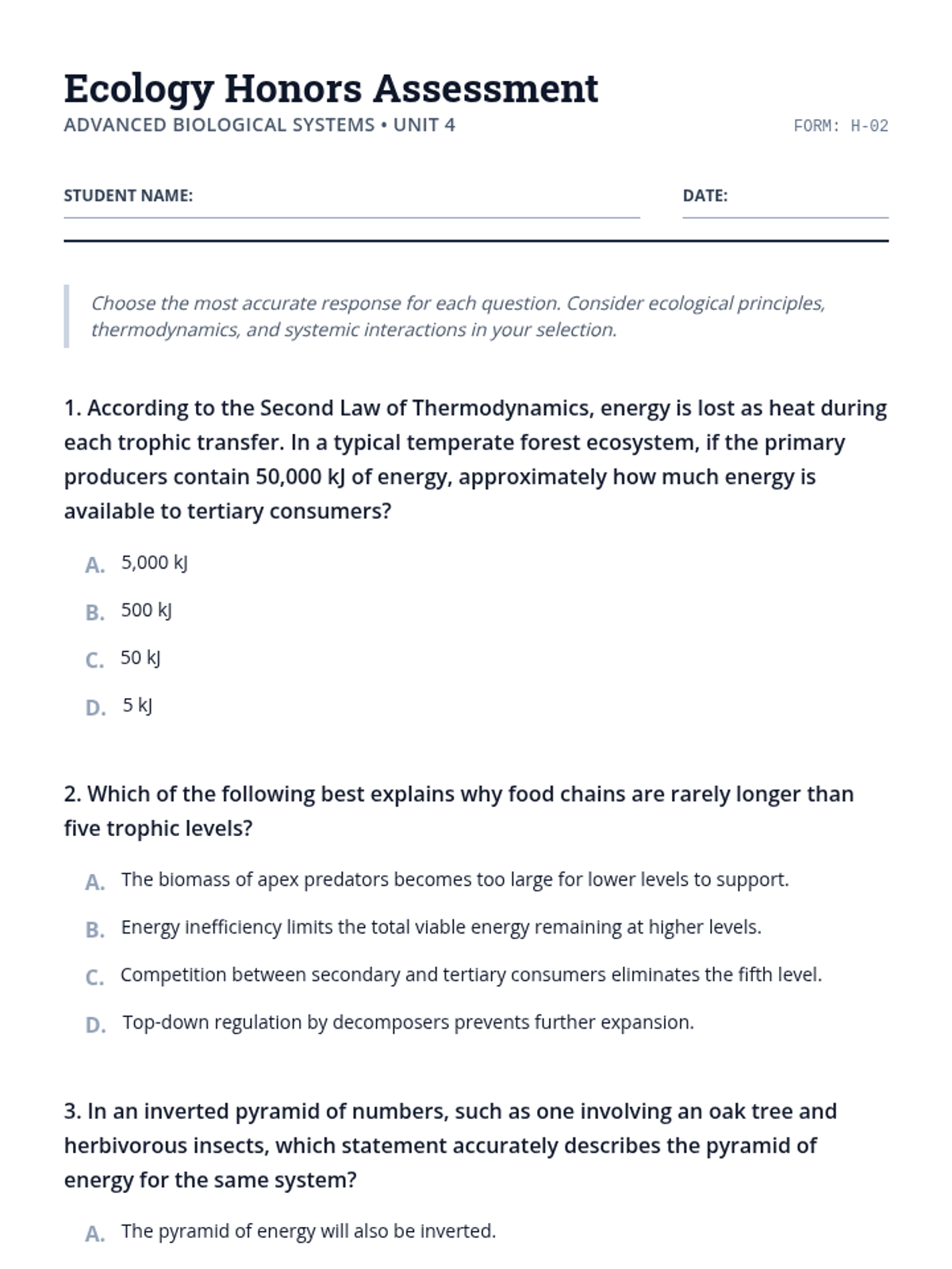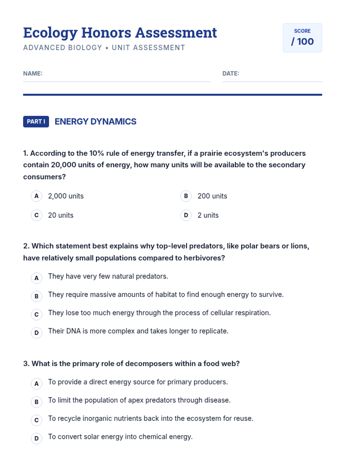 An assessment-focused lesson covering essential ecology concepts including energy flow, relationships between organisms, and human impact on ecosystems.
