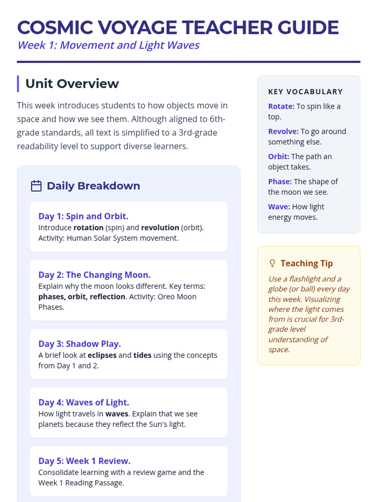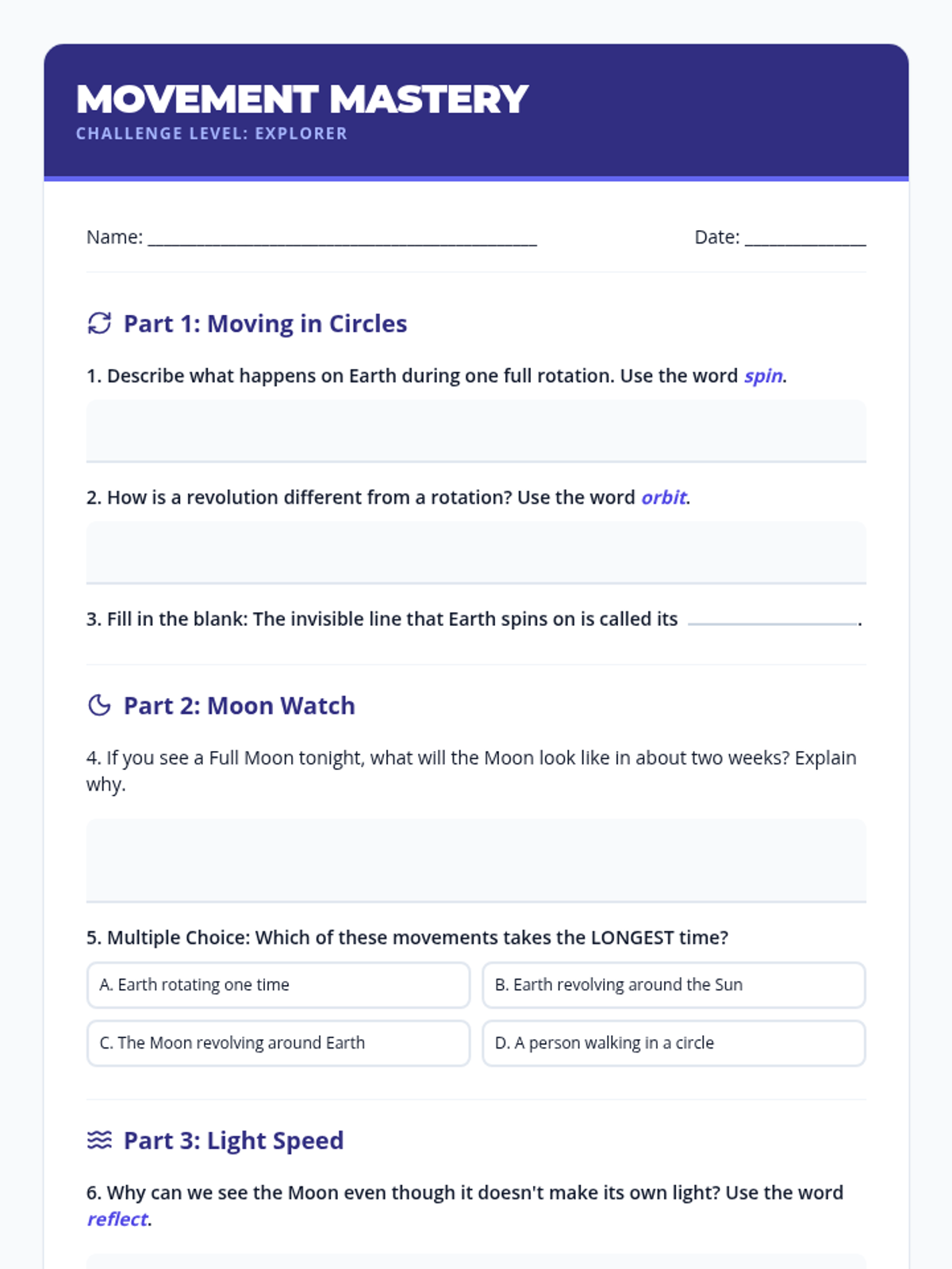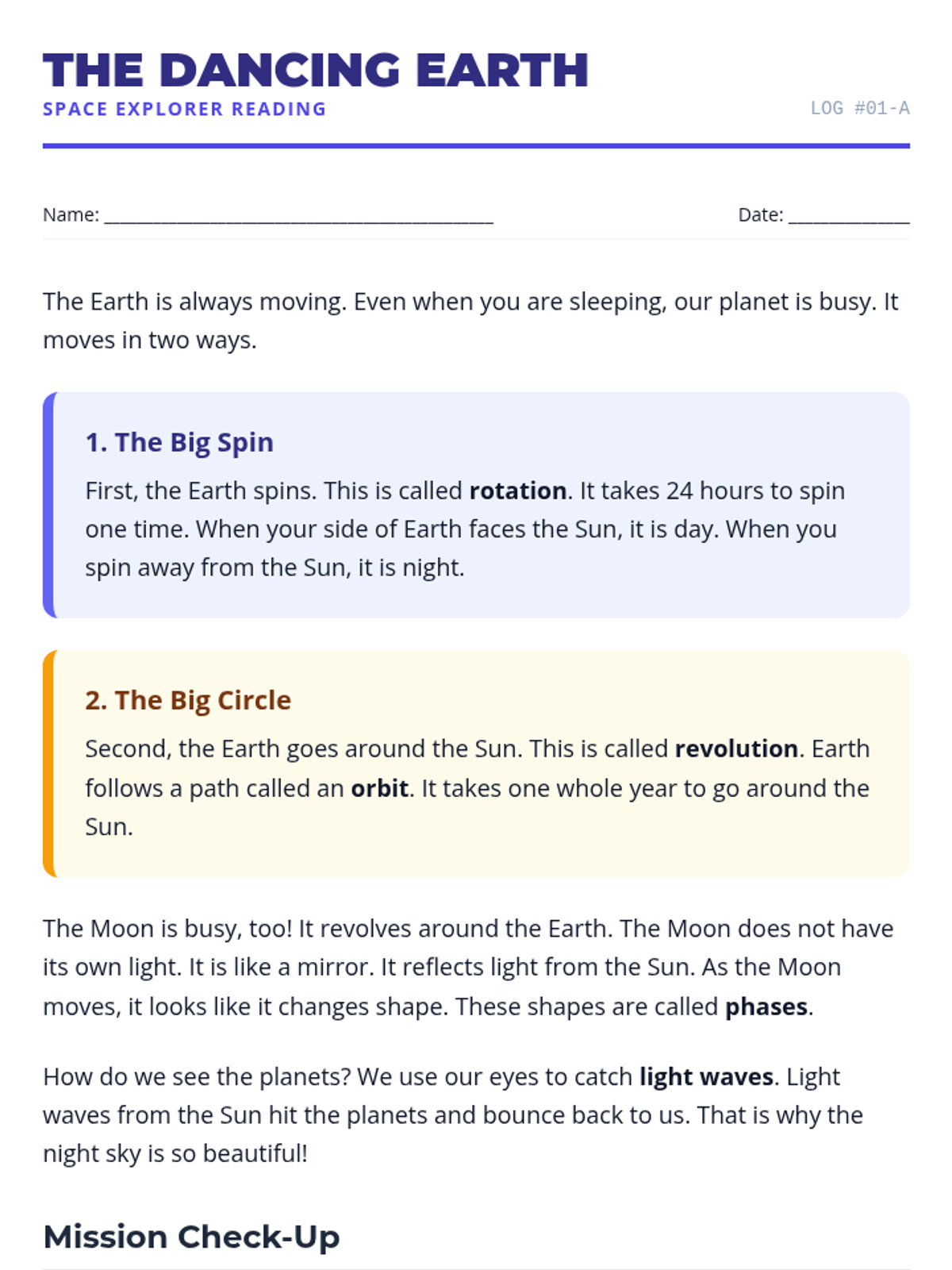 Focuses on the basic movements of Earth (rotation vs. revolution), the phases of the moon, and the basics of light waves as they relate to space exploration.