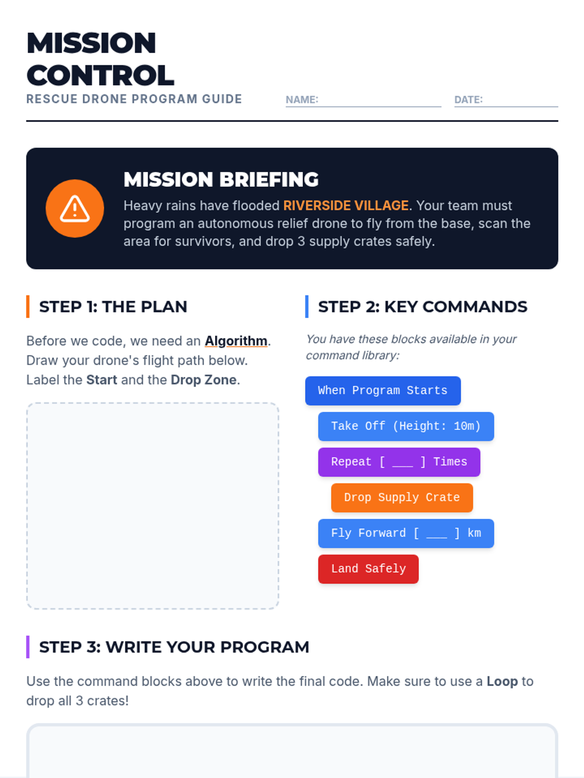 Exploring programming logic through loops and creating a project guide for a drone delivery program.