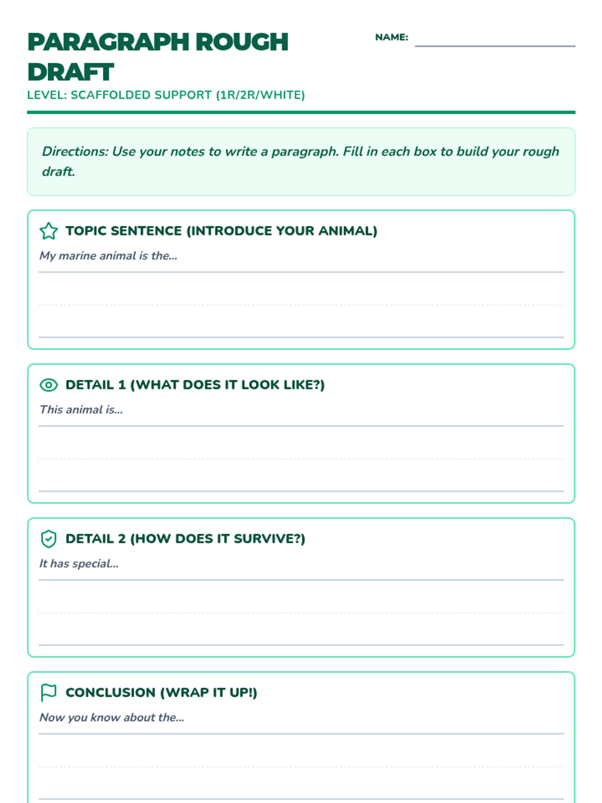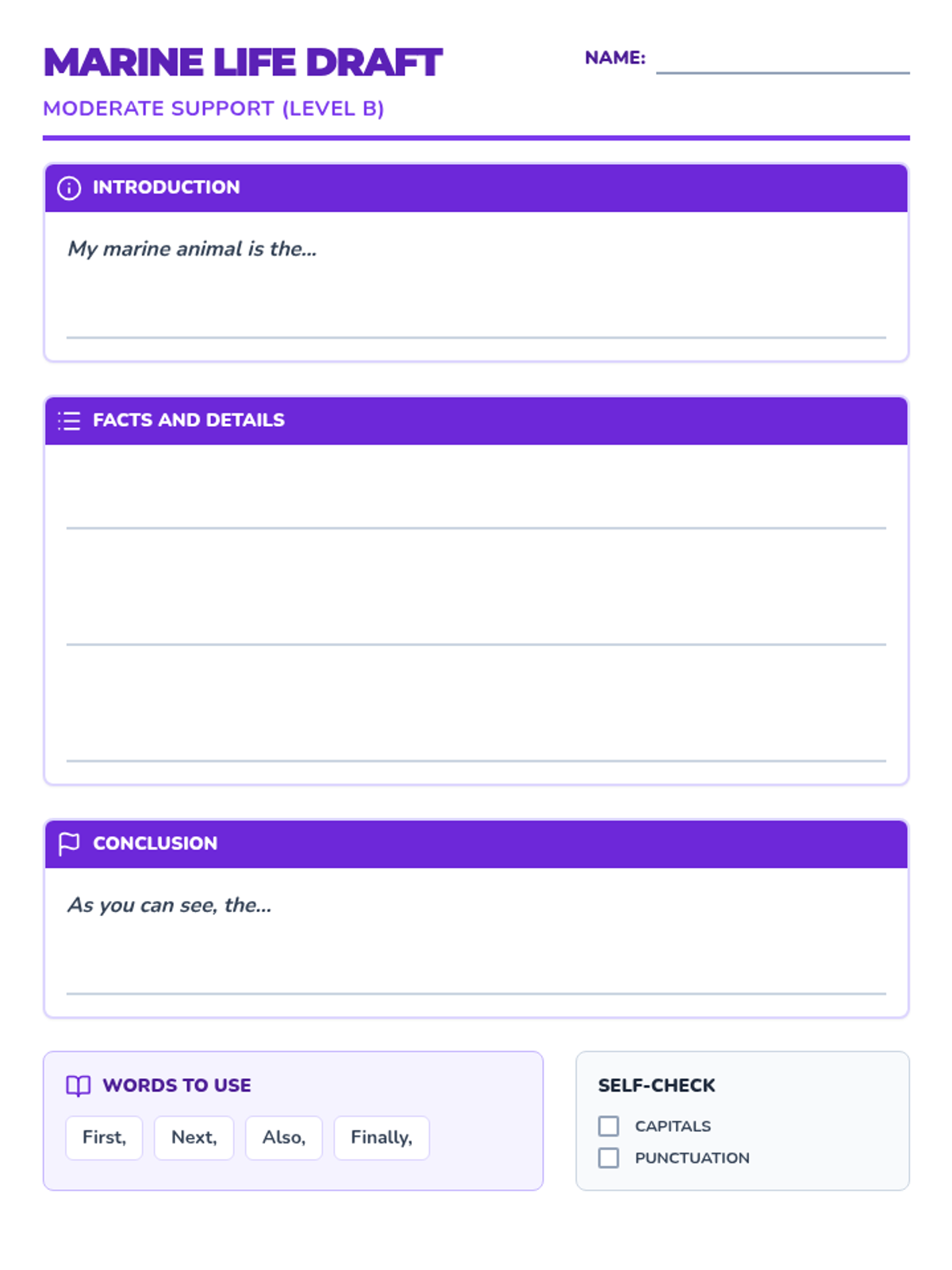A research unit focused on the physical characteristics and adaptations of marine animals, designed for K-1 learners to build scientific observation and writing skills.