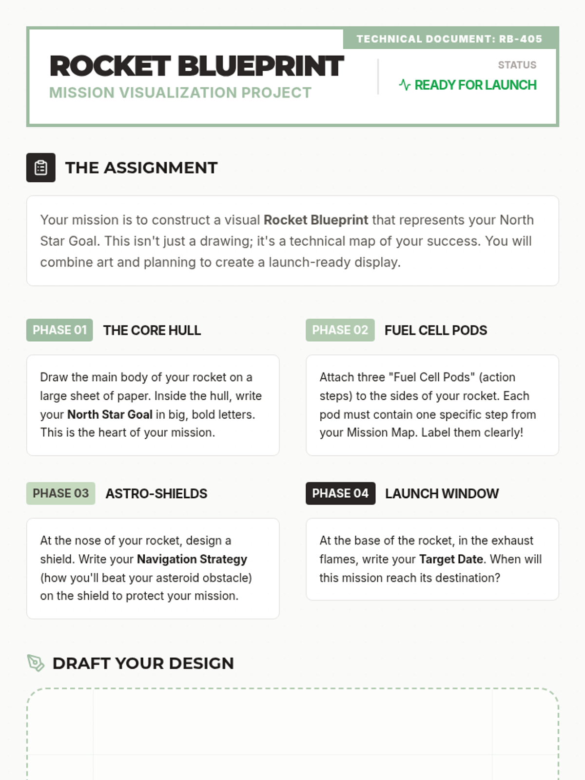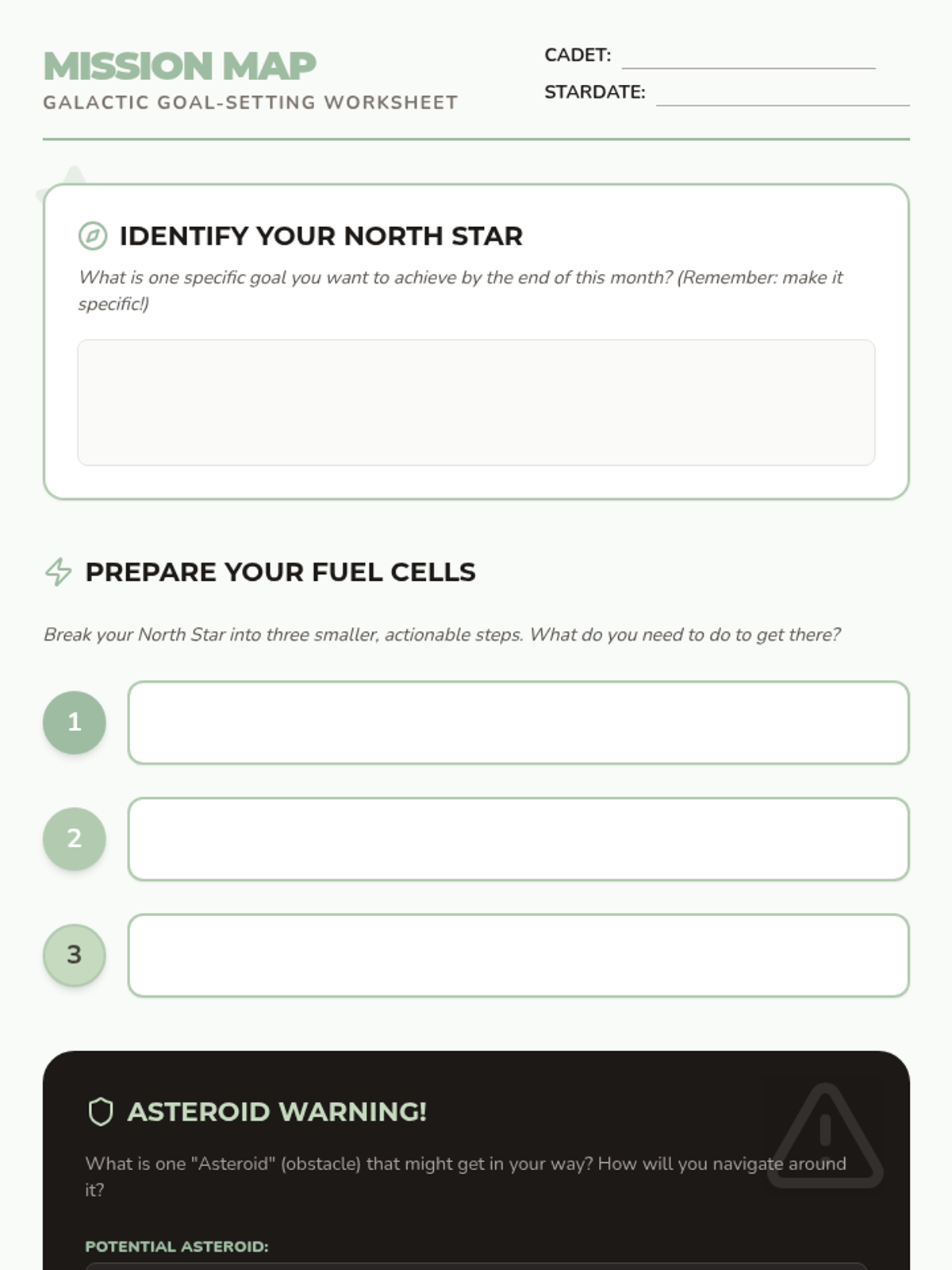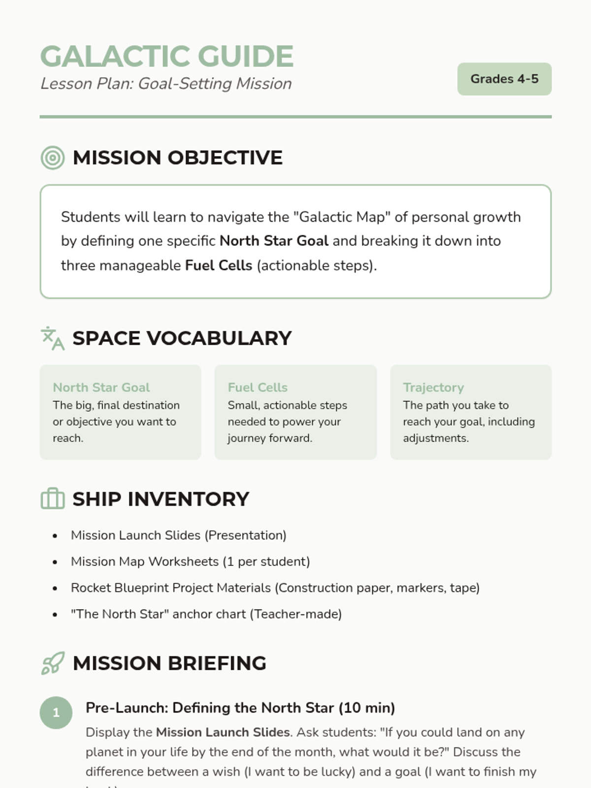 A comprehensive lesson on goal-setting using a space exploration theme. Students define their 'North Star' goals, break them into 'Fuel Cells' (actionable steps), and prepare for a 'Galactic Mission' of personal growth.