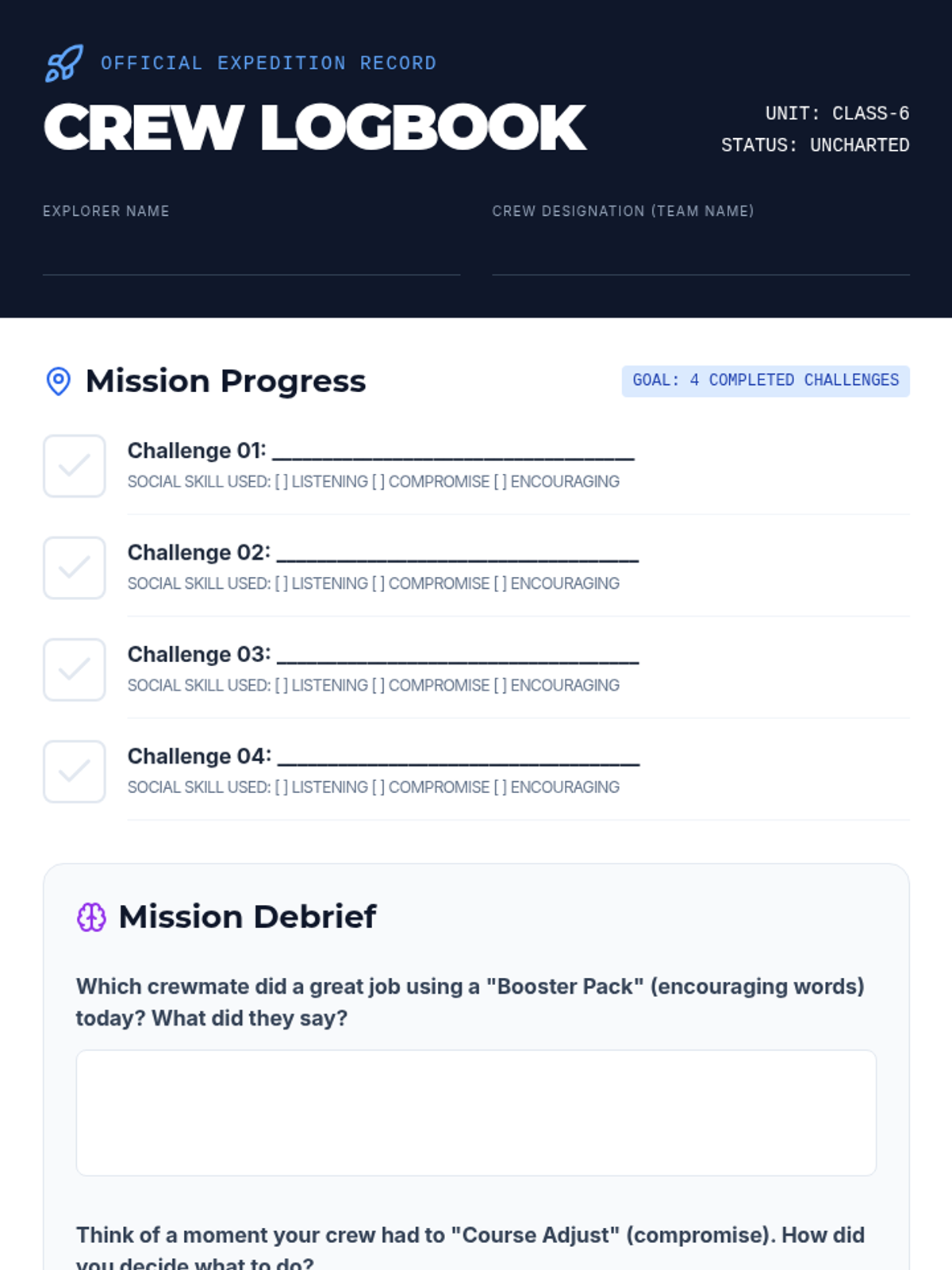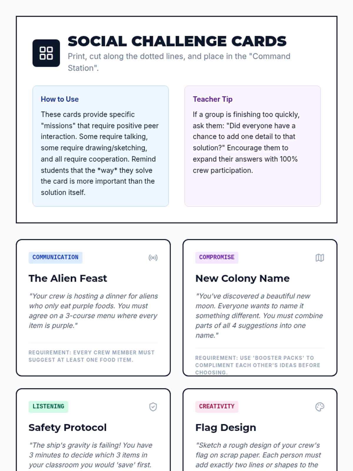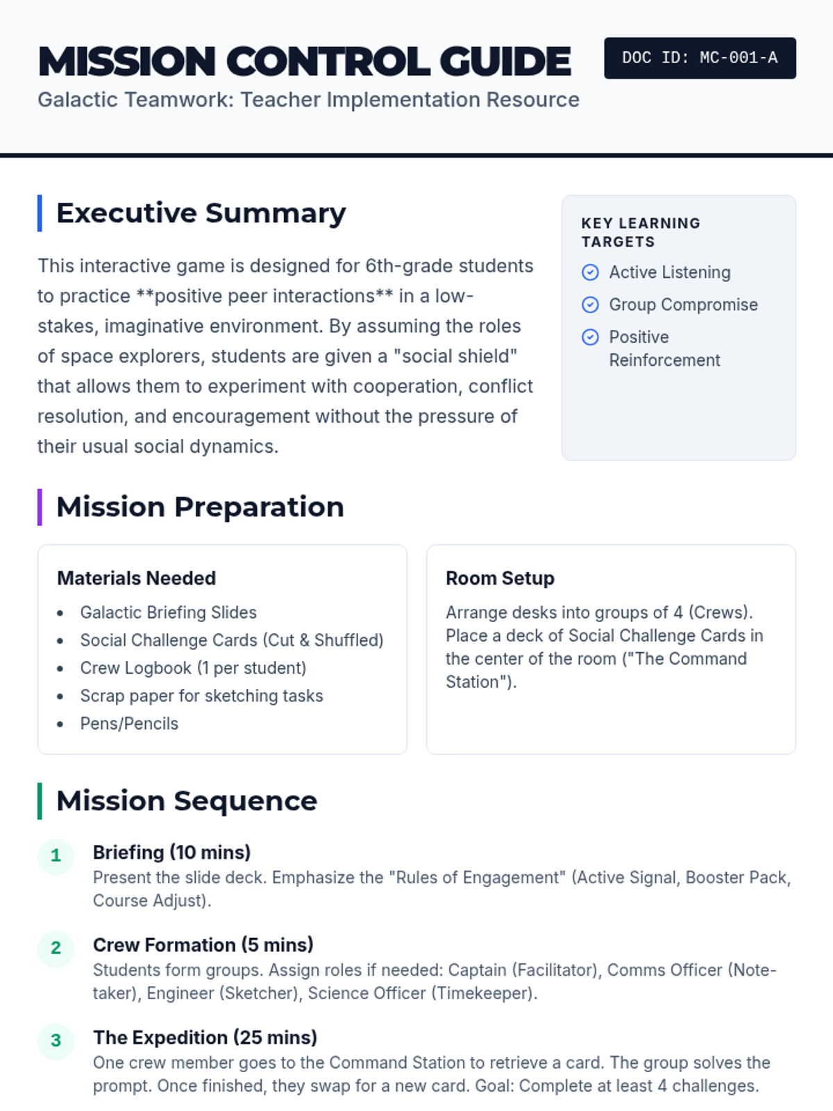 A collaborative, space-themed interactive experience designed to help 6th-grade students practice and refine positive peer interaction skills, including active listening, encouragement, and compromise.