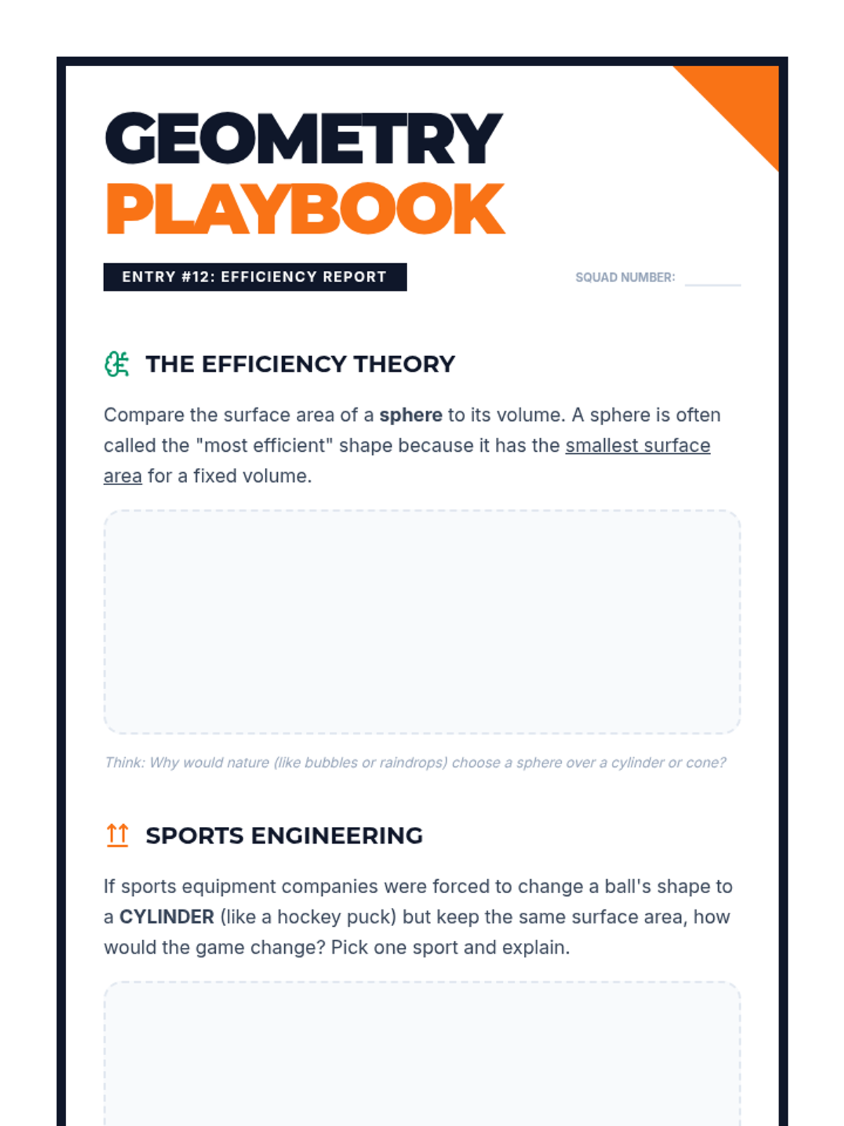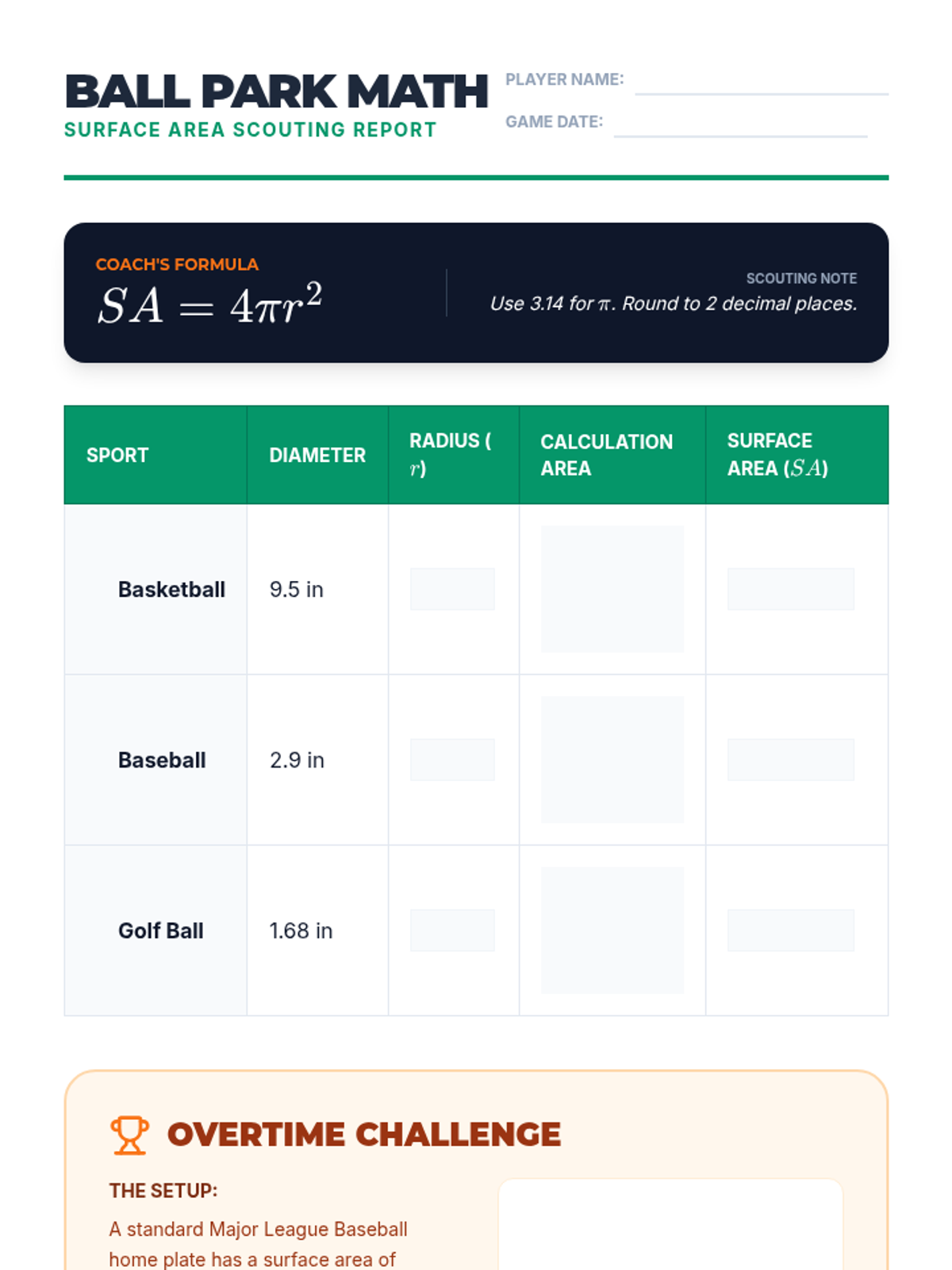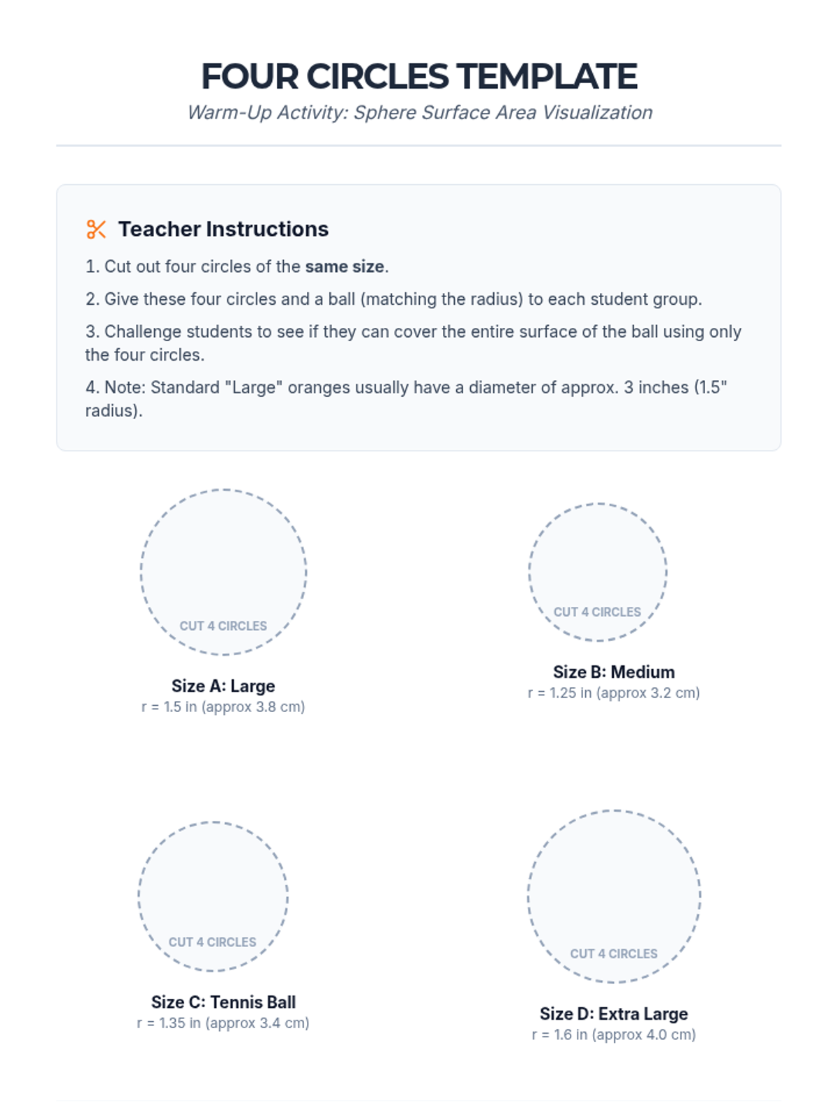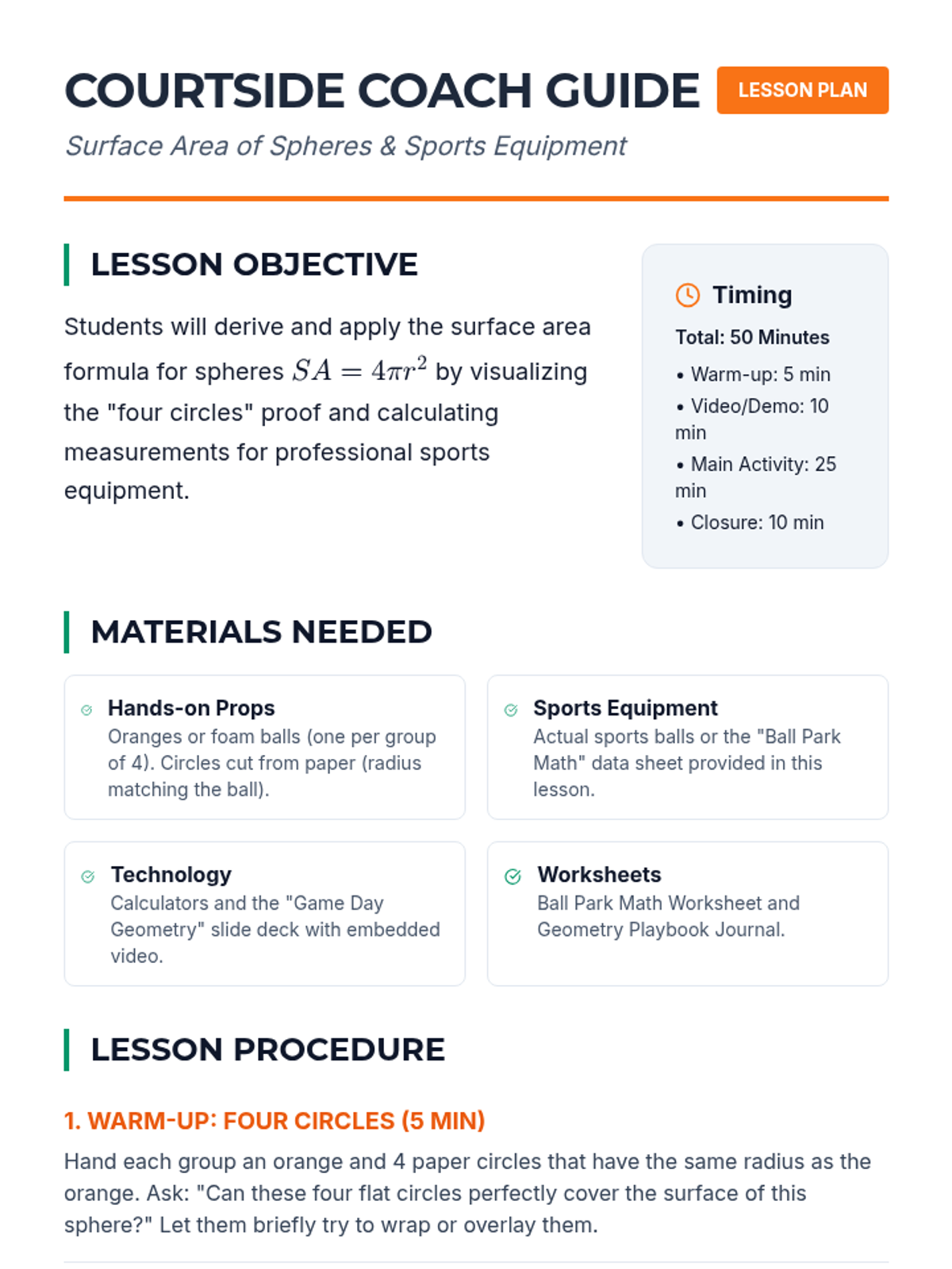 Students explore the surface area of spheres through a hands-on 'Four Circles' demonstration and by calculating the surface area of real-world sports equipment like basketballs and golf balls.