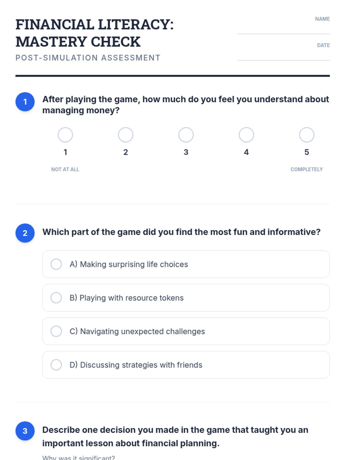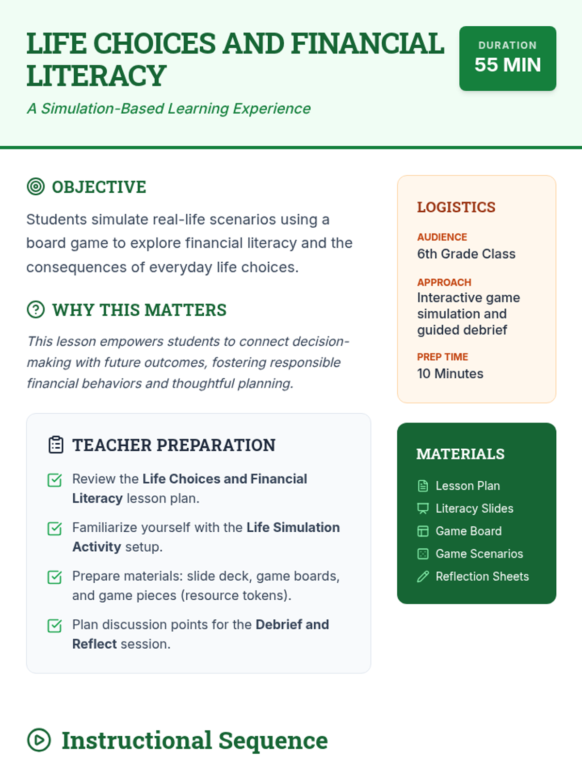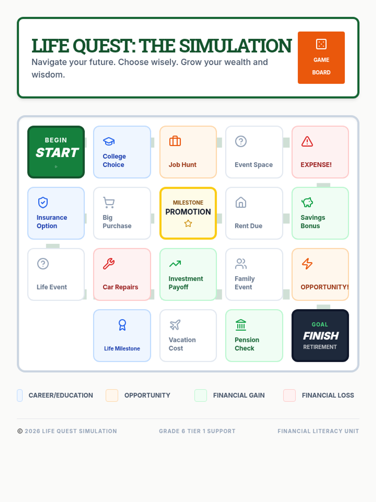 Students simulate real-life scenarios using a board game to explore financial literacy and the consequences of everyday life choices. Designed for 6th grade, this lesson connects decision-making with future financial outcomes through interactive play and guided reflection.